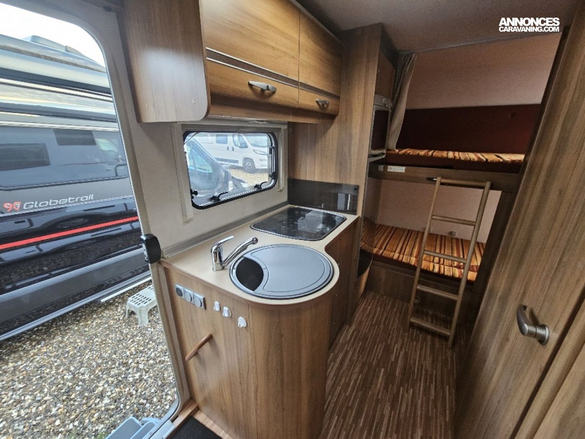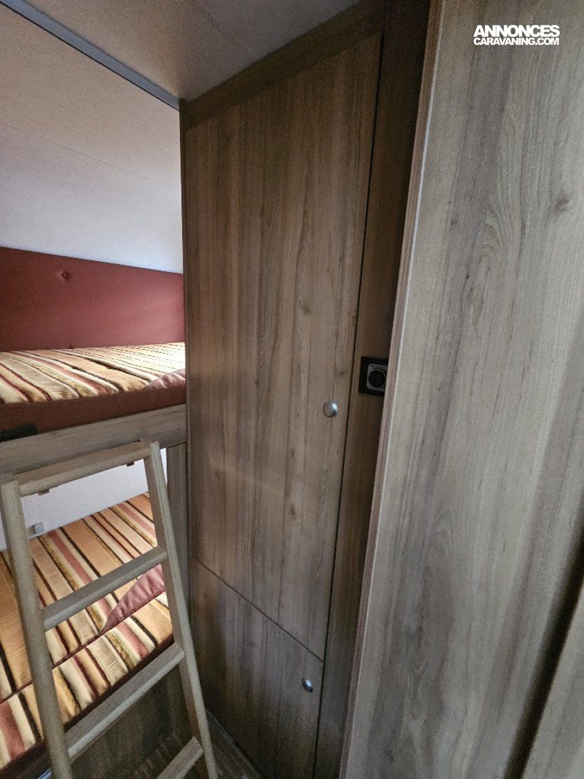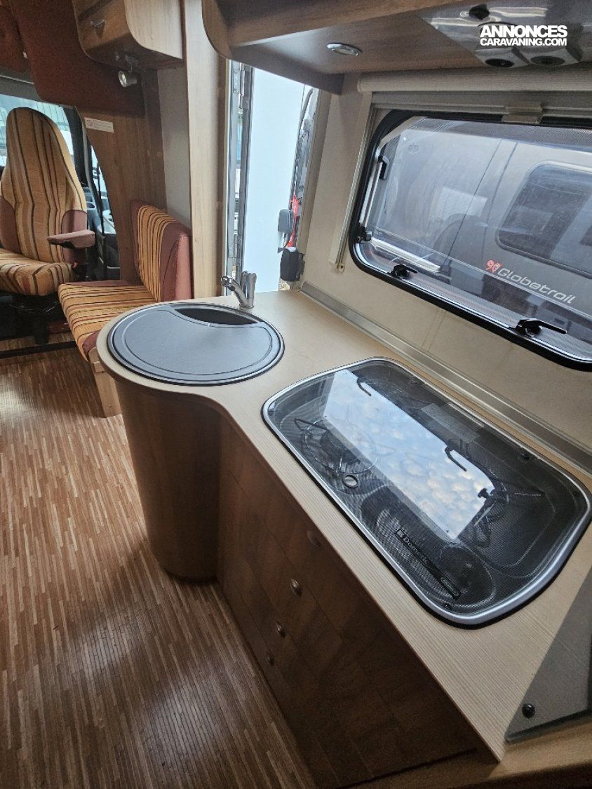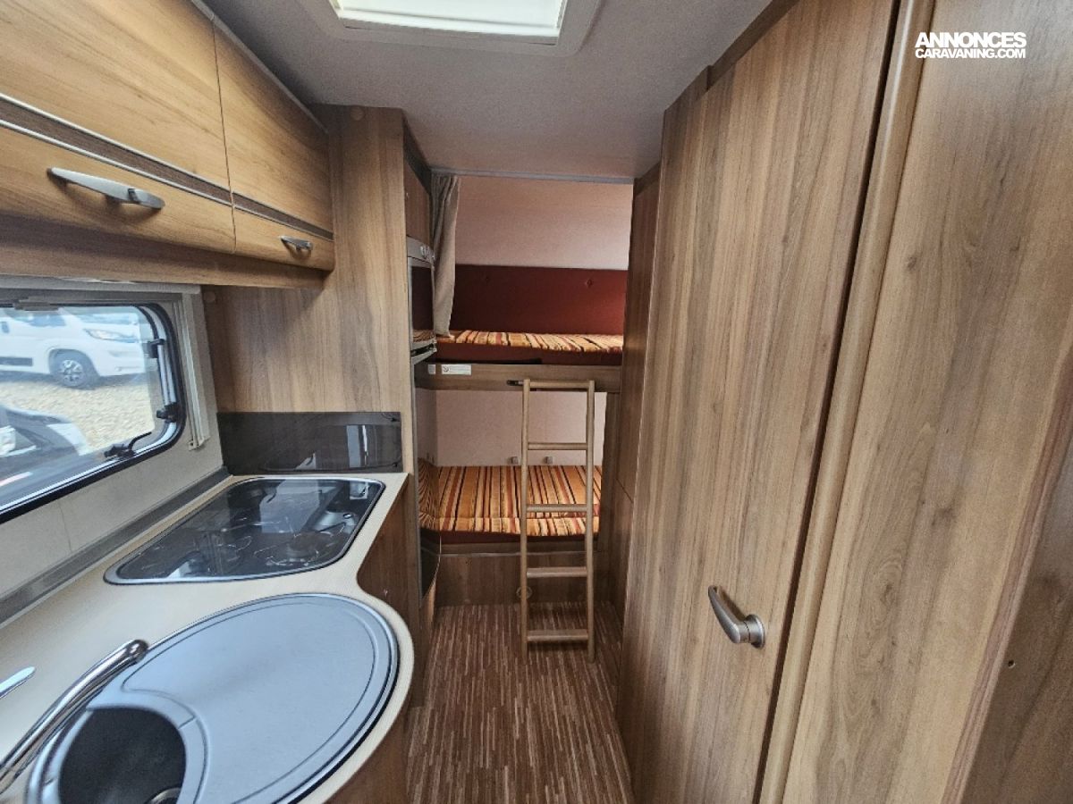 Capucine familiale comprenant des lits superposés à l’arrière, une salle d’eau avec douche et WC, une cuisine avec de nombreux rangements, un salon avant panoramique et un grand couchage 2 personnes au-dessus de la cabine.