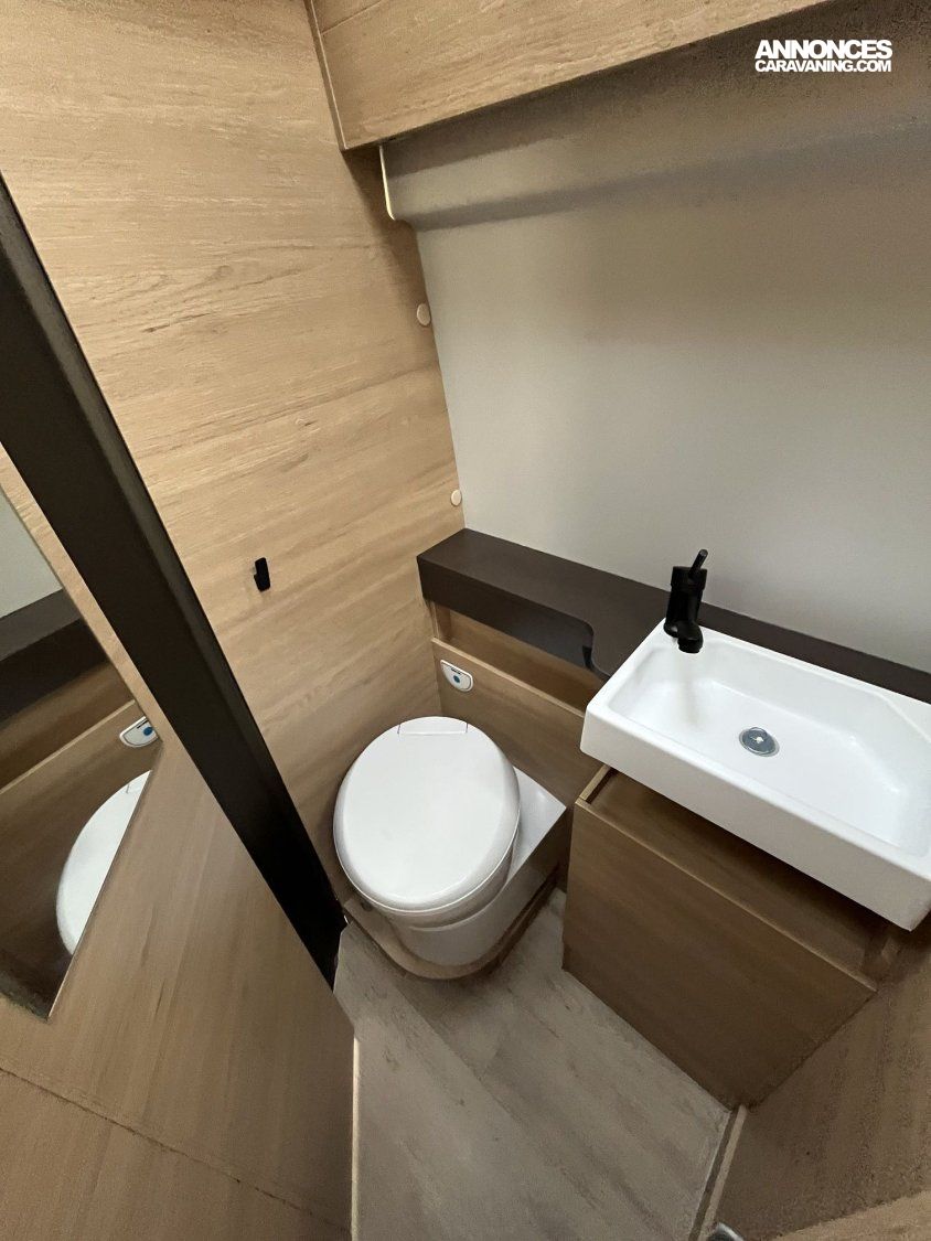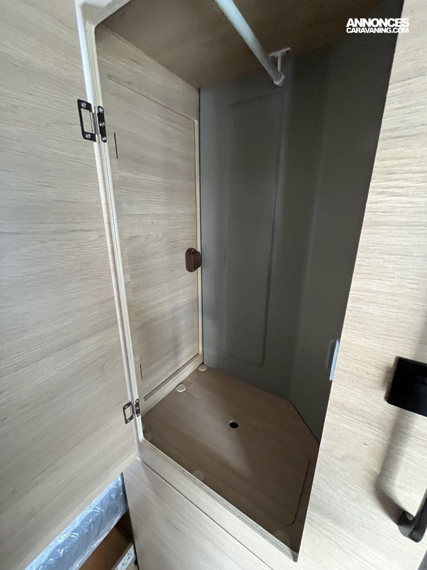 Douche indépendante, Lit arrière transversal, lit pavillon, Salon avant sièges pivotants, WC Cassette.