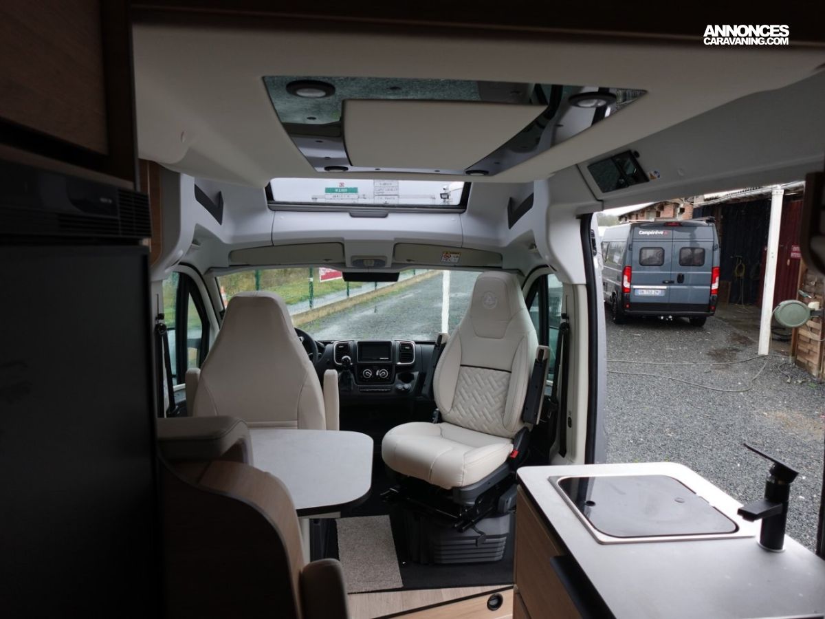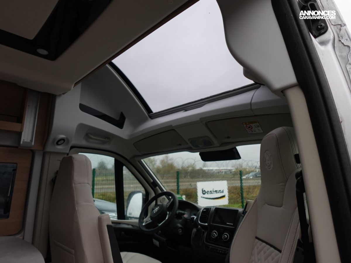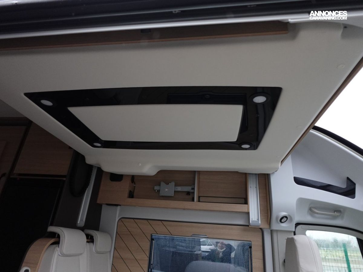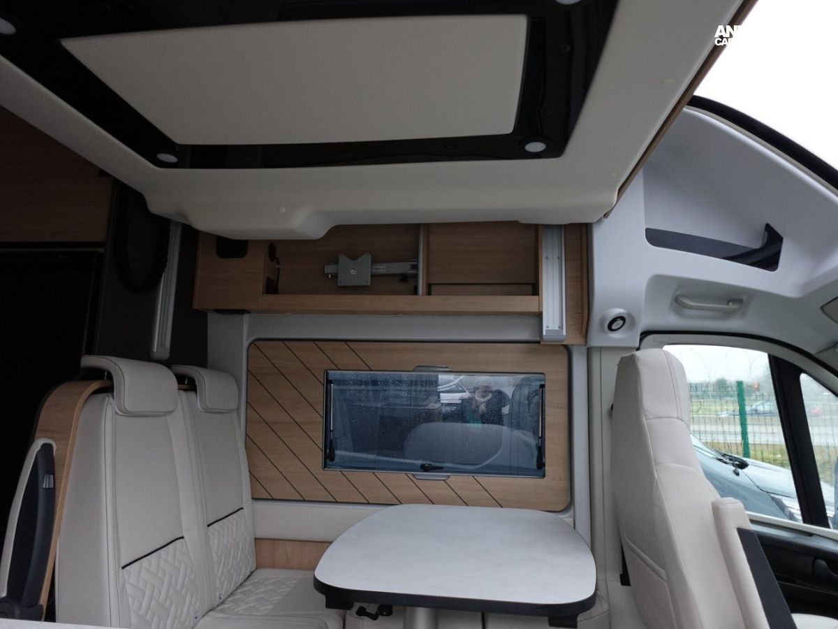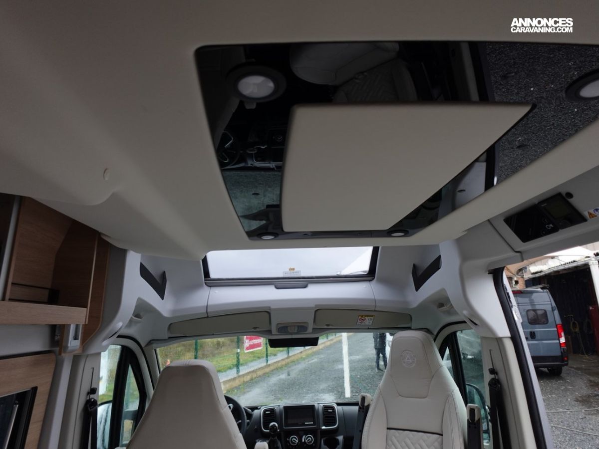 (Ambiance mobilier au choix, Sellerie au choix, Truma Combi 4 DIESEL avec kit altitude et commande de chauffage CP PLUS, 2ème batterie cellule AGM, Jantes 16 pouces en alliage léger, Volant cuir, Habillage gris sur aérateurs, TPMS, Feux avant 100 % LED, Allumage automatique des feux et des essuie-glaces, Frein de stationnement électrique, Pare-chocs avant couleur carrosserie, Skid plate noire, Feux anti-brouillard, Peinture métallisée Gris Artense, Toit panoramique SKYVIEW, Renfort pneumatiques suspension essieu arrière, Panneau solaire 150 W, Déco Saphir, Prise gaz extérieure)