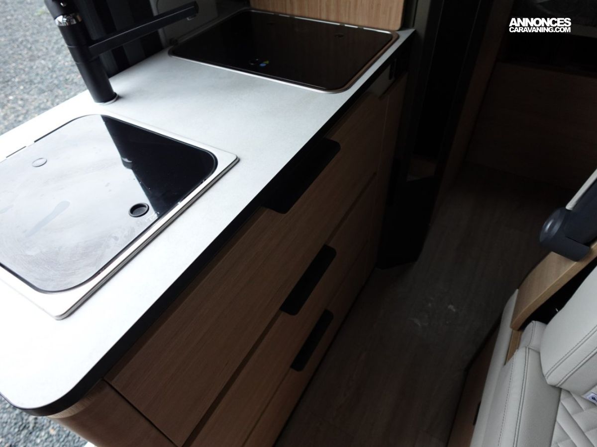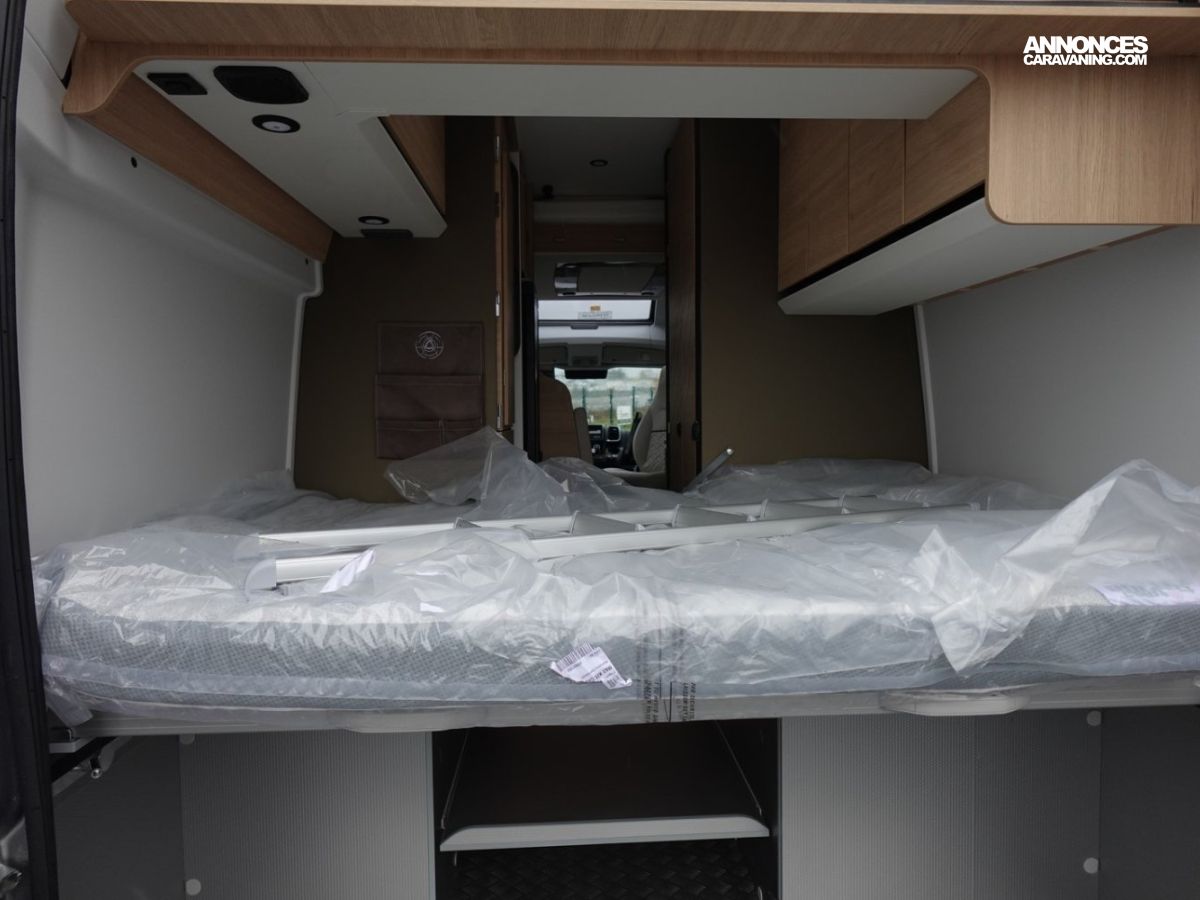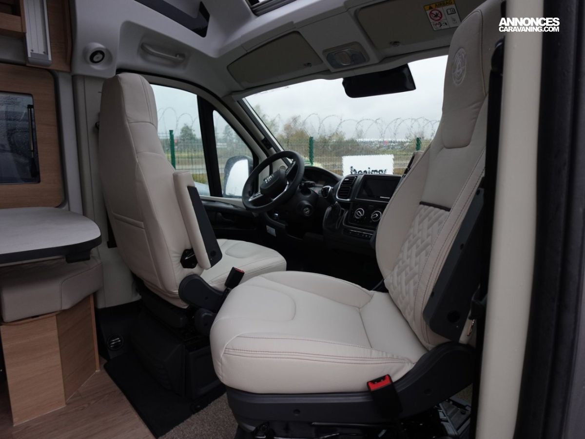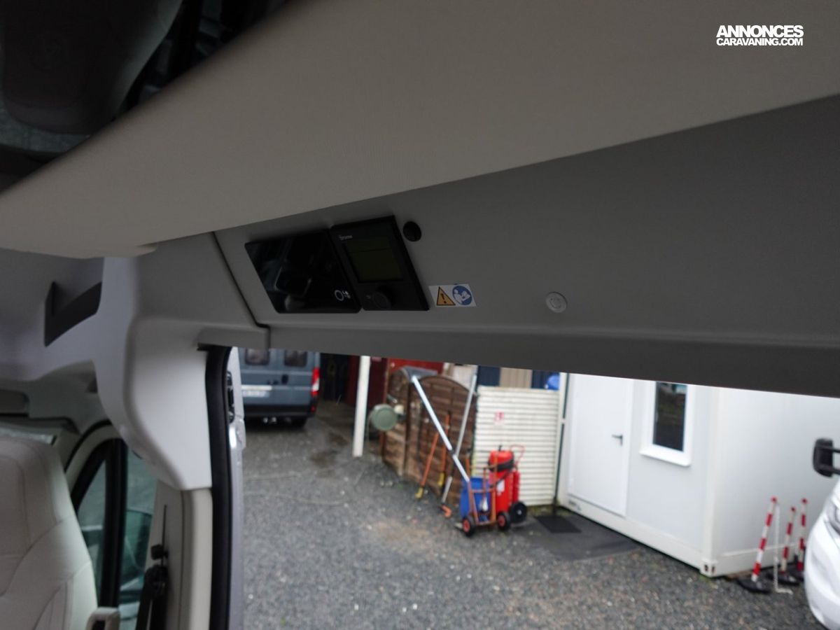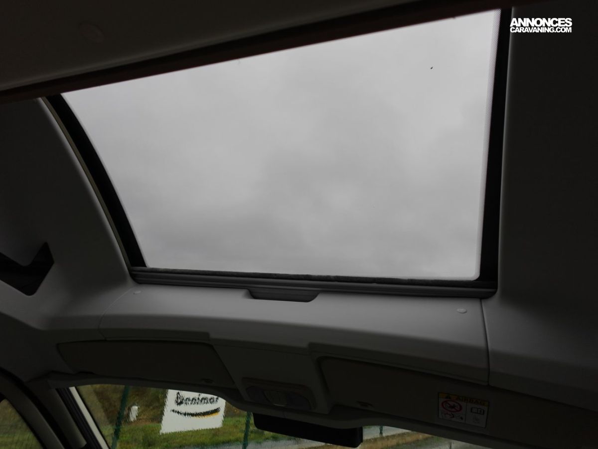 (Ambiance mobilier au choix, Sellerie au choix, Truma Combi 4 DIESEL avec kit altitude et commande de chauffage CP PLUS, 2ème batterie cellule AGM, Jantes 16 pouces en alliage léger, Volant cuir, Habillage gris sur aérateurs, TPMS, Feux avant 100 % LED, Allumage automatique des feux et des essuie-glaces, Frein de stationnement électrique, Pare-chocs avant couleur carrosserie, Skid plate noire, Feux anti-brouillard, Peinture métallisée Gris Artense, Toit panoramique SKYVIEW, Renfort pneumatiques suspension essieu arrière, Panneau solaire 150 W, Déco Saphir, Prise gaz extérieure)