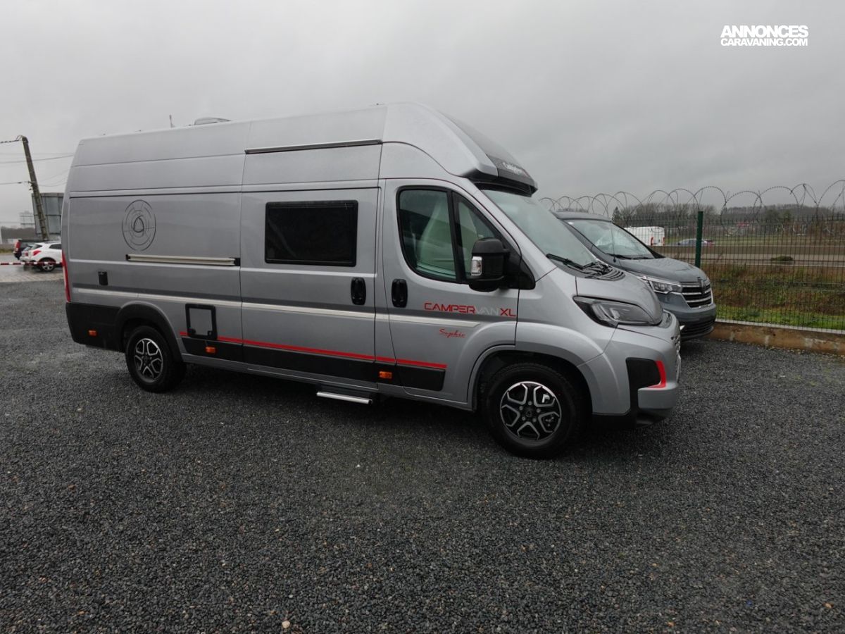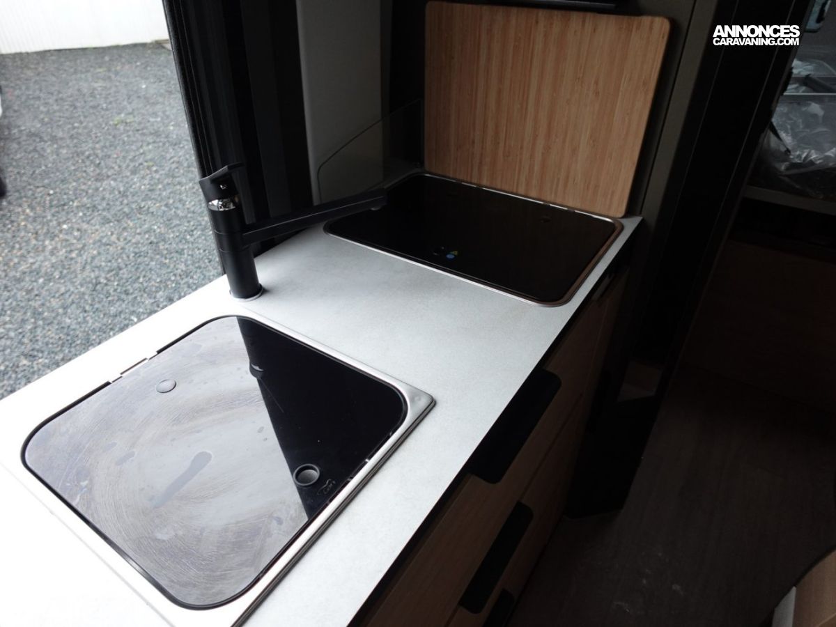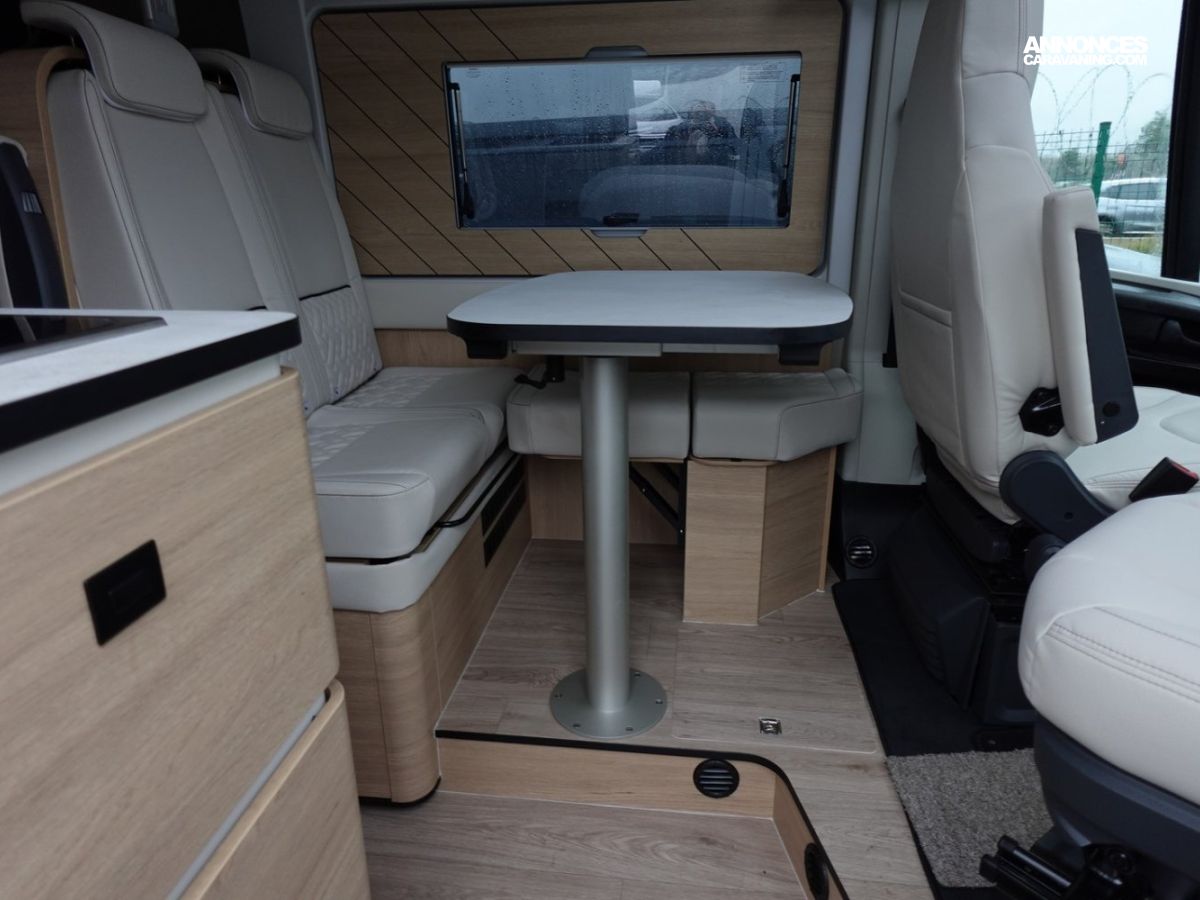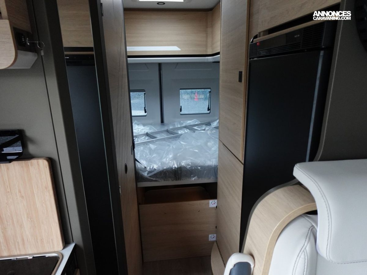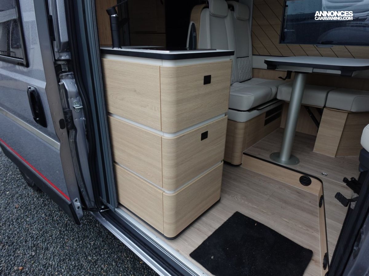 (Ambiance mobilier au choix, Sellerie au choix, Truma Combi 4 DIESEL avec kit altitude et commande de chauffage CP PLUS, 2ème batterie cellule AGM, Jantes 16 pouces en alliage léger, Volant cuir, Habillage gris sur aérateurs, TPMS, Feux avant 100 % LED, Allumage automatique des feux et des essuie-glaces, Frein de stationnement électrique, Pare-chocs avant couleur carrosserie, Skid plate noire, Feux anti-brouillard, Peinture métallisée Gris Artense, Toit panoramique SKYVIEW, Renfort pneumatiques suspension essieu arrière, Panneau solaire 150 W, Déco Saphir, Prise gaz extérieure)