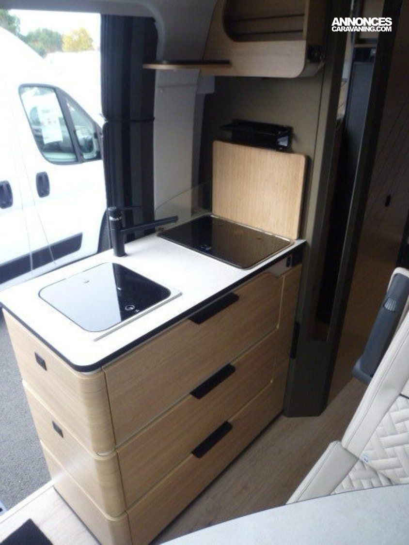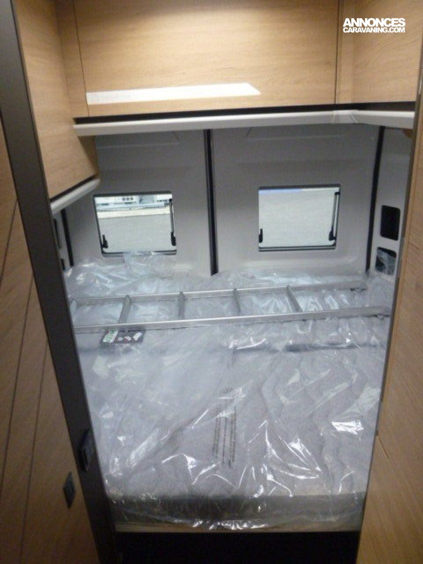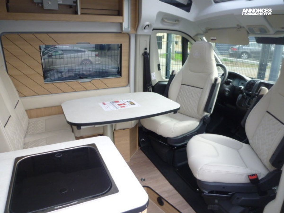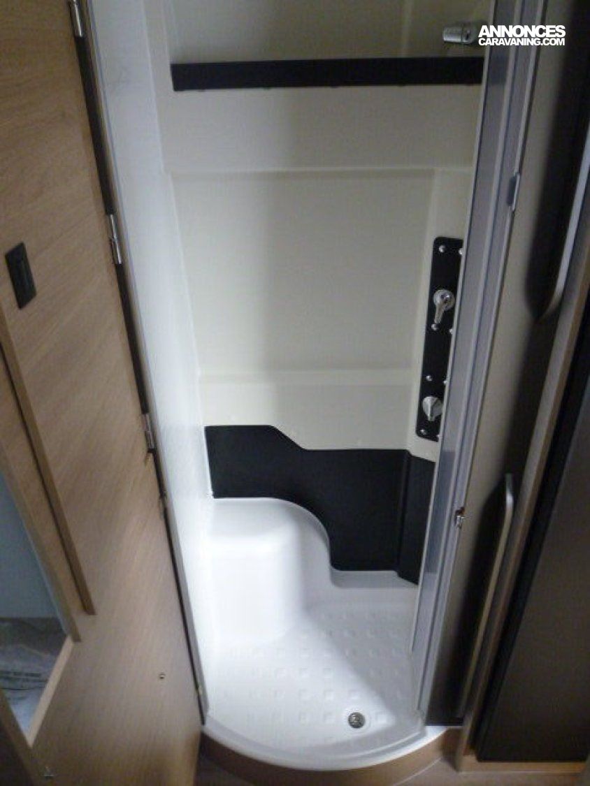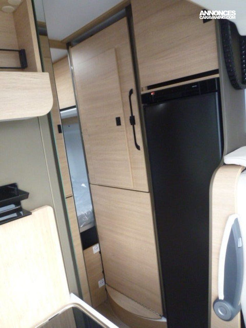 Cuisine en long, Douche indépendante, Lit arrière transversal, lit pavillon, Maxi salon, Salon avant sièges pivotants, Salon en L, WC Cassette.