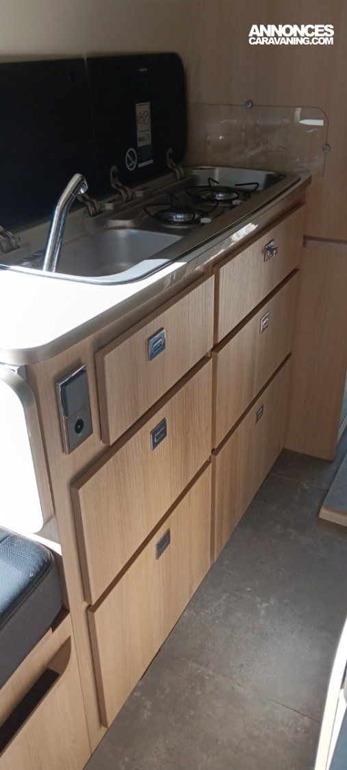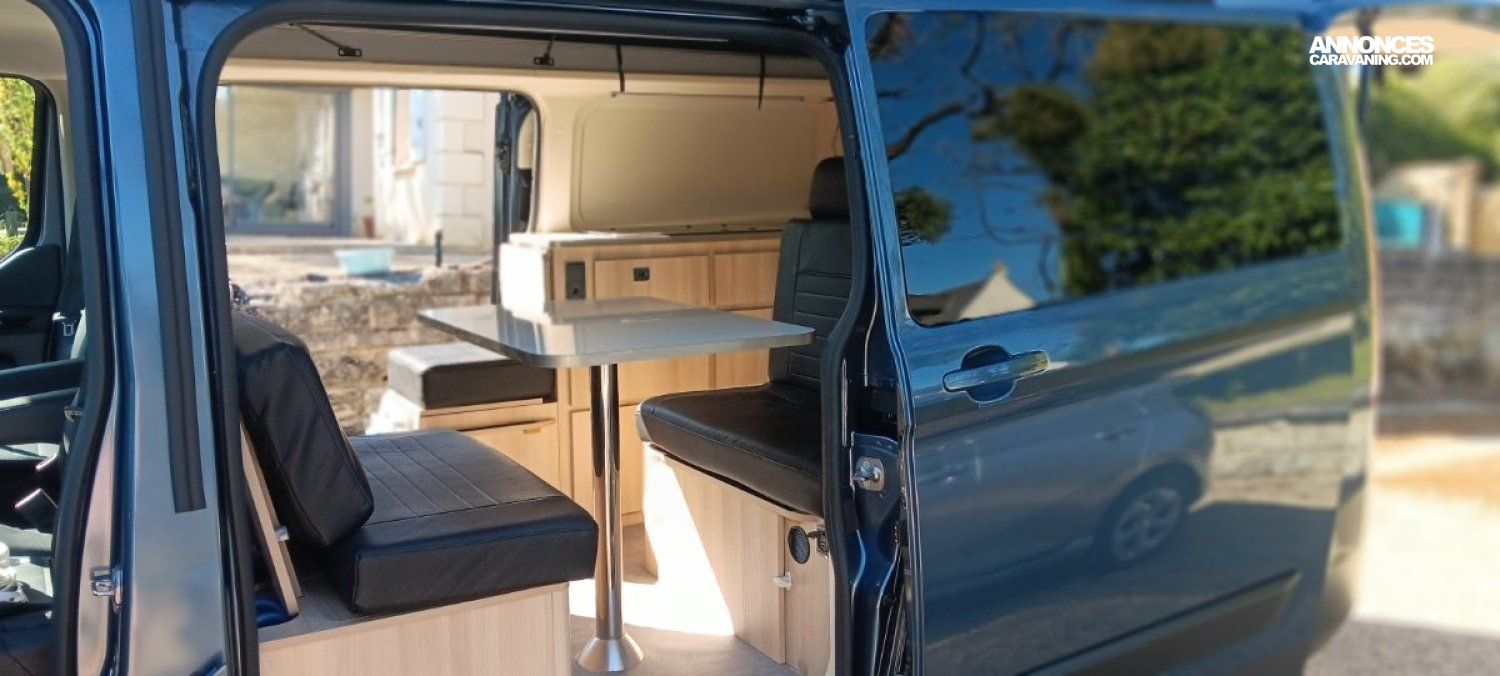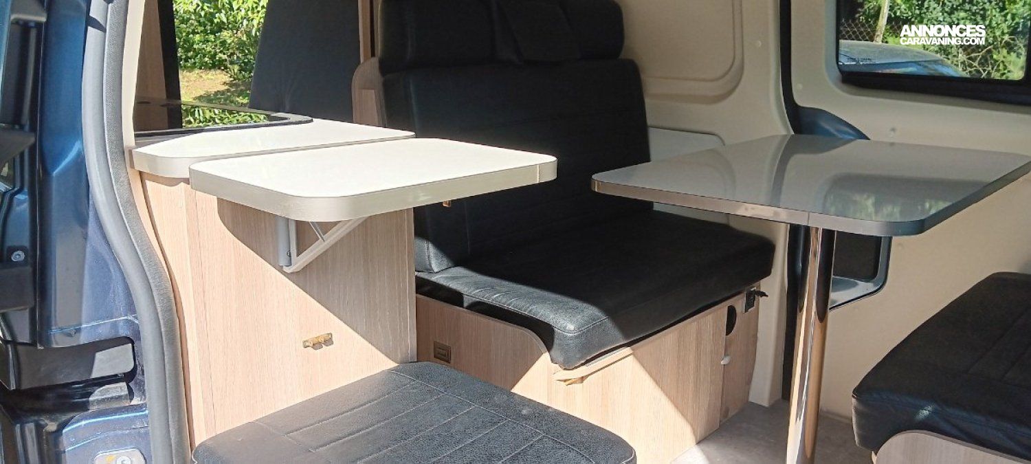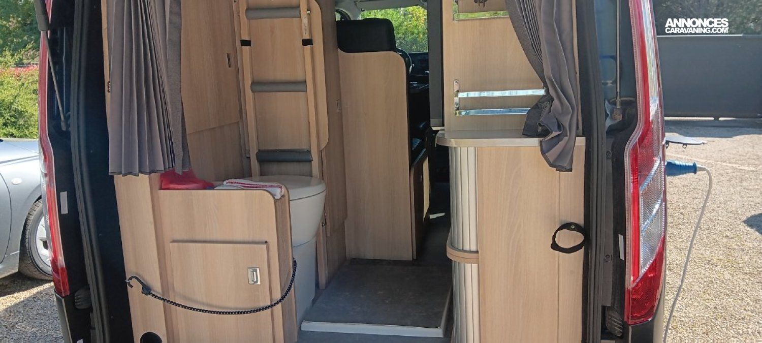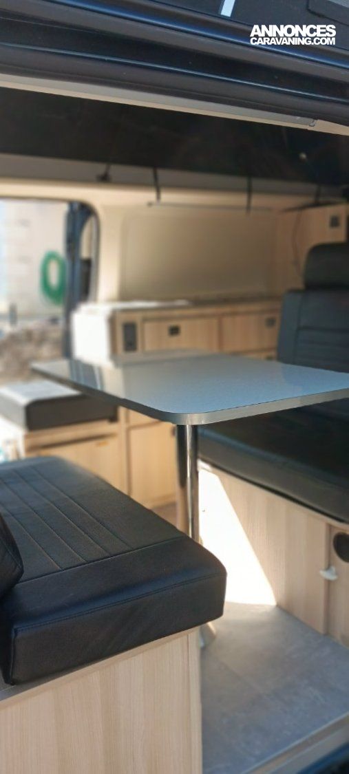 Van aménagé comprenant un grand salon avec banquette face / face, une cuisine avec de nombreux rangements, un réfrigérateur, une douche, un WC casette et un toit relevable.