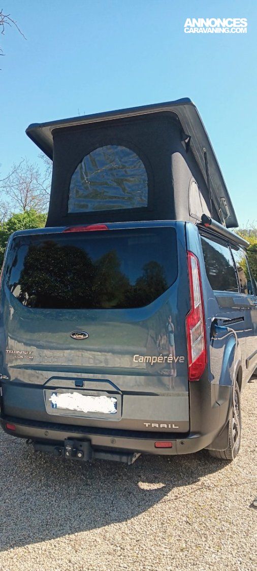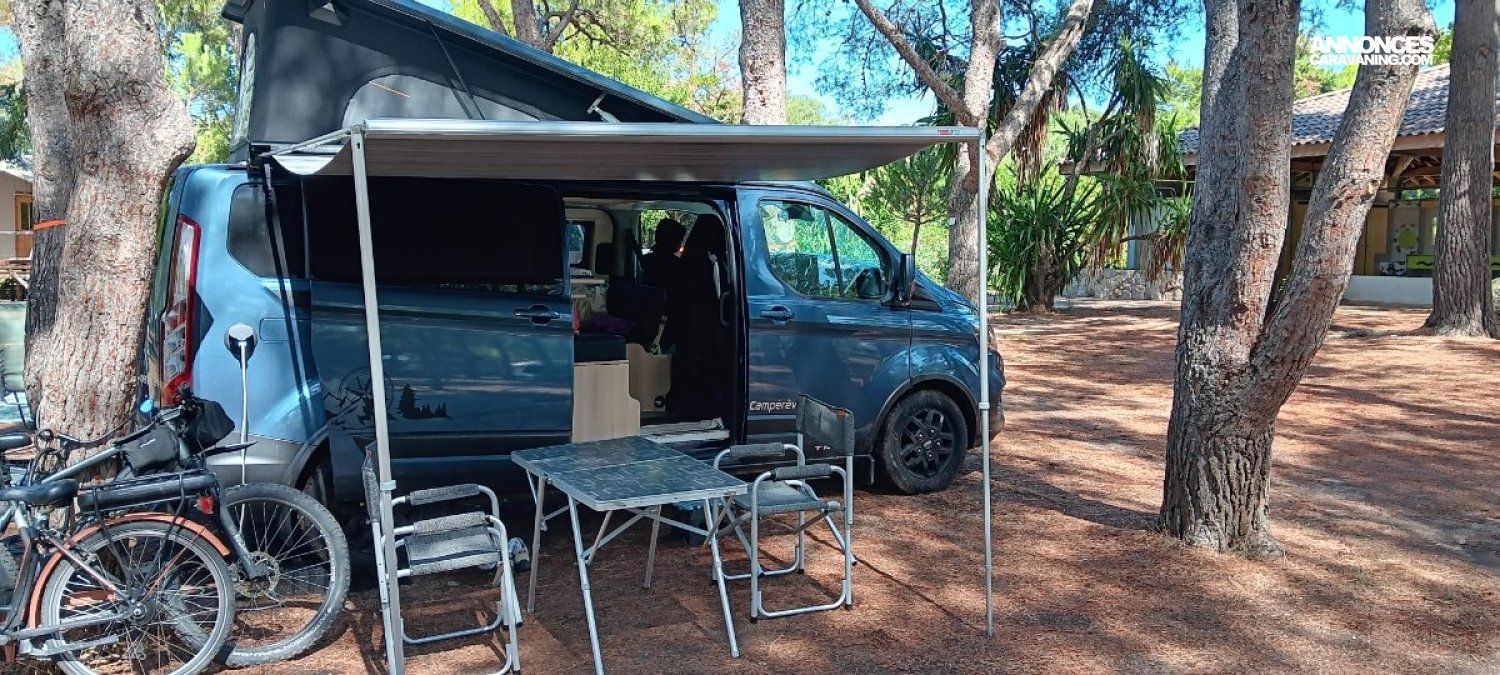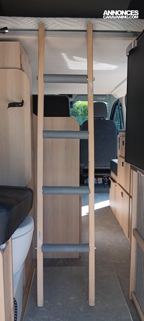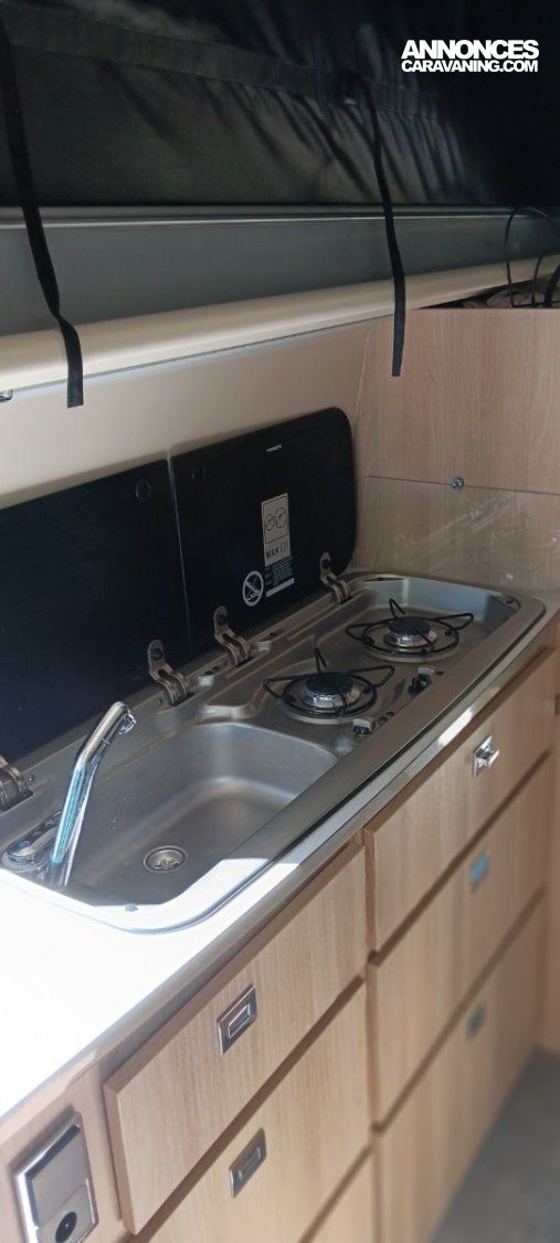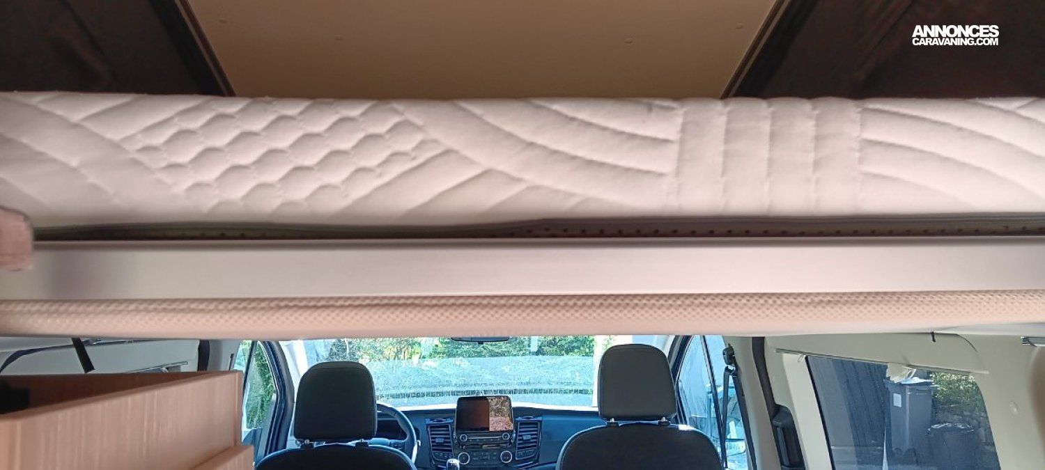 Van aménagé comprenant un grand salon avec banquette face / face, une cuisine avec de nombreux rangements, un réfrigérateur, une douche, un WC casette et un toit relevable.