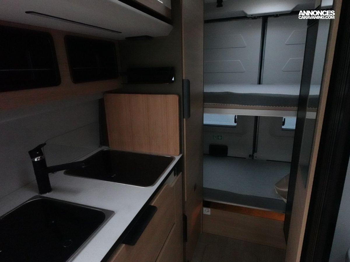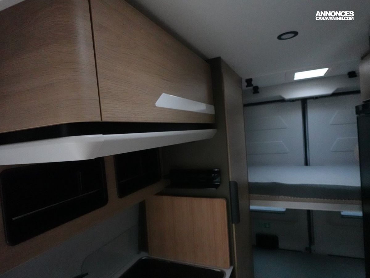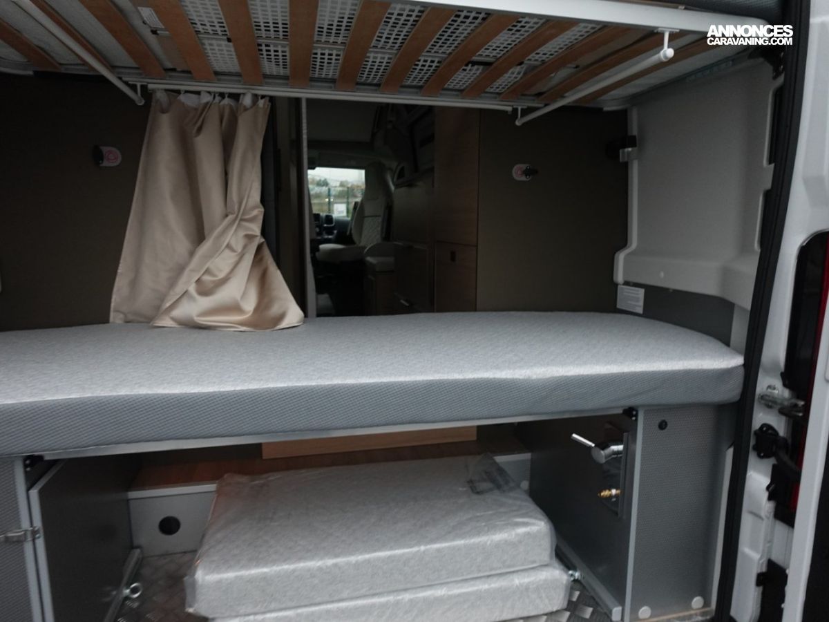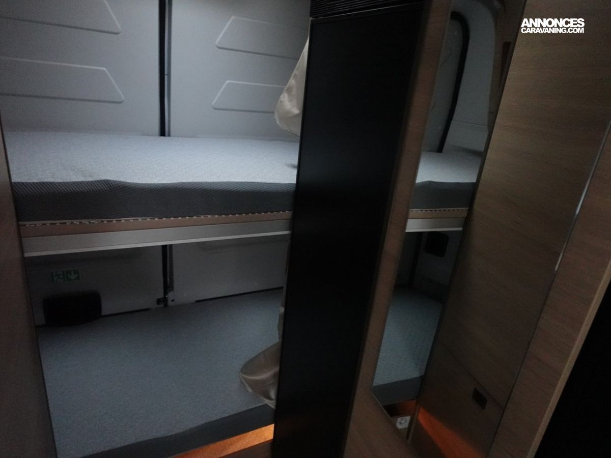 Sa salle de bain DUO’SPACE exploite intelligemment chaque centimètre pour un confort optimal au quotidien, tandis que le double plancher technique offre des rangements astucieux pour toute la famille. Le lit pavillon assisté par vérin se déploie facilement, libérant un véritable espace de vie en journée.