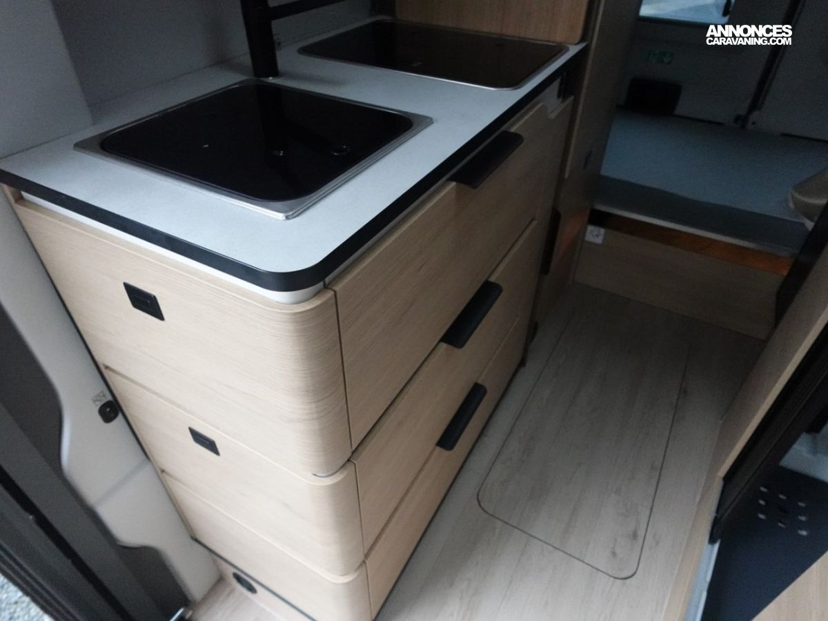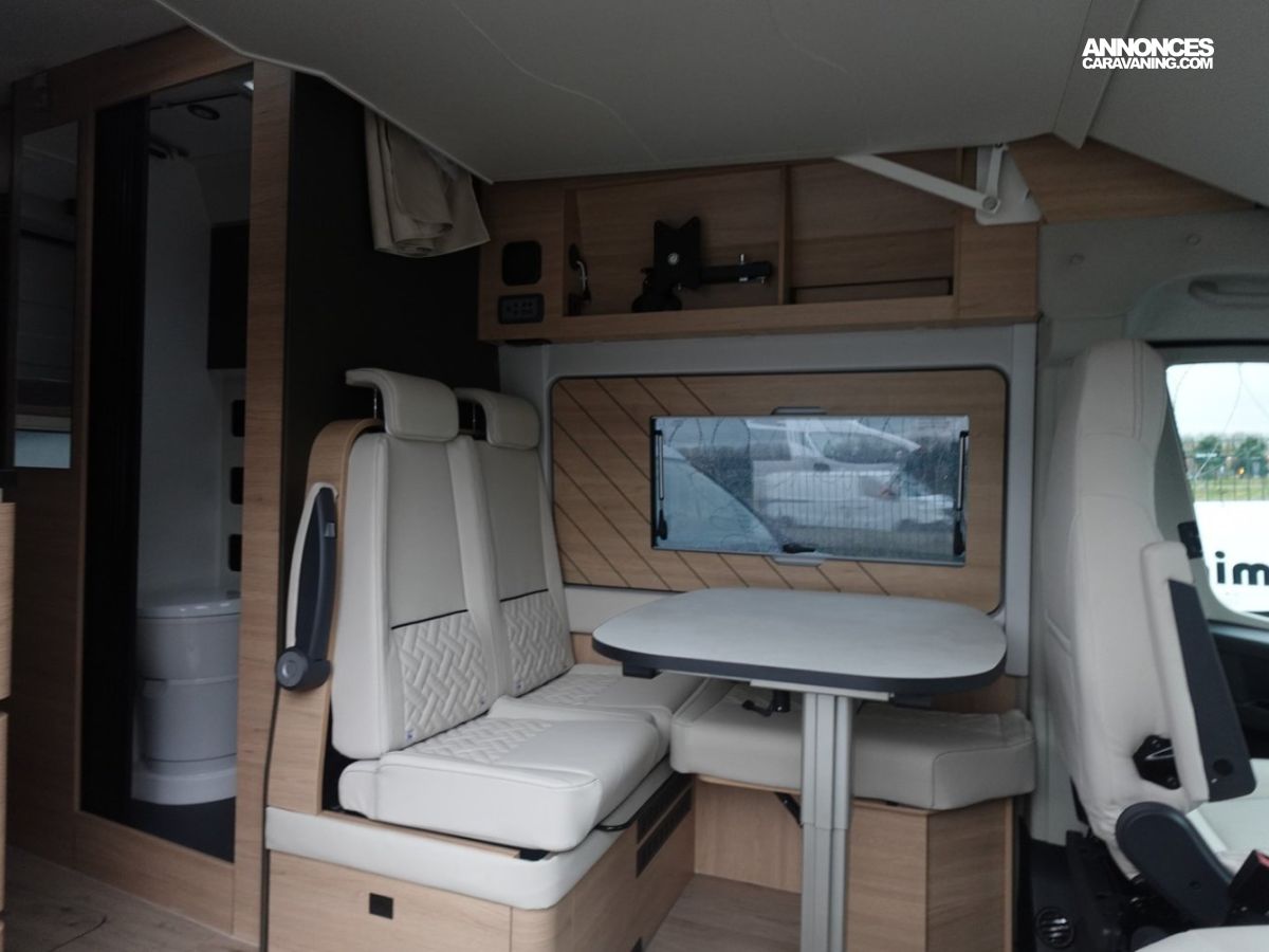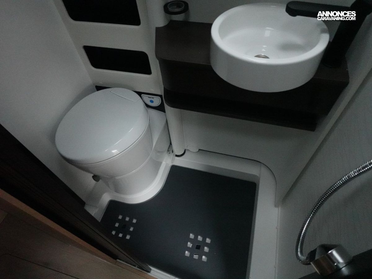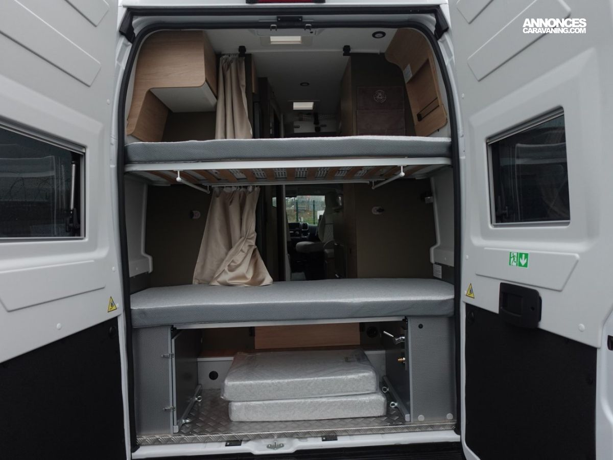 Sa salle de bain DUO’SPACE exploite intelligemment chaque centimètre pour un confort optimal au quotidien, tandis que le double plancher technique offre des rangements astucieux pour toute la famille. Le lit pavillon assisté par vérin se déploie facilement, libérant un véritable espace de vie en journée.
