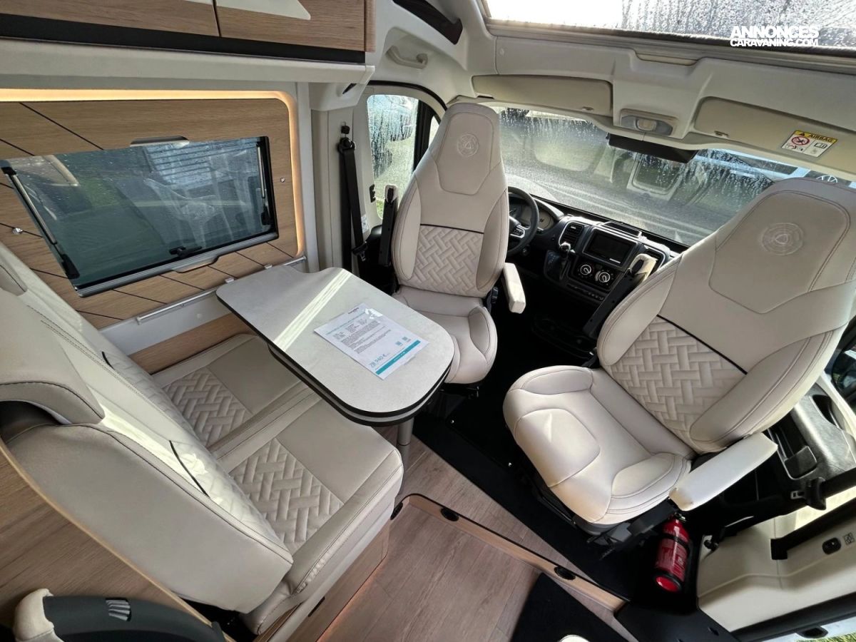 PACK SMART : Jantes 16" en alliage léger bi-ton, volant cuir, habillage gris sur aérateurs (PROFILES + FOURGONS] TPMS (contrôle de pression des pneus automatique) PACK LED ASSIST : Feux avant 100% LED, allumage automatique des feux et des essuie glace Frein de stationnement électrique, pare choc avant couleur carrosserie + skid plate noire + feu anti brouillard Peinture carrosserie métallisée Gris Artense, Toit panoramique Skyview Renfort pneumatique suspension essieu arrière sans Couchage dinete 1 place Panneau solaire 150W déco SAPHIR-prise gaz extérieure TRUMA Combi 4 DIESEL avec kit atitude et commande de chaufage CP PLUS