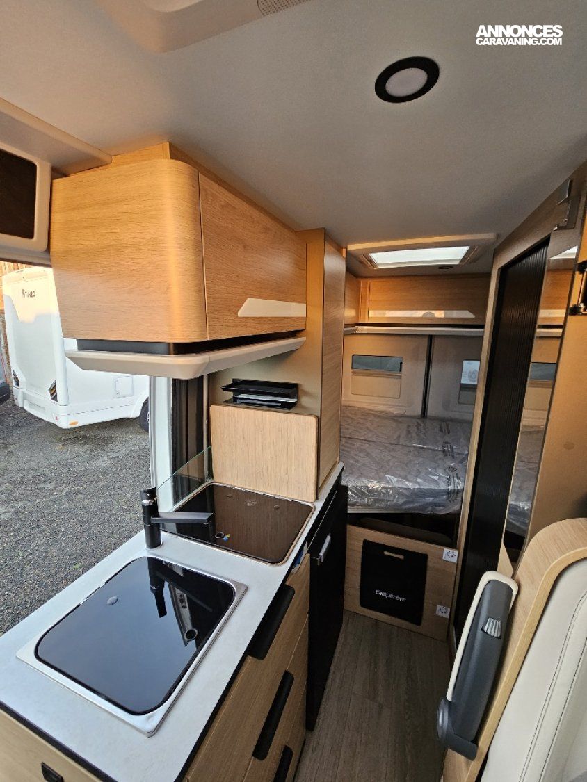 Fourgon aménagé comprenant un salon avant panoramique, une salle d’eau Duo’Space avec paroi pivotante, un lit arrière transversal et une cuisine avec de nombreux rangements. Le tout en 5.41 m de long.