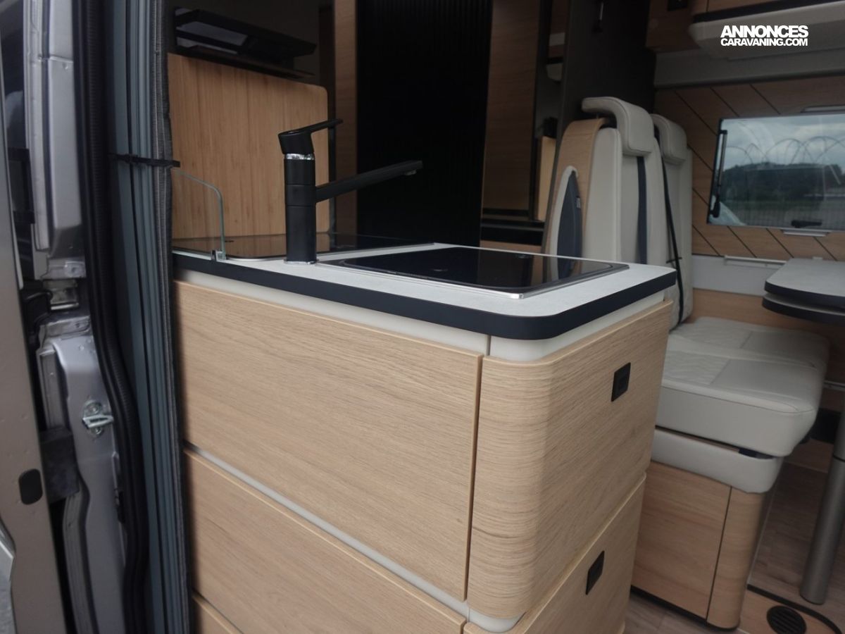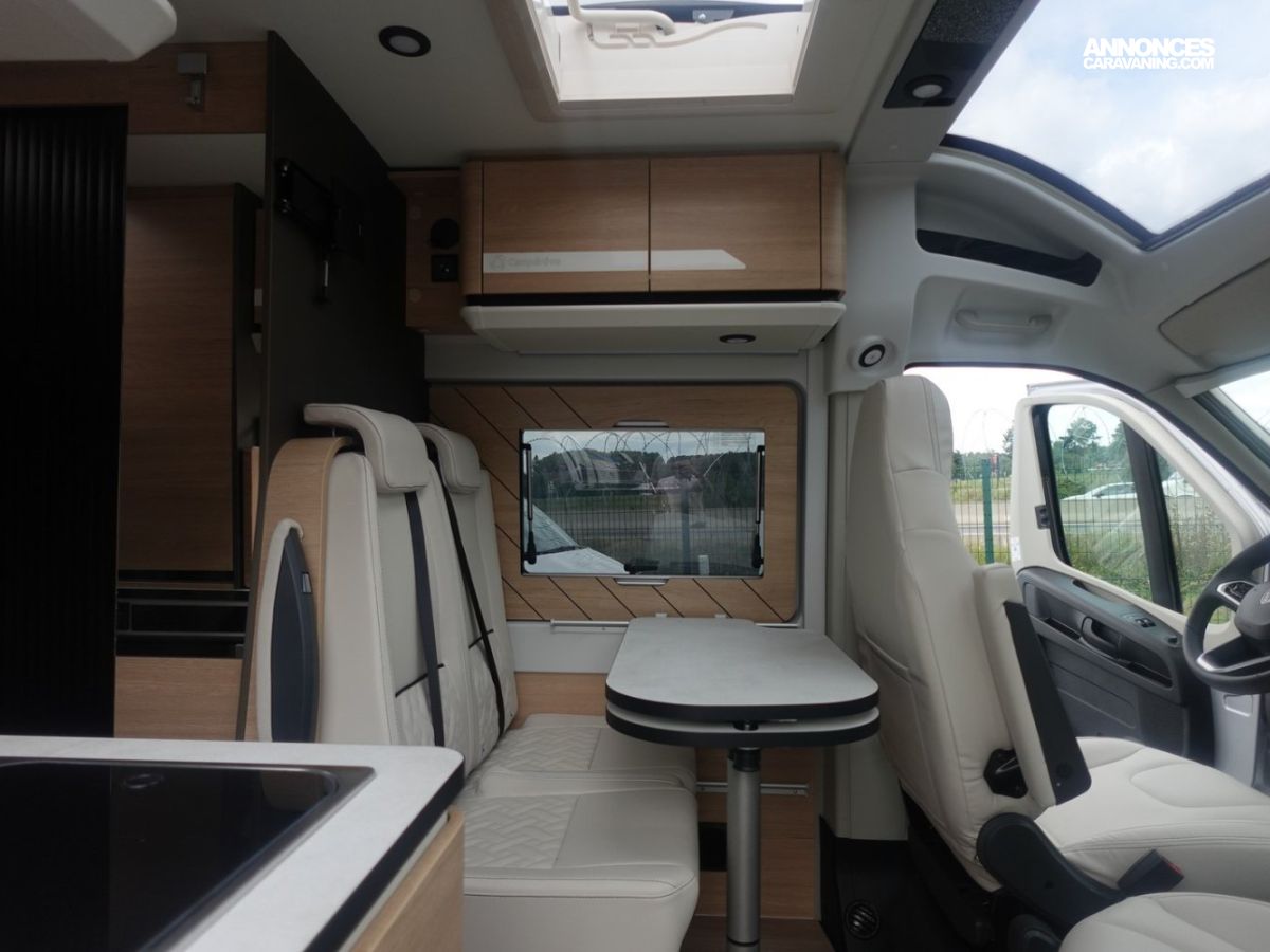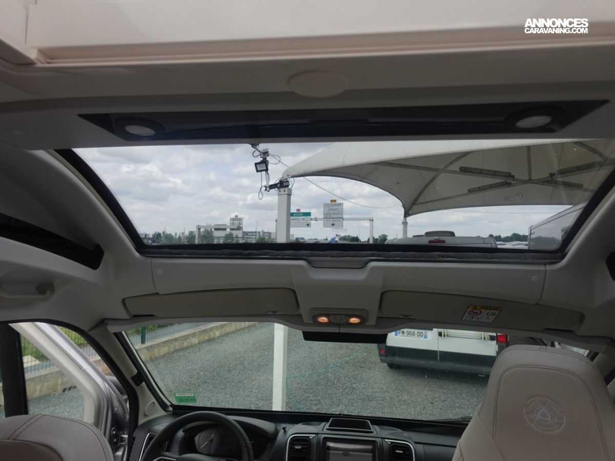 (Ambiance mobilier au choix, Sellerie au choix, Truma Combi 4 DIESEL avec kit altitude et commande de chauffage CP PLUS, 2ème batterie cellule AGM, Jantes 16 pouces en alliage léger, Volant cuir, Habillage gris sur aérateurs, TPMS, Feux avant 100 % LED, Allumage automatique des feux et des essuie-glaces, Frein de stationnement électrique, Pare-chocs avant couleur carrosserie, Skid plate noire, Feux anti-brouillard, Peinture métallisée Gris Artense, Toit panoramique SKYVIEW, Renfort pneumatiques suspension essieu arrière, Couchage dinette, Panneau solaire 150 W, Déco Saphir, Prise gaz extérieure)