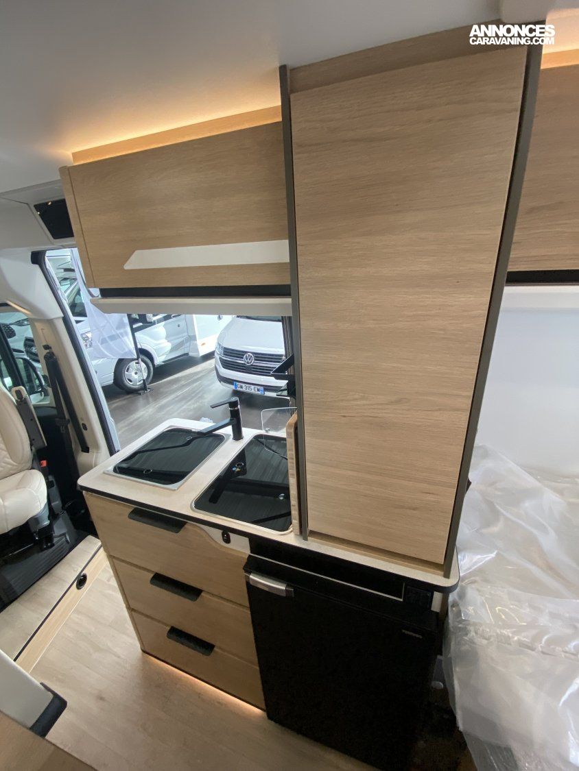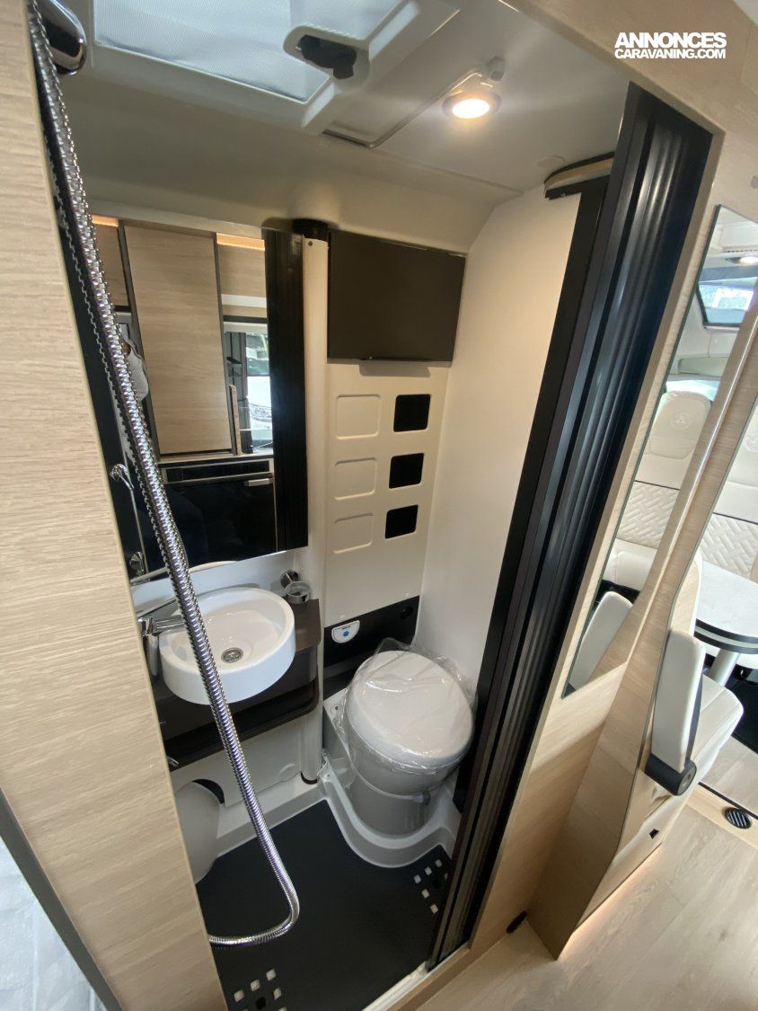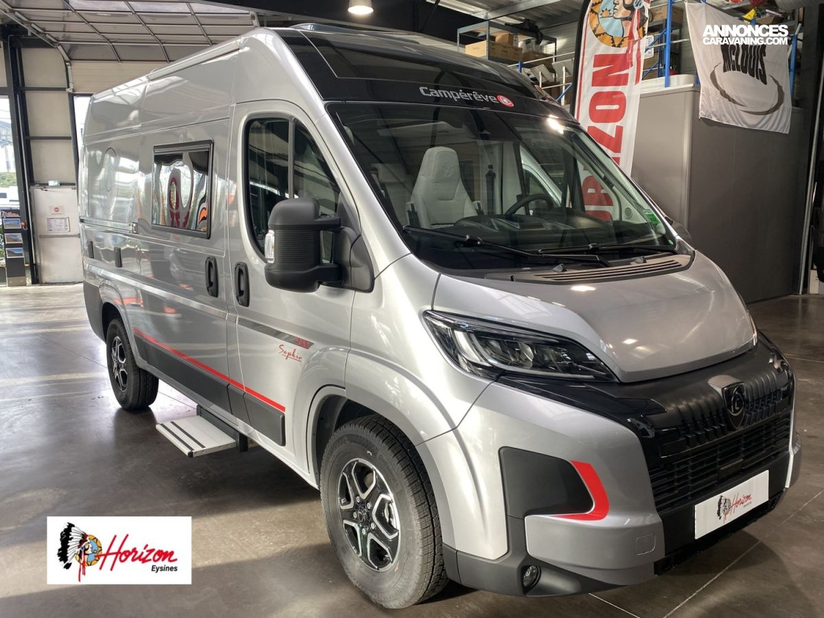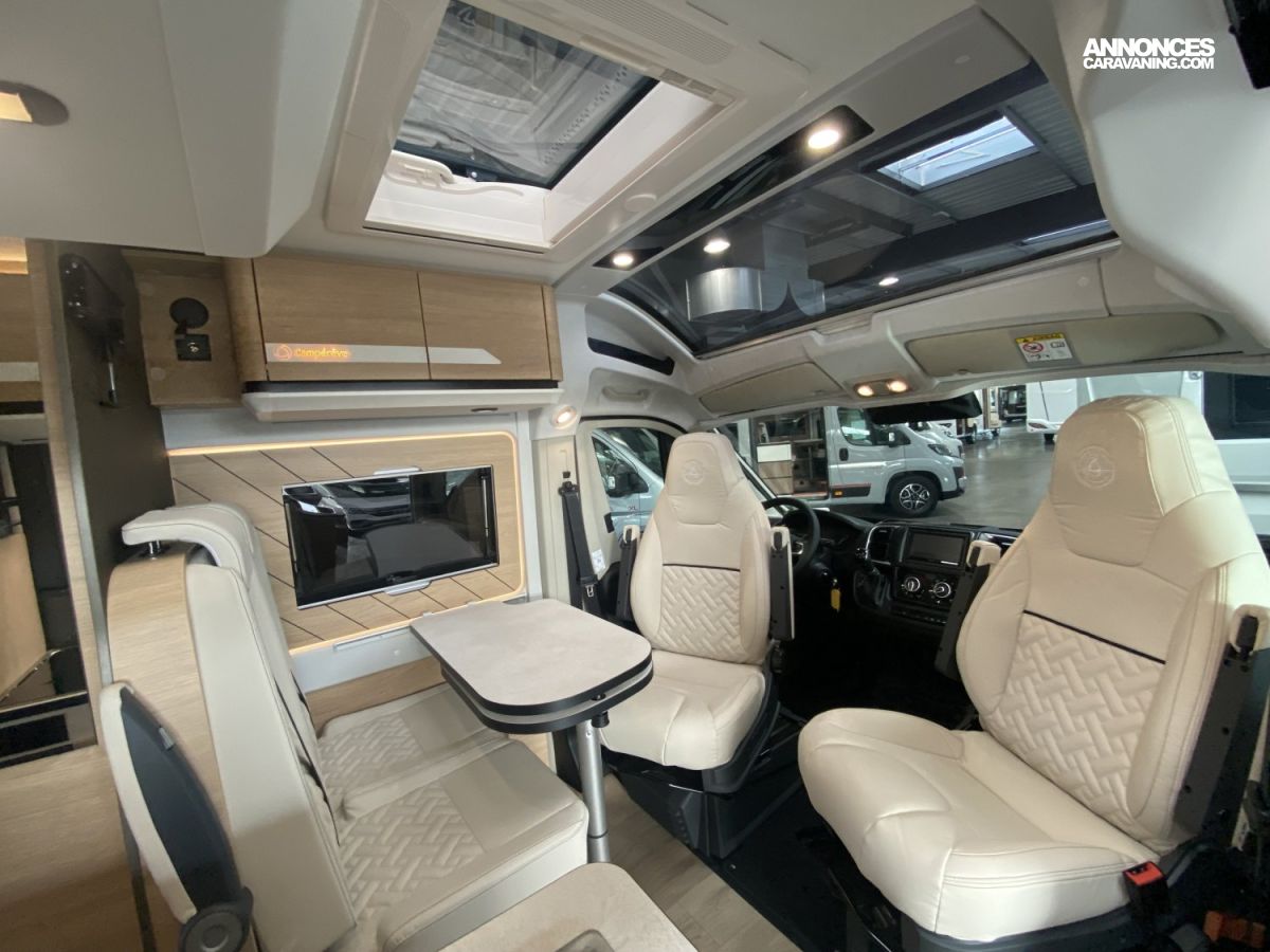 Toit panoramique SkyViewPeinture carrosserie Gris Artense Broderie et marquage carrosserie « Saphir »TPMS (contrôle automatique de pression des pneus)Frein de stationnement électriquePare-chocs avant couleur carrosserie, skid plate noir et feux anti-brouillardRenfort pneumatique suspension arrièrePanneau solaire 150 W montéPrise gaz extérieureTRUMA Combi 4 diesel avec kit altitude et commande CP PLUS (chauffage)Réfrigérateur à compression 90 LSalle d’eau Duo’Space avec paroi pivotanteWC à cassettePanneau solaireBatterie cellule AGMESP, ABS, traction +Marchepied électriqueMoustiquaire de porte cellulePrises 230 V / 12 V / USBVolant multifonctionsRégulateur de vitesseDouchette extérieure eau chaude/eau froideSuspensions pneumatiquesVerrouillage centralisé cabine et celluleVitres électriquesÉclairage extérieur et intérieur complet Pack Confort + :Commandes au volant pour radioPneus all season 3PMSFPorte moustiquaire ouvrant latéralHaut-parleurs salon et chambreStation multimédia DAB Pioneer avec écran et Apple CarPlay / Android AutoCaméra de recul avec écran intégré au tableau de bordDeuxième clé télécommandée (PLIP)Commandes radio déportées dans la celluleTraction+ avec Hill Descent ControlStores pare-brise et baies cabine plissésDouchette extérieure avec eau chaude/eau froide Pack Smart :Jantes 16″ en alliage léger bi-tonVolant cuirHabillage gris sur aérateurs Pack LED Assist :Projecteurs avant 100 % LEDAllumage automatique des feuxAllumage automatique des essuie-glaces