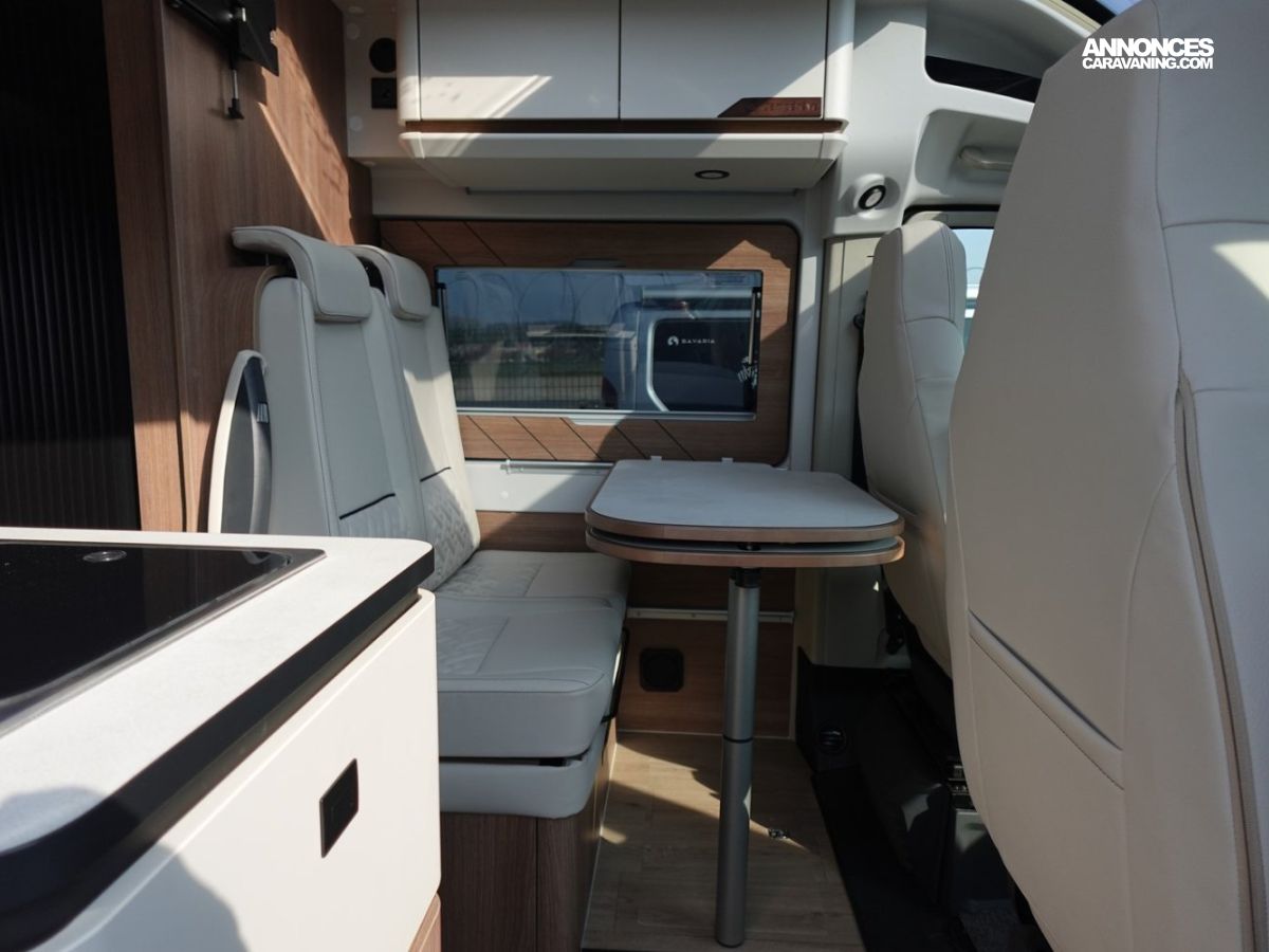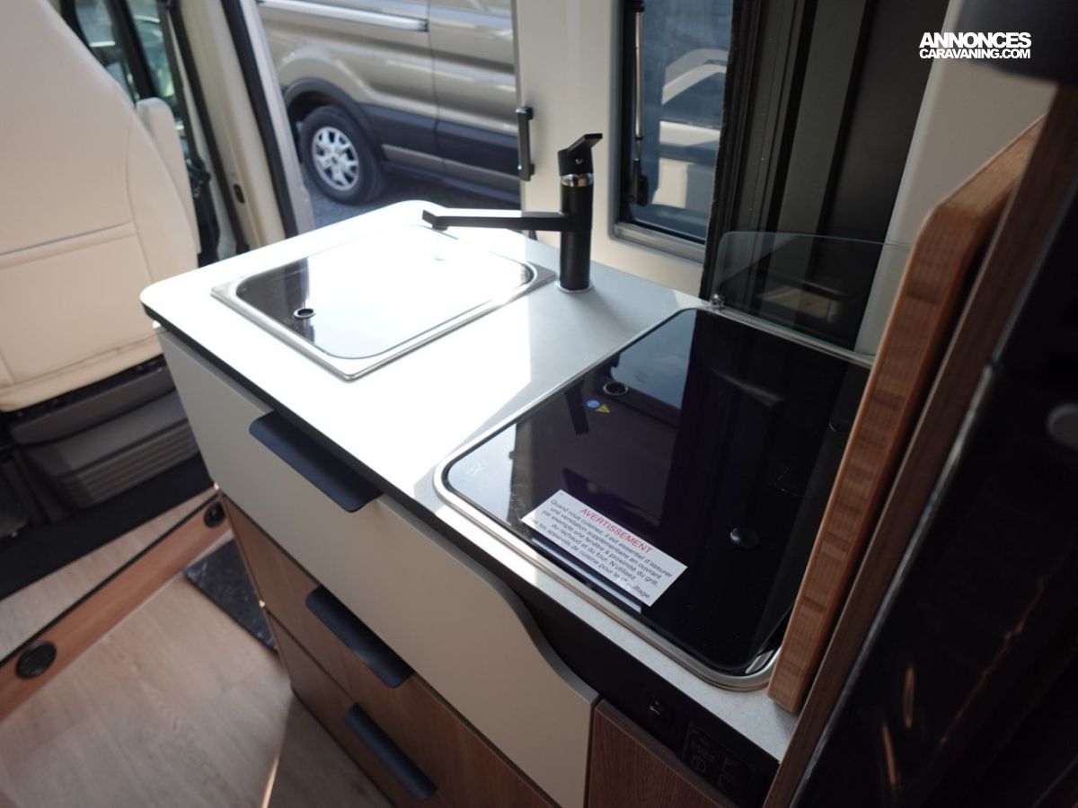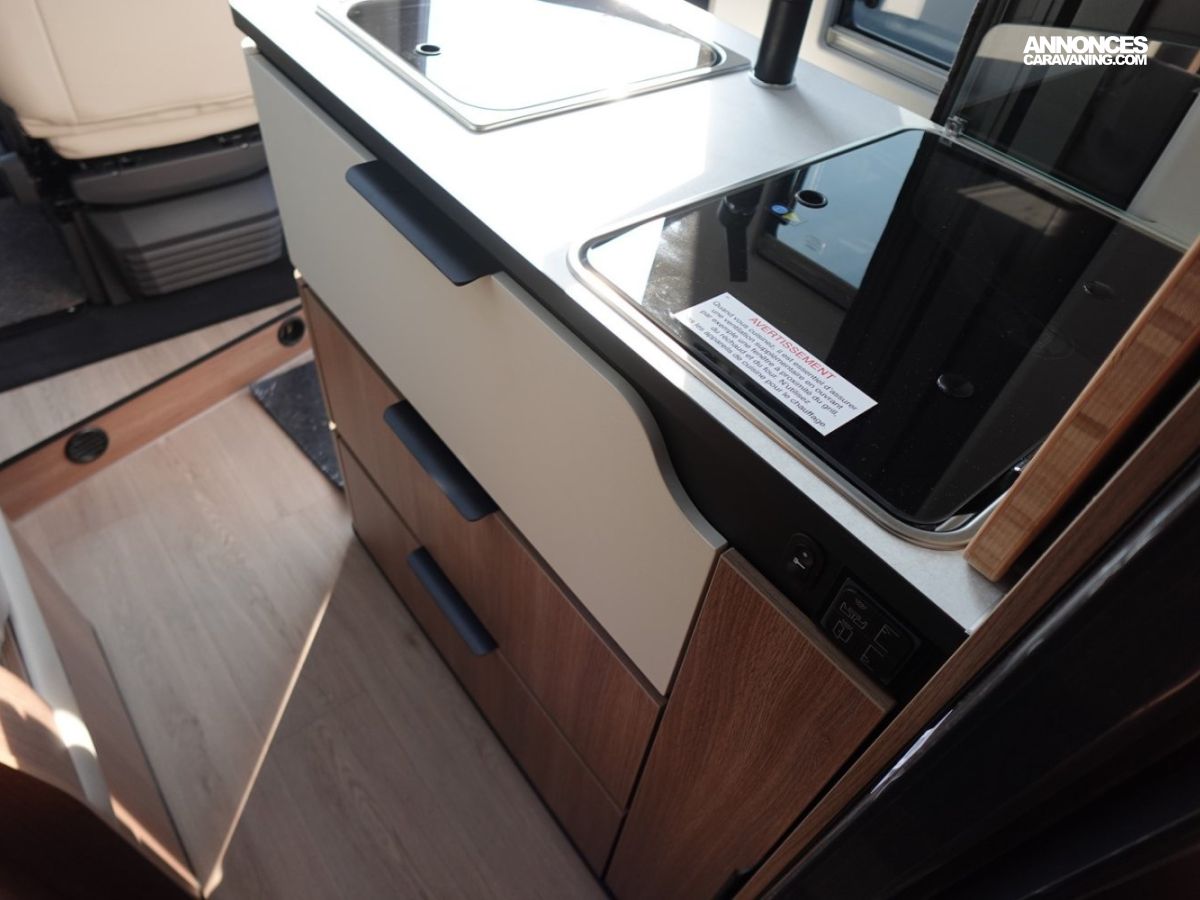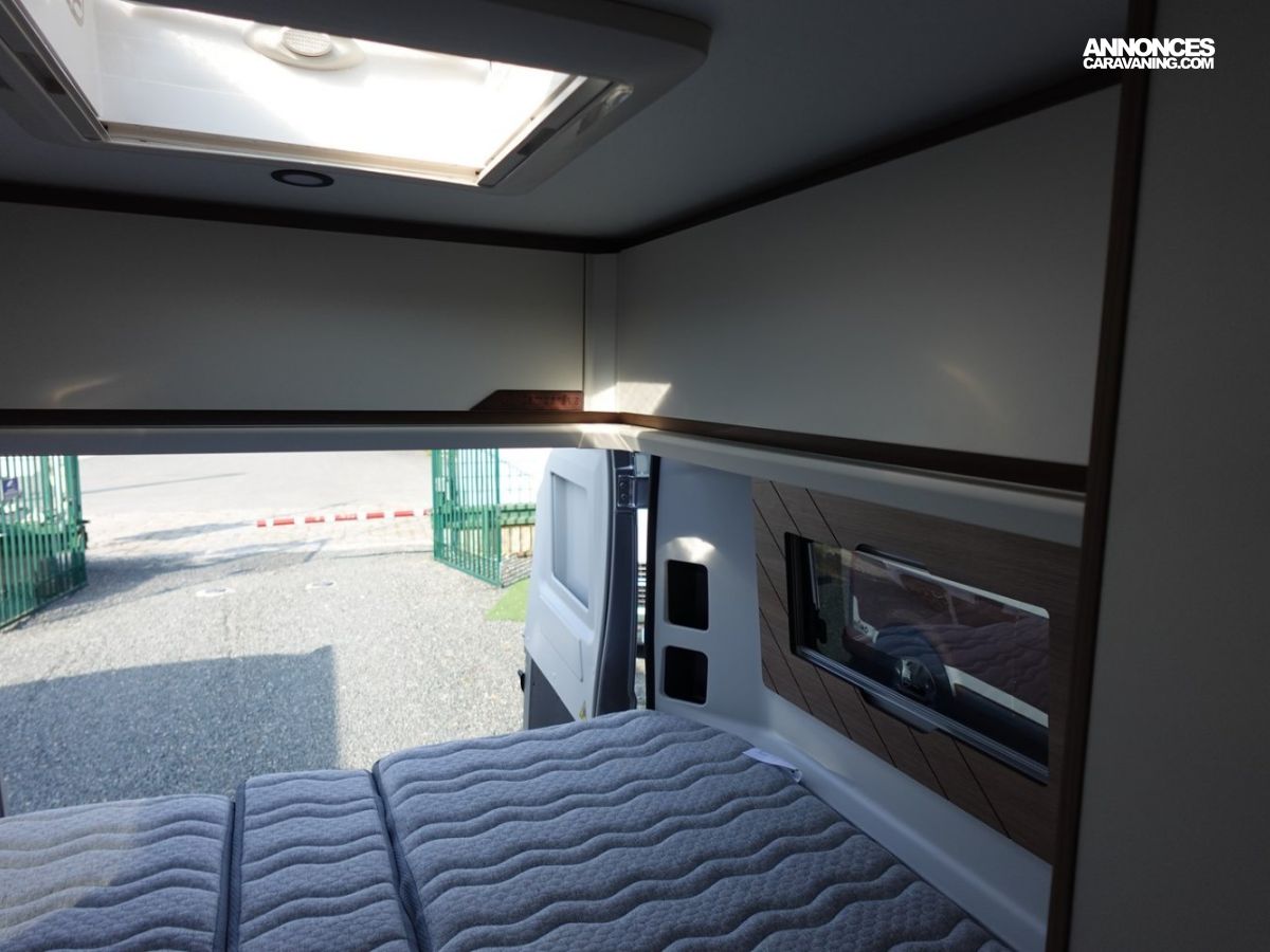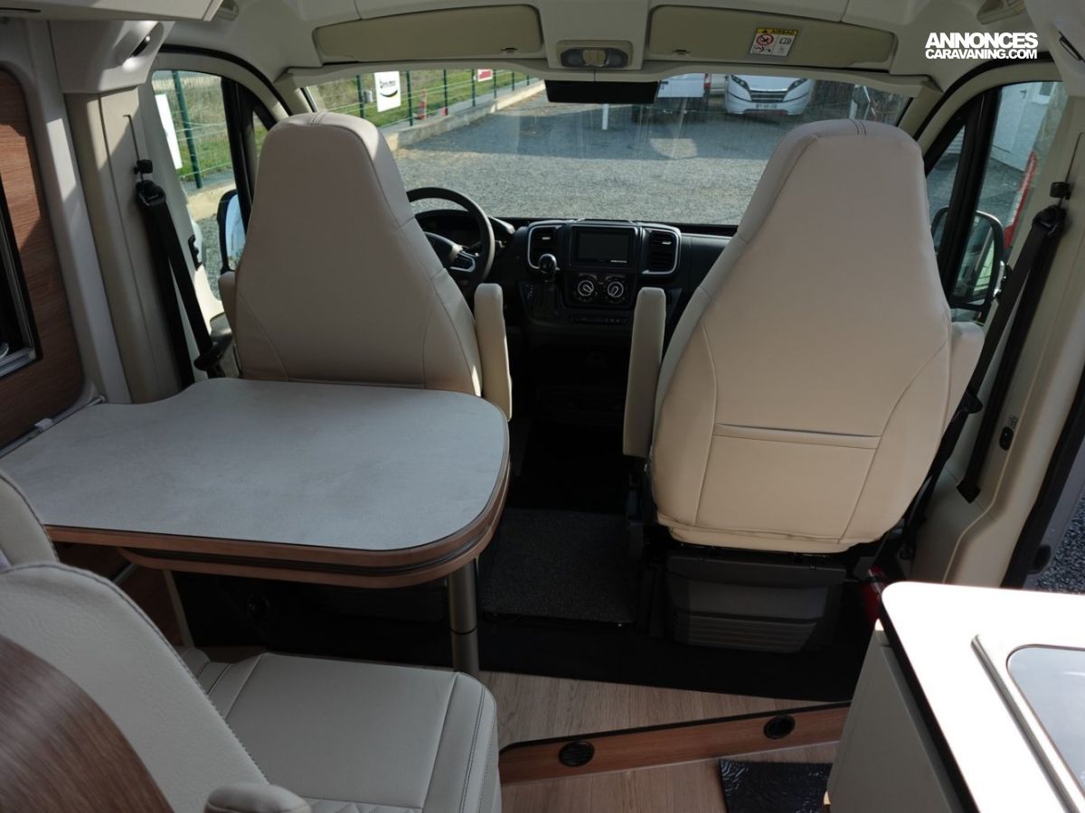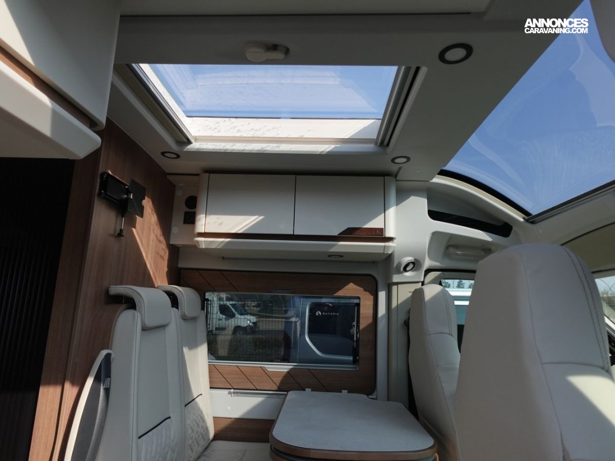 (Ambiance mobilier au choix, Sellerie au choix, Truma Combi 4 DIESEL avec kit altitude et commande de chauffage CP PLUS, 2ème batterie cellule AGM, Jantes 16 pouces en alliage léger, Volant cuir, Habillage gris sur aérateurs, TPMS, Feux avant 100 % LED, Allumage automatique des feux et des essuie-glaces, Frein de stationnement électrique, Pare-chocs avant couleur carrosserie, Skid plate noire, Feux anti-brouillard, Peinture métallisée Gris Artense, Toit panoramique SKYVIEW, Renfort pneumatiques suspension essieu arrière, Couchage dinette, Panneau solaire 150 W, Déco Saphir, Prise gaz extérieure)