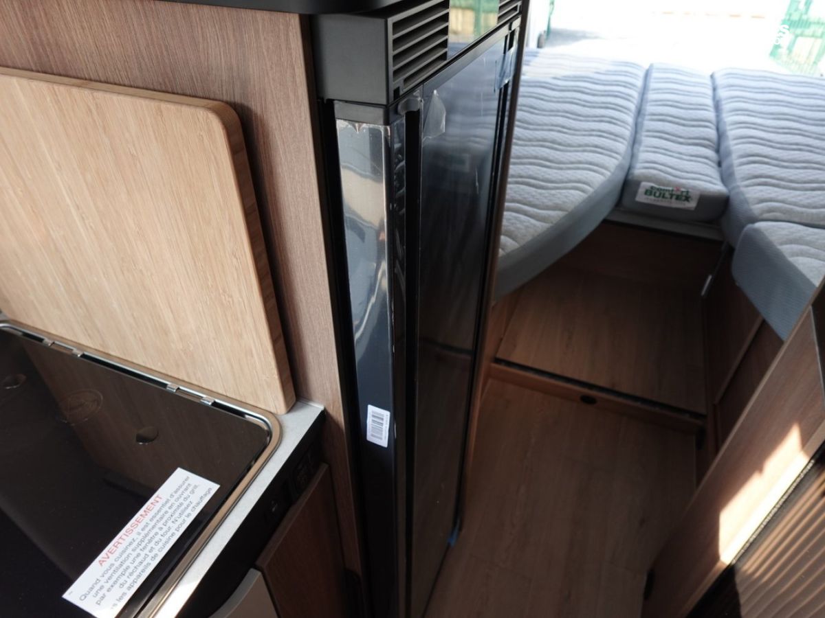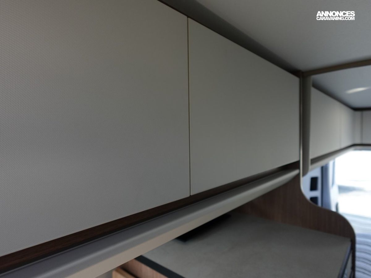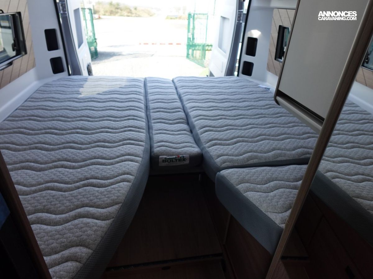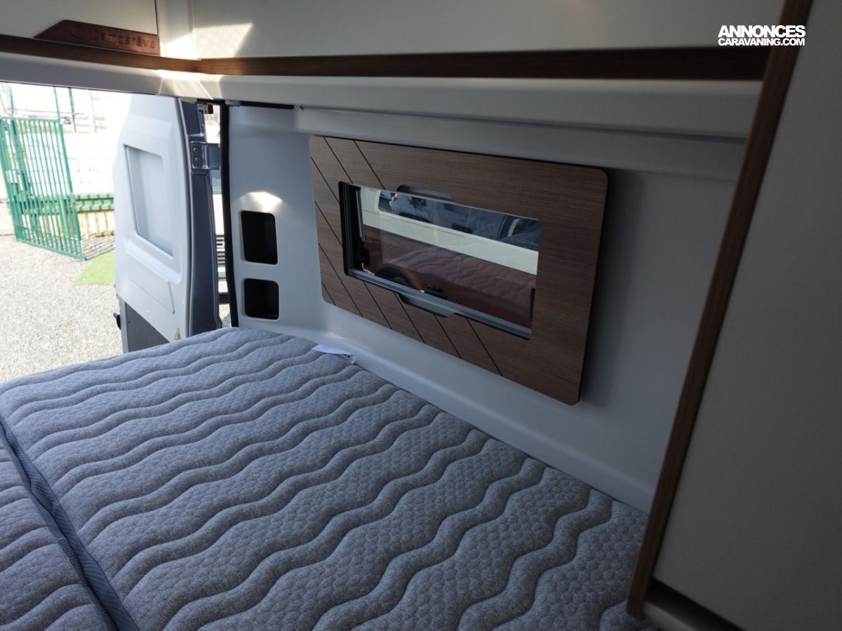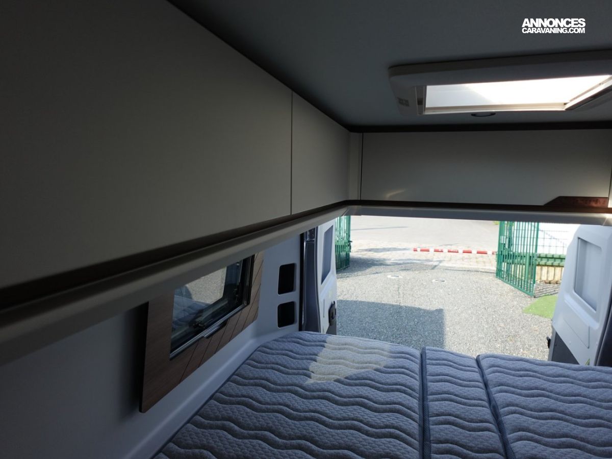 Magnifique fourgon aménagé comprenant un salon avant panoramique, un grand réfrigérateur, une salle d’eau DUO’SPACE avec paroi pivotante et des lits jumeaux.