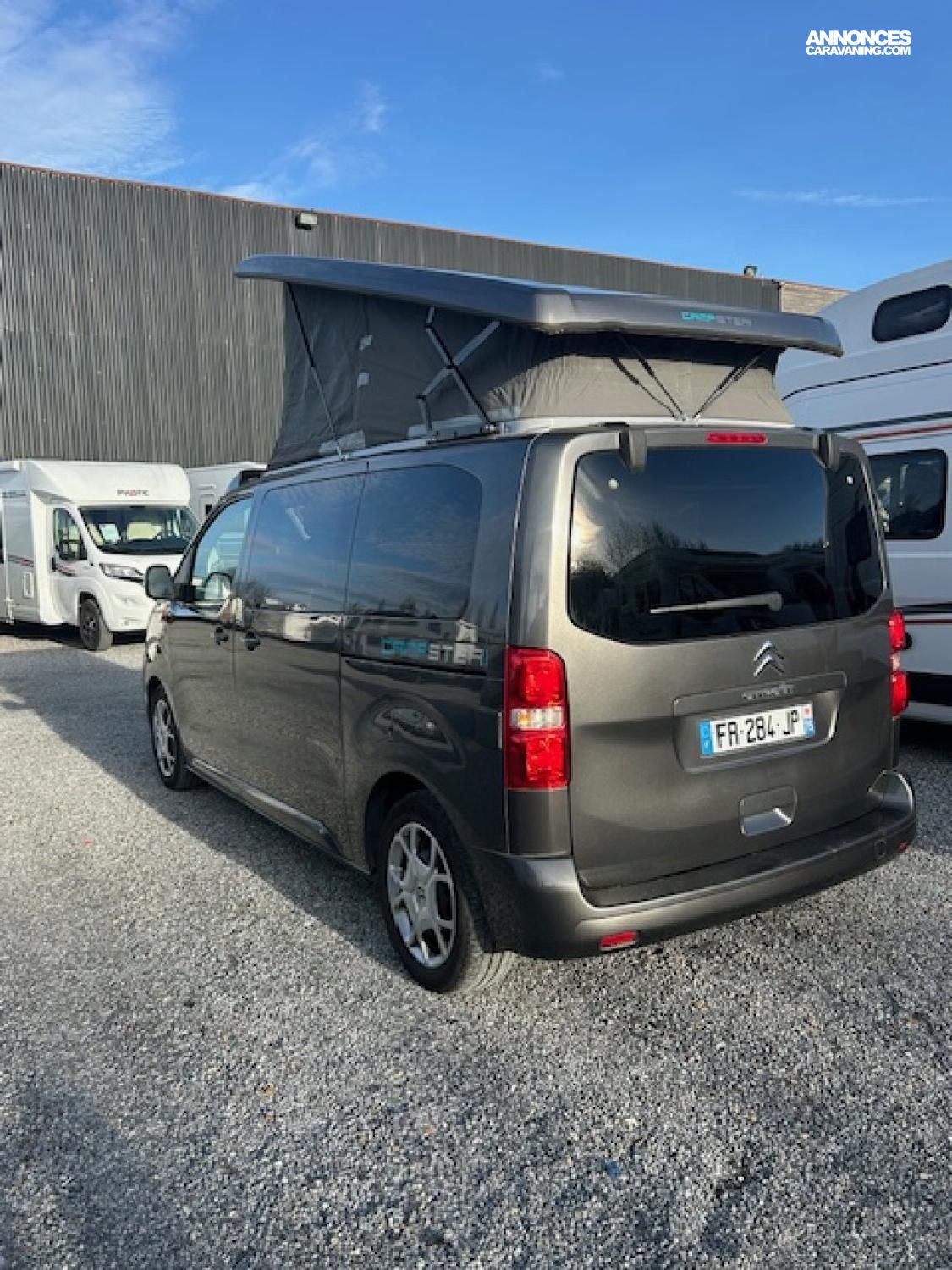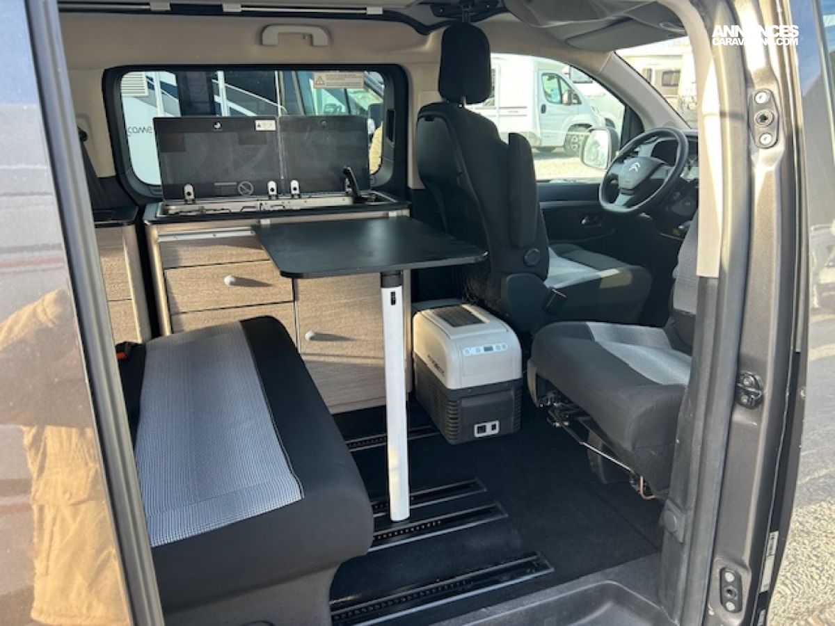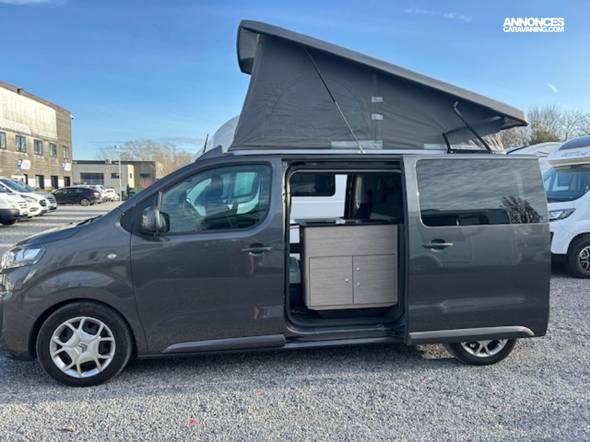 ABS & ESC - Système Audio RD6 avec kit mains libres Bluetooth et port USB - Climatisation automatique bizone Climatisation supplémentaire à l’arrière - Airbags conducteur et passager - Sièges conducteur et passager pivotants - Siège passager avec accoudoir et soutien lombaire Régulateur/limiteur de vitesse - Alerte de vigilance conducteur - Volant réglable en hauteur et en profondeur - Contrôle de pression des pneumatiques - Aide au démarrage en côte - Pack visibilité (Allumage automatique des phares, essuie‐vitre automatique, Rétroviseur intérieur avec anti-éblouissement automatique) - Projecteurs antibrouillard directionnels avant Feux de jour LED - Rétroviseurs extérieurs électriques et chauffants - Fermeture centralisée avec télécommande - Pare-chocs avant et arrière en couleur de carrosserie - Baguettes latérales en couleur de carrosserie - Coques de rétroviseurs et poignées de portes en couleur de carrosserie - Jantes tôle 17‘‘ avec enjoliveurs - Kit anti-crevaison - Lève-vitres électriques en rang 1 - Ordinateur de bord - Rideaux pare-soleil en rang 2 - Pare-soleil avec éclairage - Vitres latérales, rangs 2 et 3 et arrière surteintées - Porte arrière avec lunette dégivrante et essuie-glace - Toit relevable panoramique blanc avec matelas tout confort - Bloc cuisine amovible avec réchaud et évier Banquette - 2 places en rang 2 amovible, avec fixation Isofix, convertible en couchage Siège individuel supplémentaire avec fixation Isofix - Batterie cellule Prise extérieure CEE 230 V avec disjoncteur Deux prises 220 V dans la cellule et une prise 12 V intégrée au tableau de bord - Espace de rangement pour la table