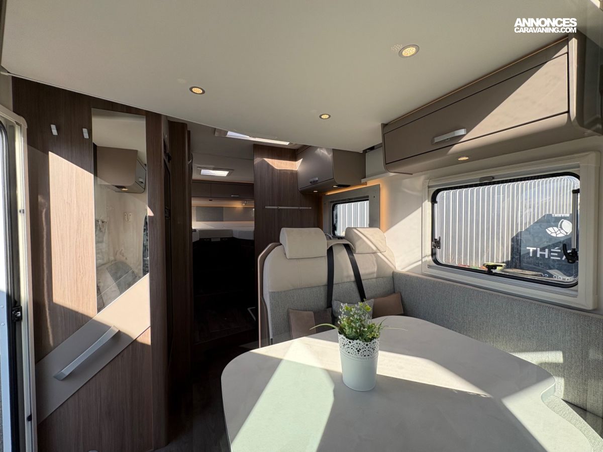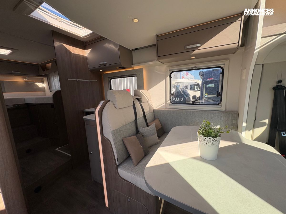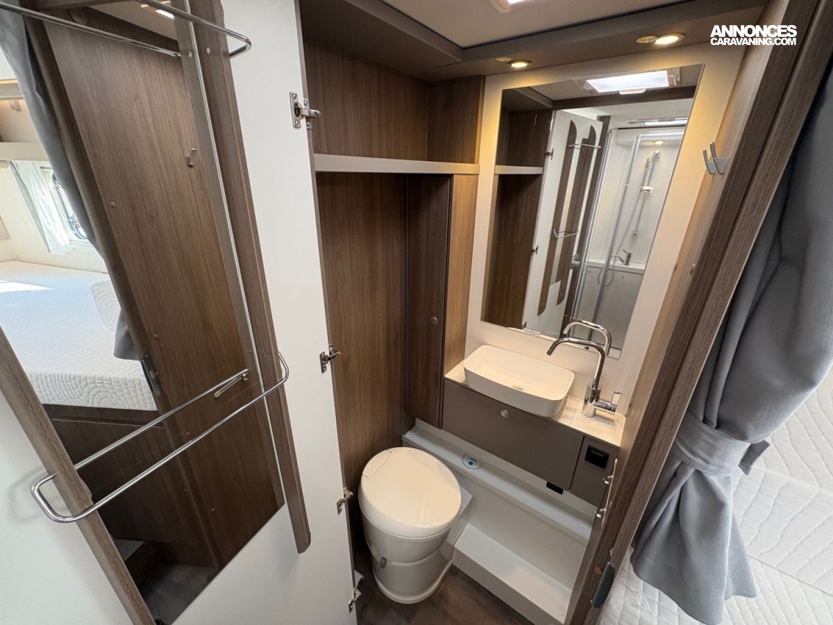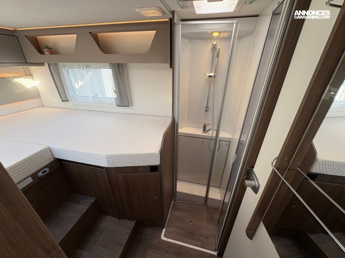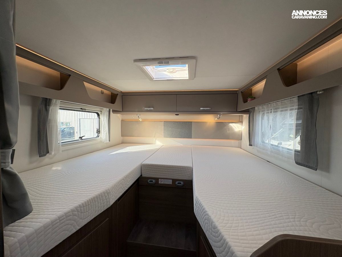 Store extérieur 4.50mMultimédia 7″ + caméra de reculAntenne satellite automatique 85cmTV écran platRéfrigérateur/freezer 185 litresRéservoir eaux usées isoléBaies à cadrePanneau solaire 120WPeinture métalClimatisation cabineLit de pavillonStores plissés de cabine