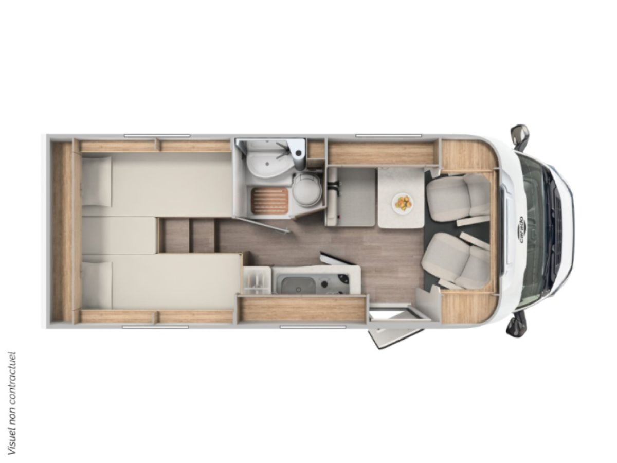 Basé sur le Citroën Jumper 2.2L HDi 140 ch, reconnu pour sa fiabilité et sa sobriété, le V337 PRO+ se distingue par son implantation avec lits jumeaux, sa grande soute garage traversante, et sa salle d’eau Vario modulable.