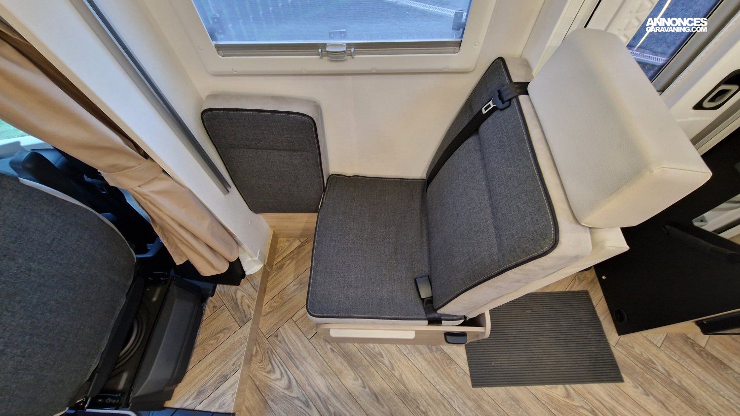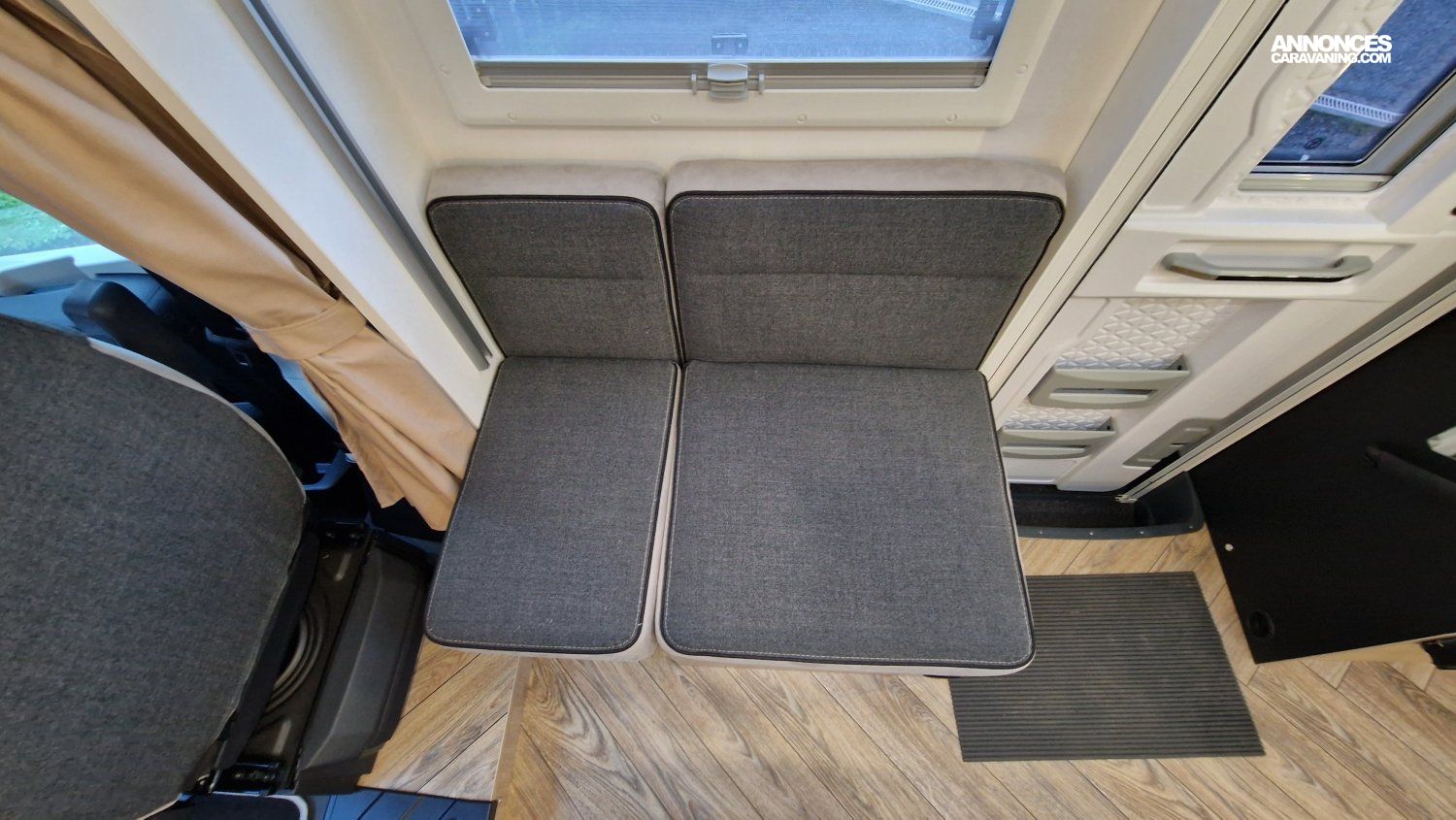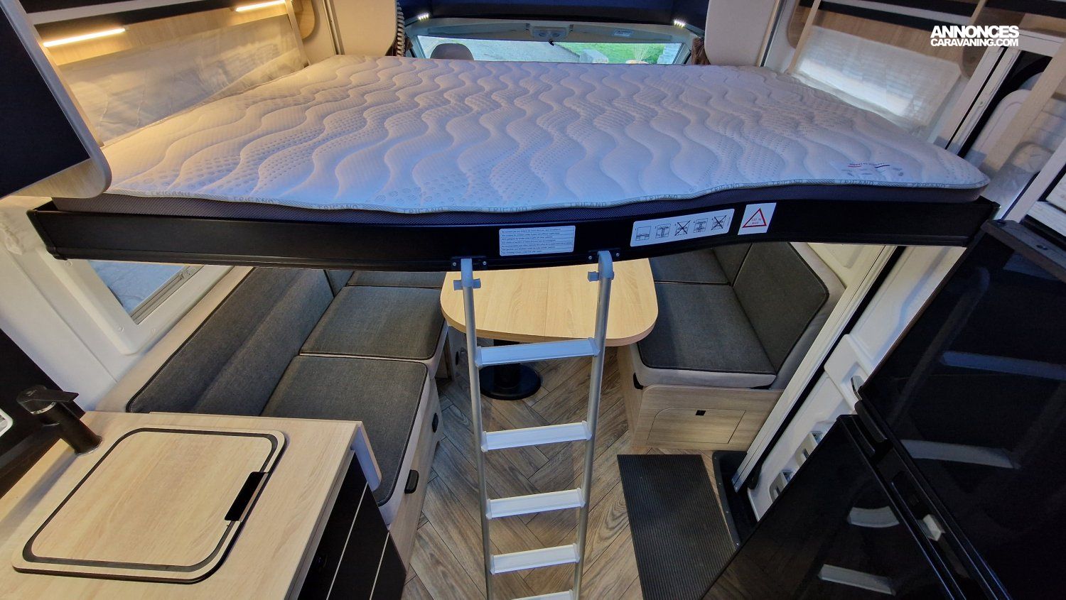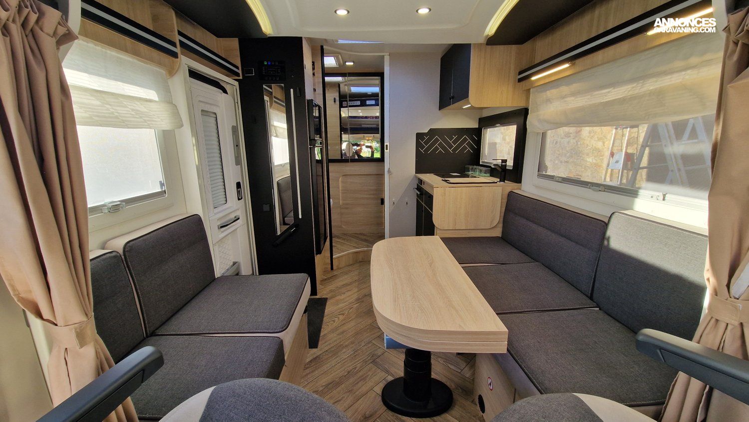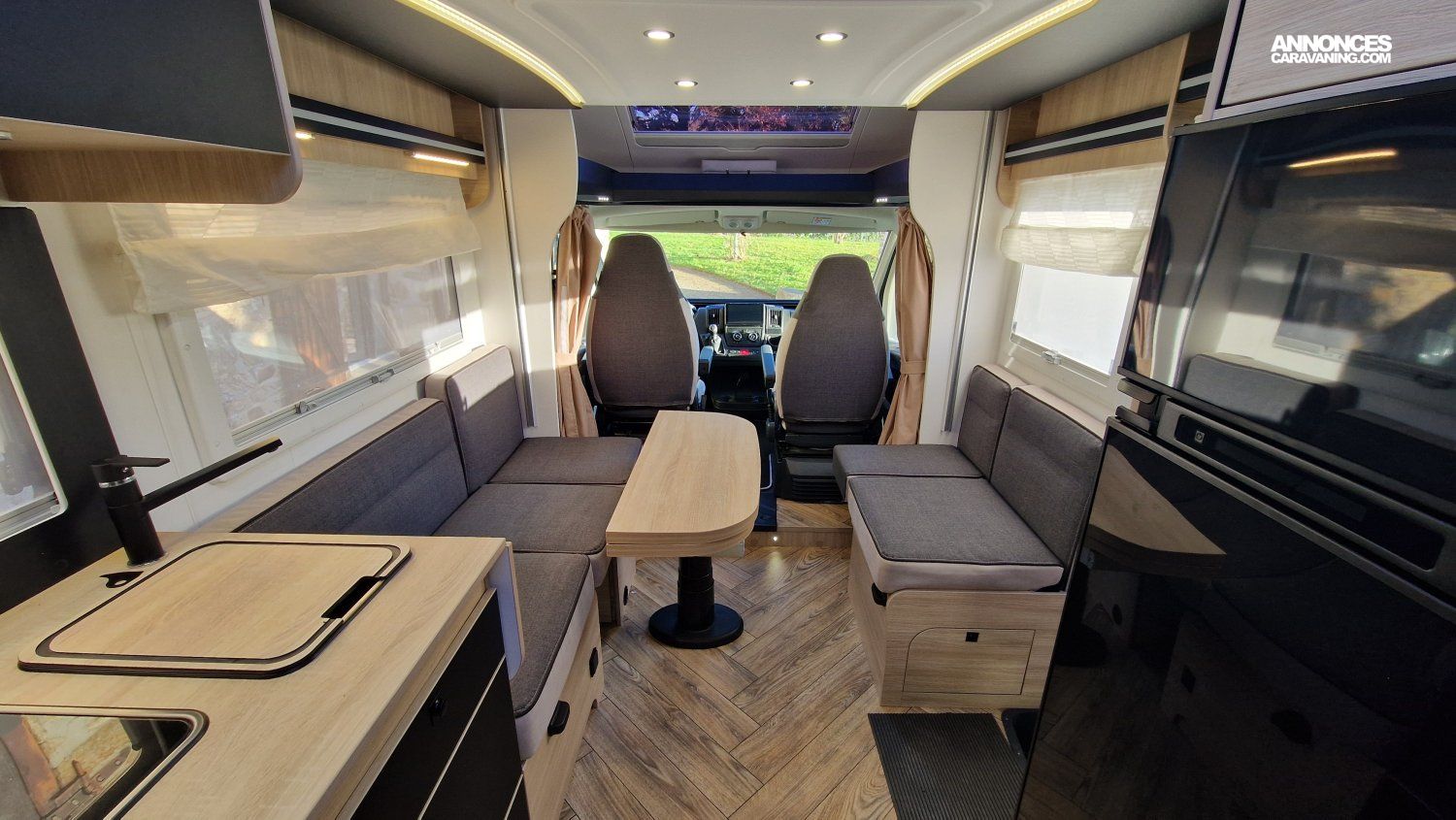 Une implantation idéale pour un couple pour voyager tout confort en toutes saisons : un lit de plafond électrique 2 positions et un lit d'appoint convertible, une cuisine bien équipée avec un grand réfrigérateur / congélateur trimix, un maxi salon convivial en face à face et une salle d'eau indépendante traversante donnant accès à un grand Dressing très logeable.