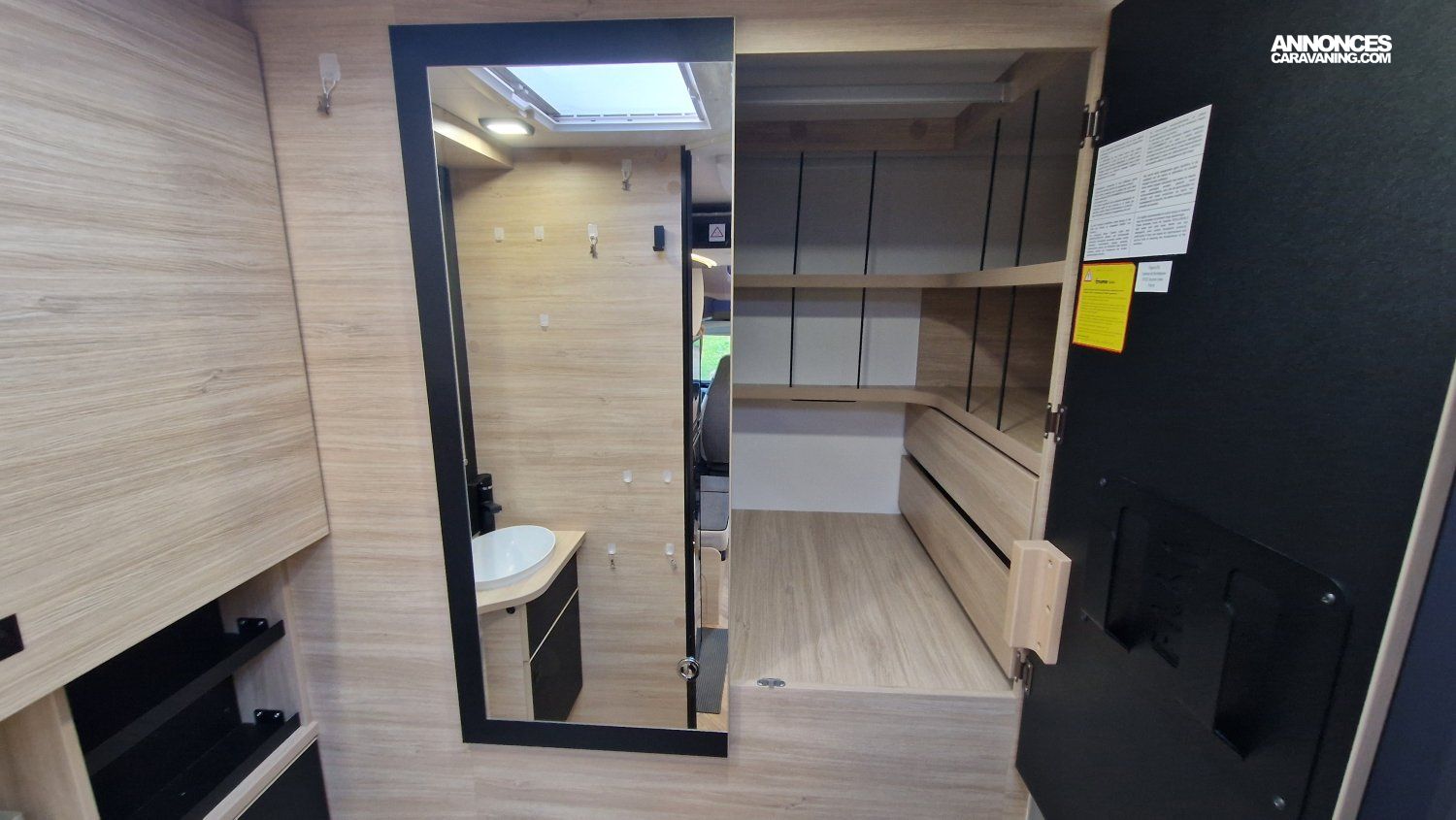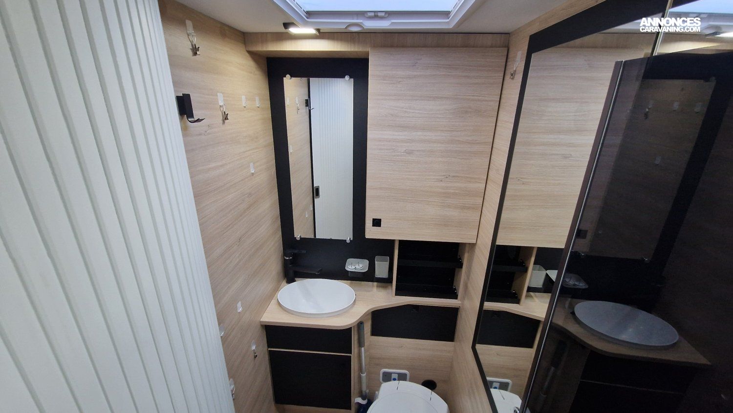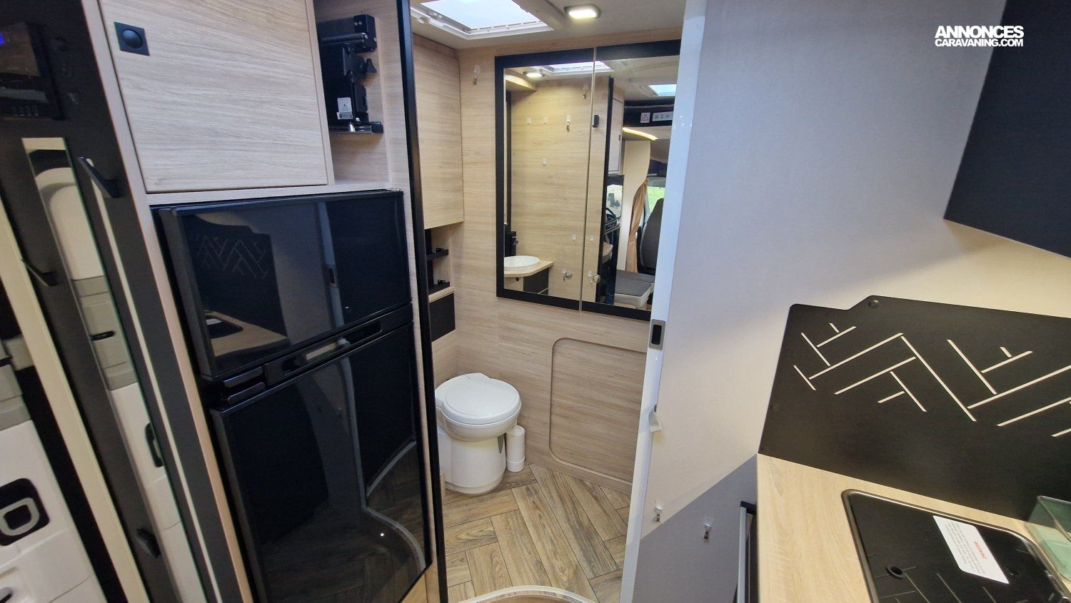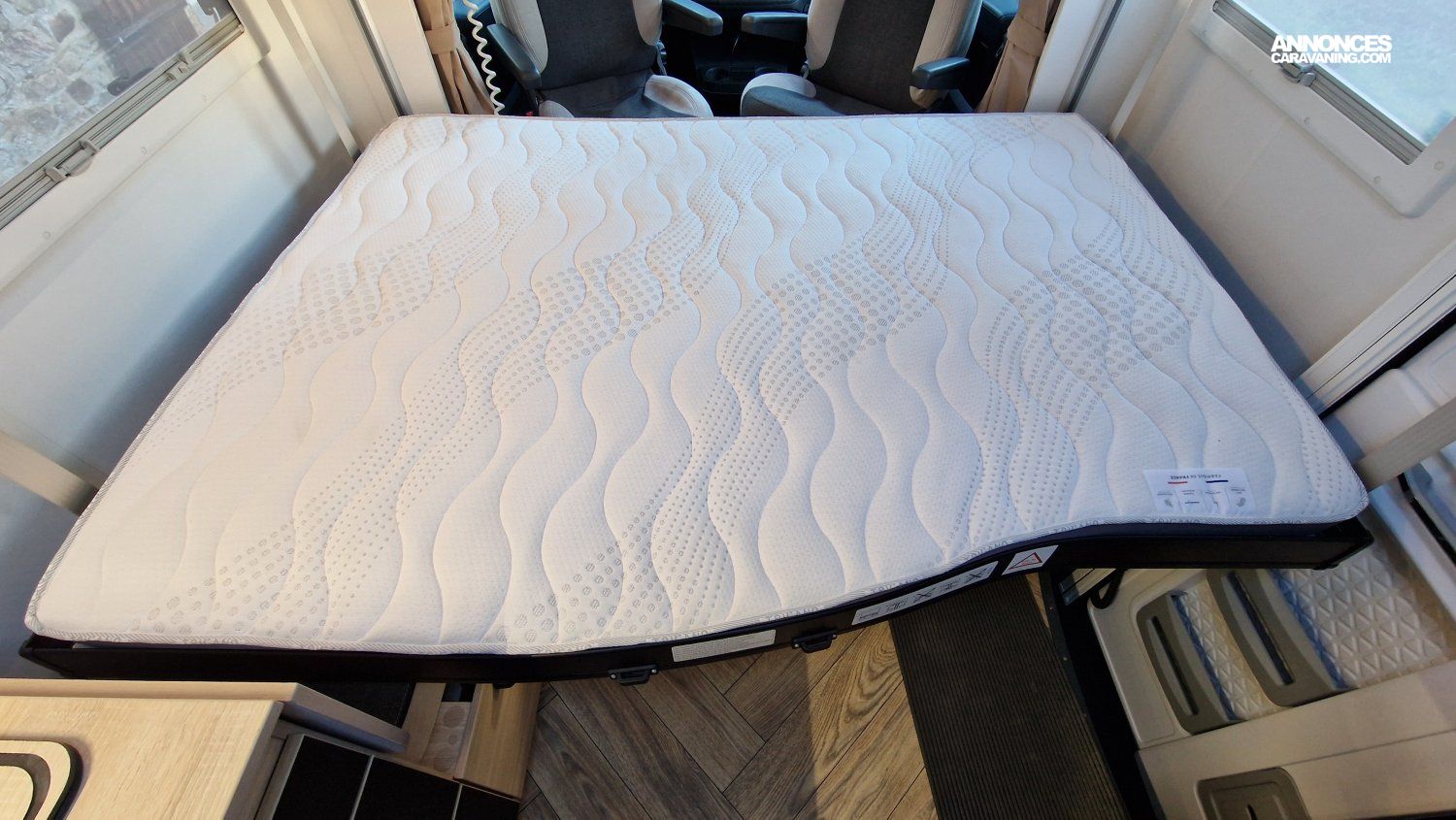 Une implantation idéale pour un couple pour voyager tout confort en toutes saisons : un lit de plafond électrique 2 positions et un lit d'appoint convertible, une cuisine bien équipée avec un grand réfrigérateur / congélateur trimix, un maxi salon convivial en face à face et une salle d'eau indépendante traversante donnant accès à un grand Dressing très logeable.