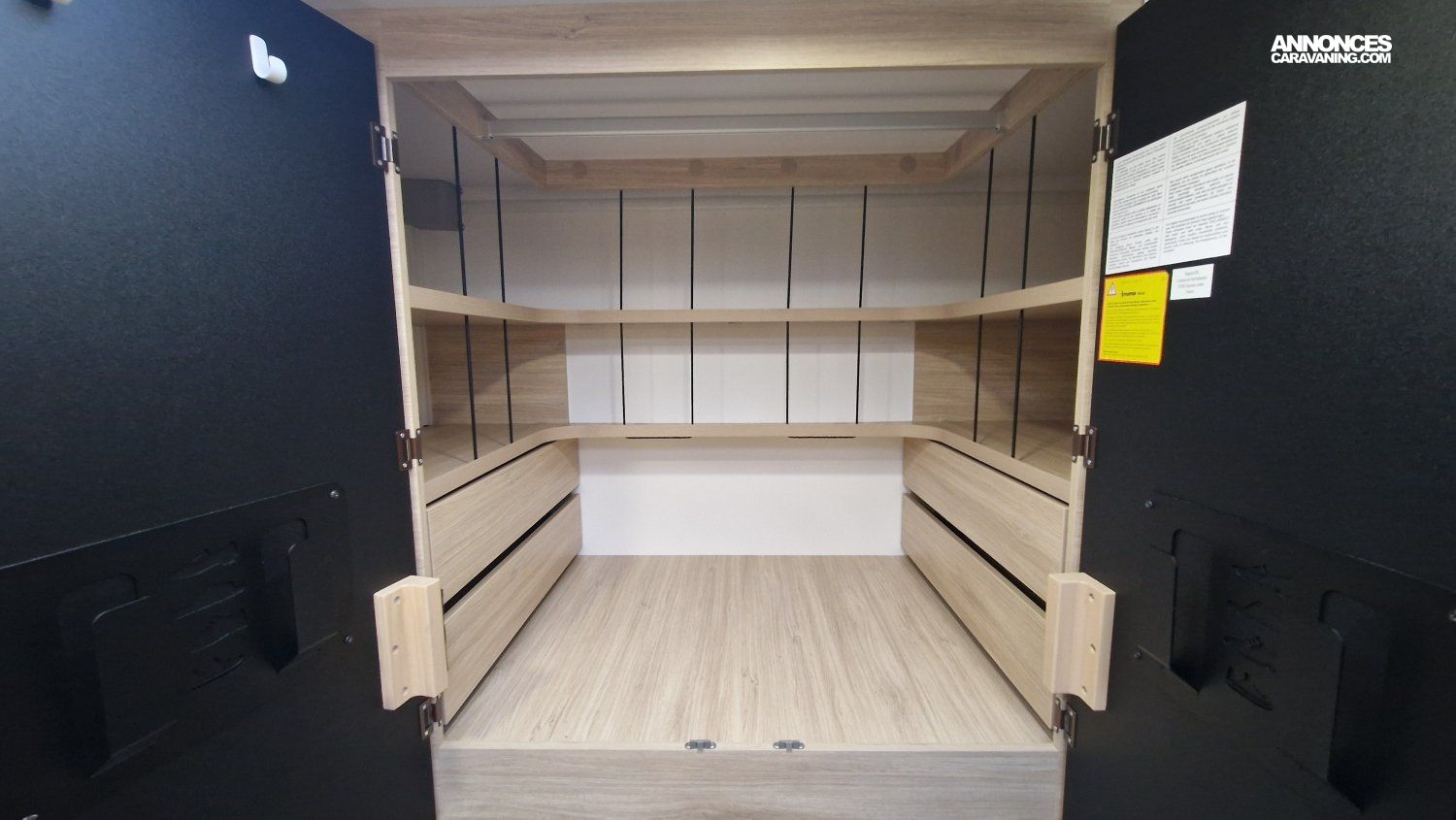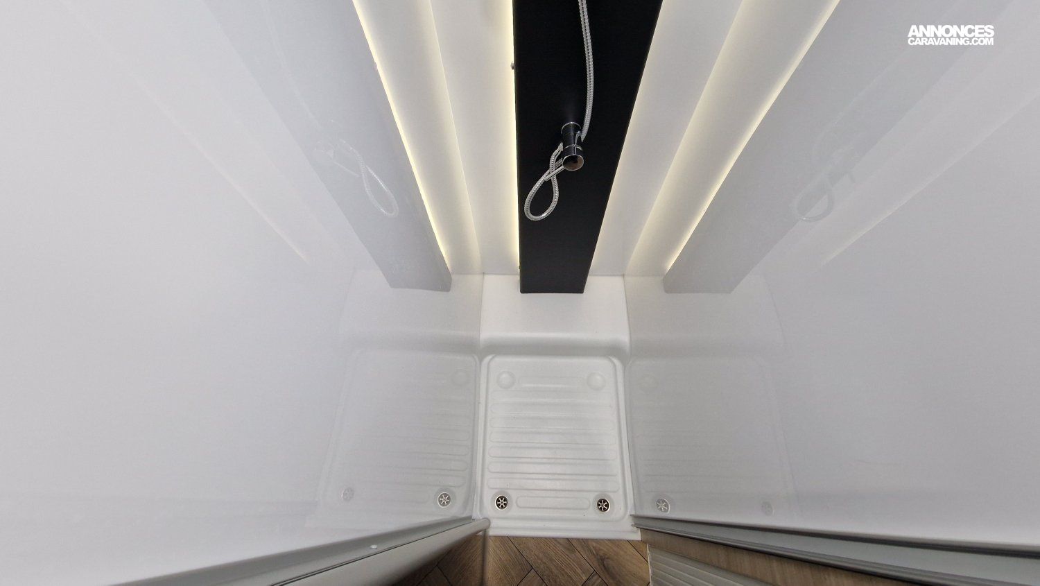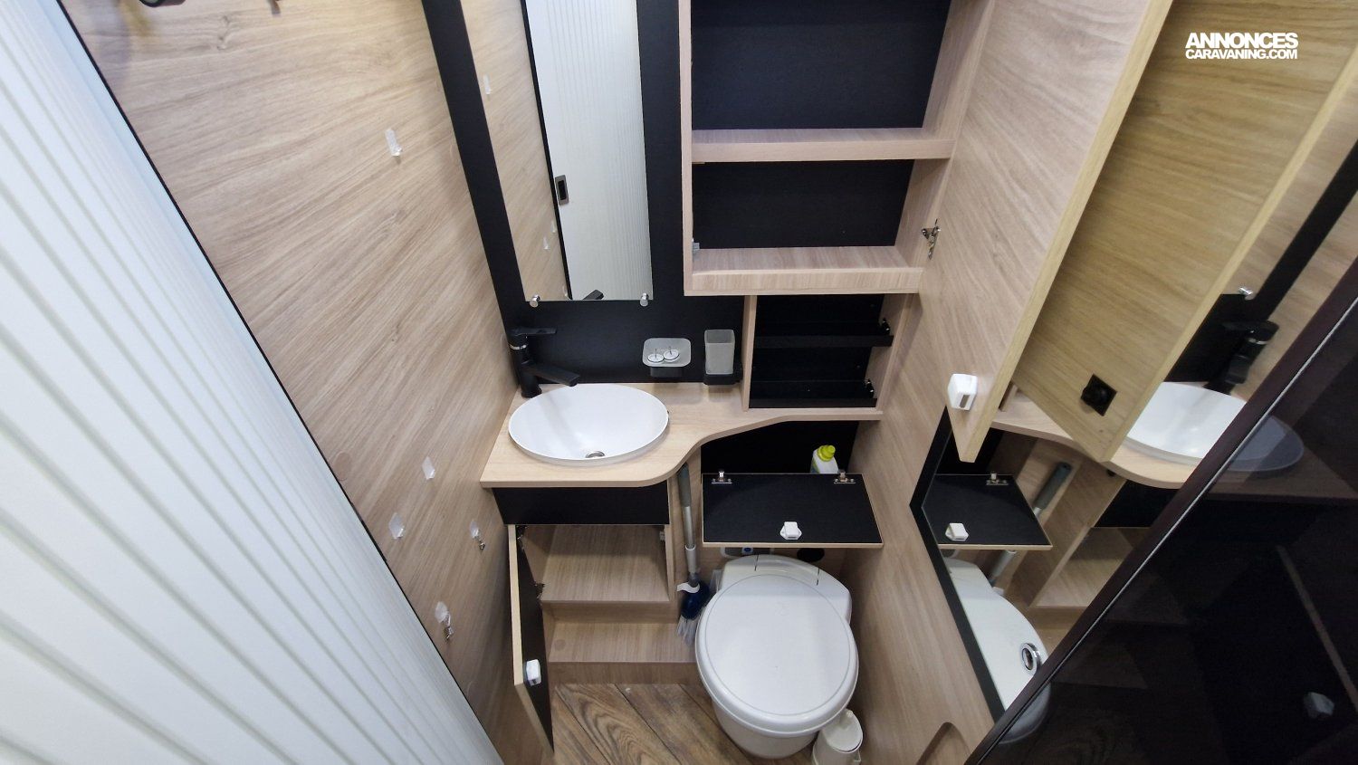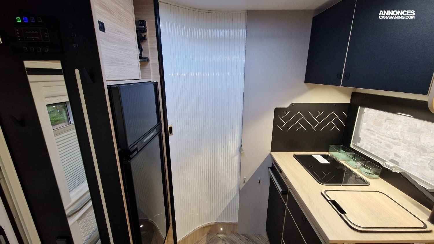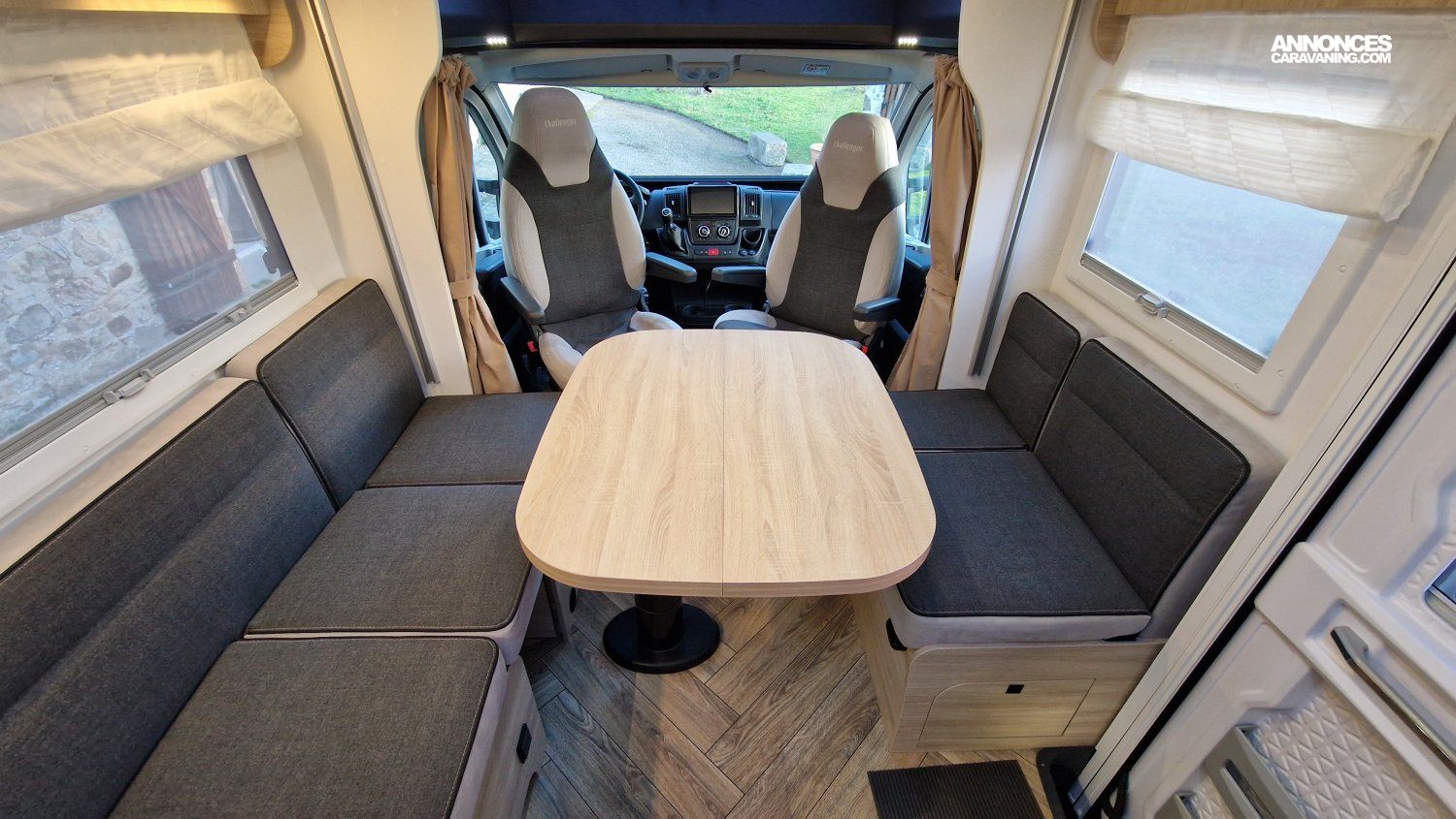 Une implantation idéale pour un couple pour voyager tout confort en toutes saisons : un lit de plafond électrique 2 positions et un lit d'appoint convertible, une cuisine bien équipée avec un grand réfrigérateur / congélateur trimix, un maxi salon convivial en face à face et une salle d'eau indépendante traversante donnant accès à un grand Dressing très logeable.