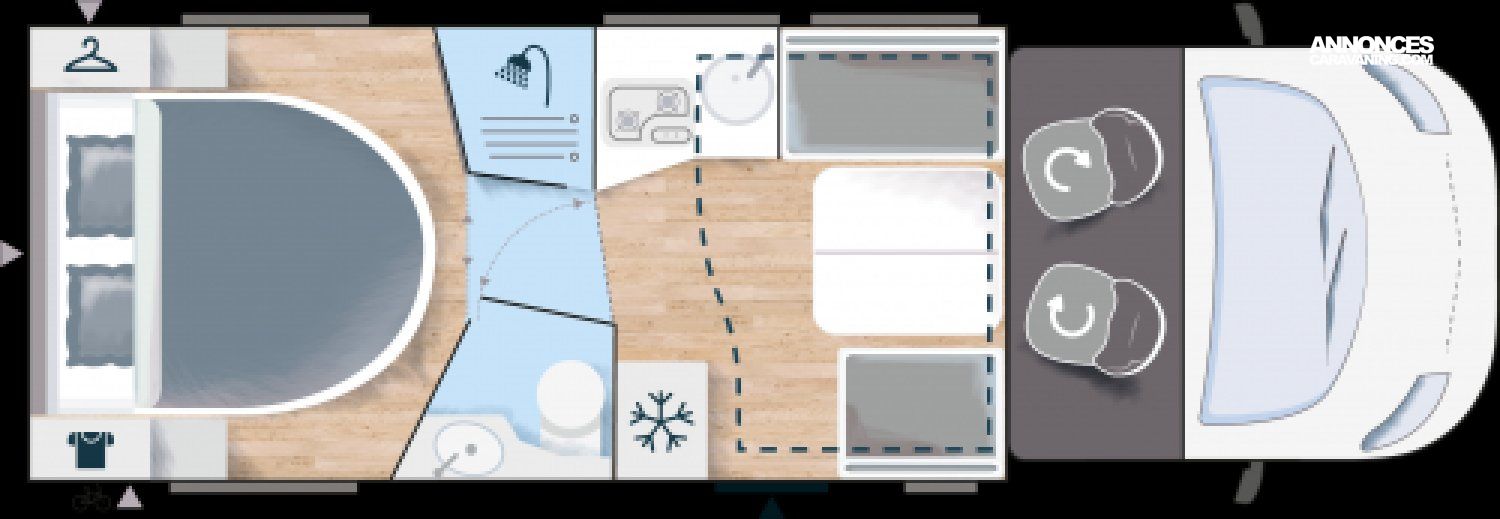 Fix and go, Climatisation manuelle cabine, Start & Stop, Chauffage sur carburant utilisable en roulant, Double airbag, Hill descent control, Rideaux de séparation cabine/cellule, Régulateur / limiteur de vitesses, ESP, Eclairage d'auvent, Rétroviseurs élecrtiques dégivrants, Toit panoramique cabine ouvrant, Sièges de cabine pivotants réglables en hauteur, Pneus 4 saisons, Traction +, Housses de sièges cabine assorties à l'ambiance cellule, Isolation marche d'entrée, Lanterneau panoramique (ou double lanterneau), Pare chocs avant peint, Penderie, Porte d'entrée avec fermeture centralisée porteur cellule, Prise USB/USB-C, Pré-disposition panneau solaire, Pré-équipement TV, Précâblage caméra de recul, Fenêtre double-vitrage avec combiné stores moustiquaire, Feux anti-brouillard, Voilages, Fixations Isofix