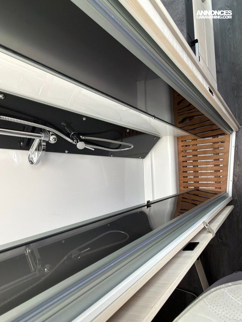 Moustiquaire de porte, Panneau solaire, Prise de gaz extérieure, Régulateur / limiteur de vitesse, kit pose 2ème batterie, Boite automatique 6 rapports, Caillebotis de douche, Climatisation manuelle de cabine, Double airbag, Douchette extérieure, ESP, Jantes alliage 16’’ noires, Feux antibrouillards, Rétroviseurs électriques dégivrants, Store intérieur cabine, Éclairage extérieur porte d'entrée, Store extérieur, Chauffage sur carburant utilisable en roulant