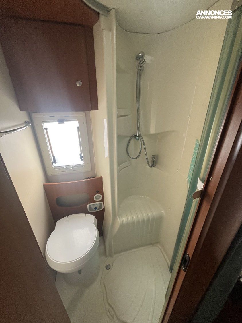 Bac de douche, Cuisine en L, Lit central transversal, Maxi salon, WC Cassette.