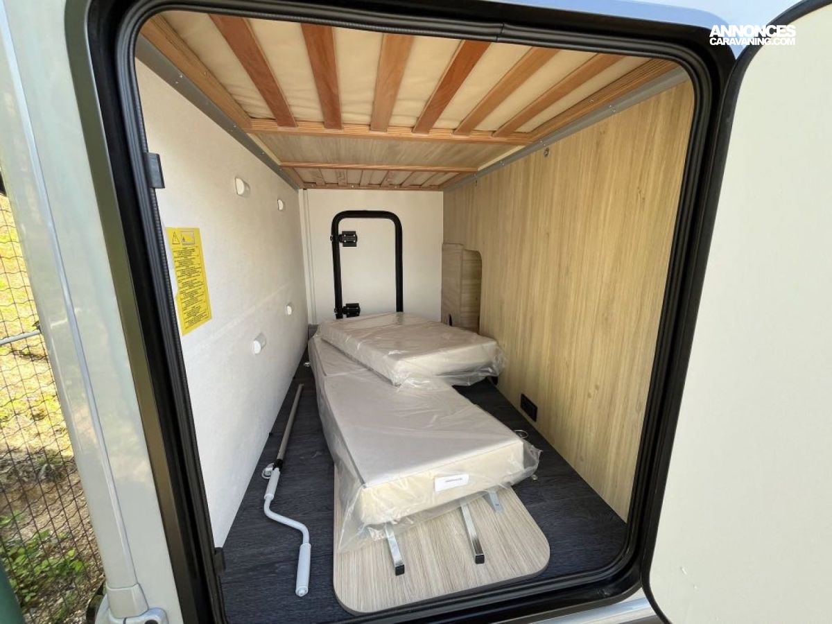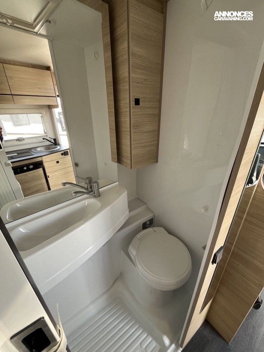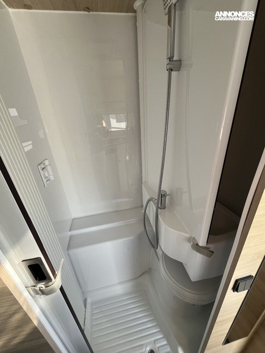 Douche modulable, lit jumeaux, Salon avant sièges pivotants, Soute, WC Cassette.