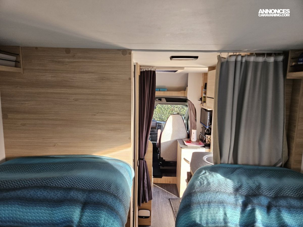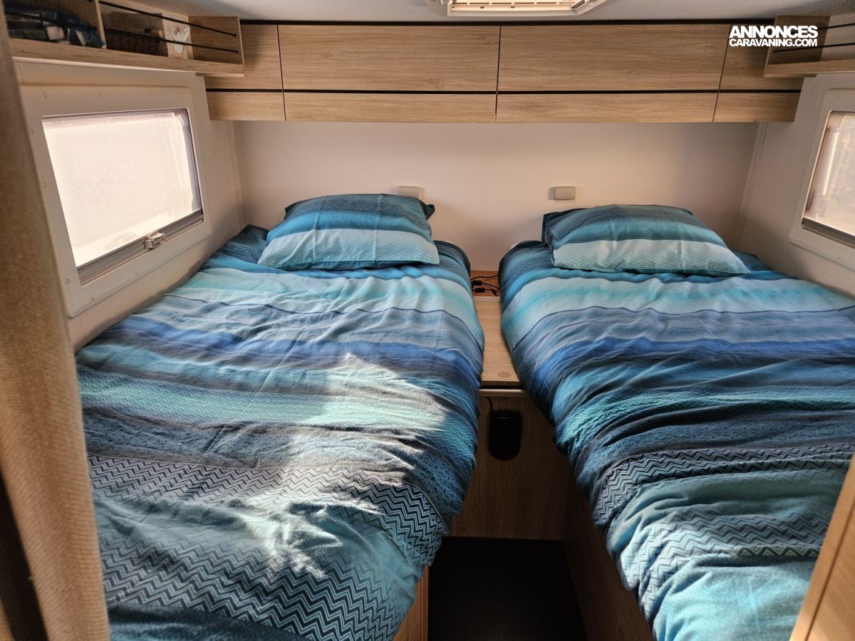 La salle de bain avec son système modulable pour la partie douche est très fonctionnelle et l'implantation des lits jumeaux permet de bénéficier d'une grande soute.