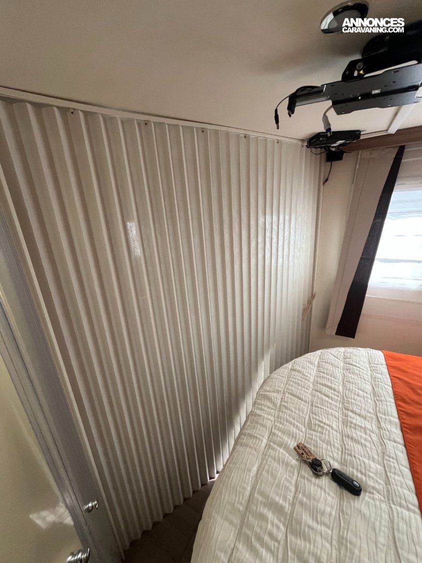 ---- cales avec housse, lit tout fait, dérouleur tuyau eau et papier, rallonge électrique d’alimentation, élargissement du passage autour du lit avec cloison amovible, placards de rangement et penderies.