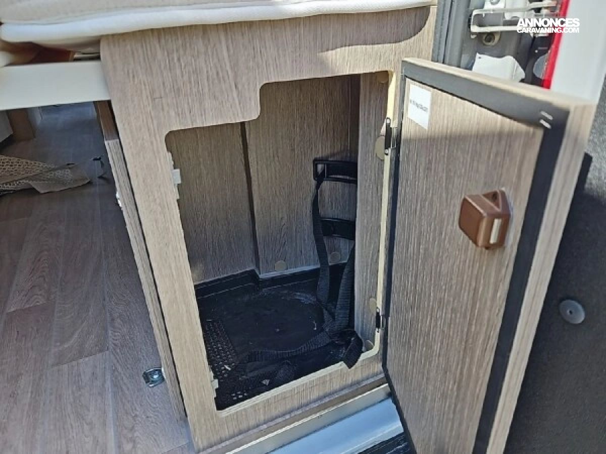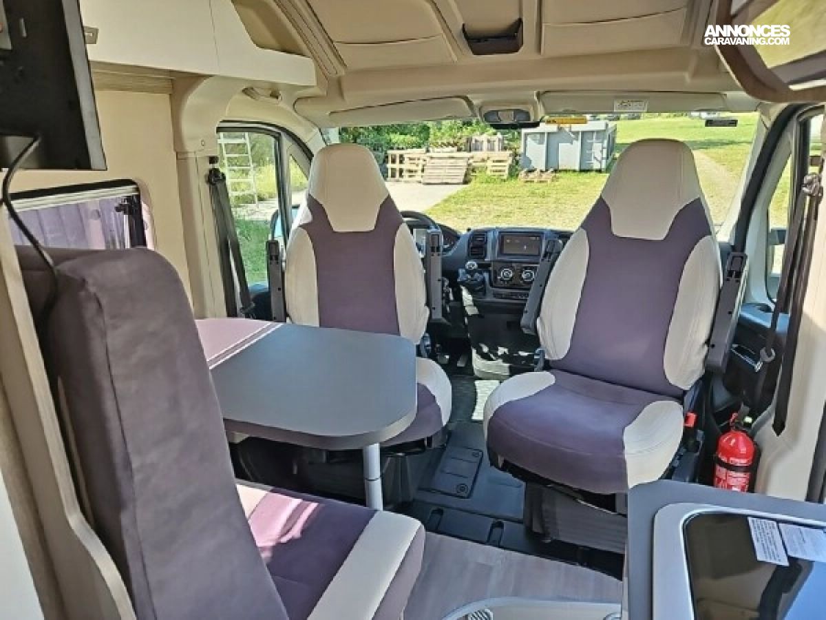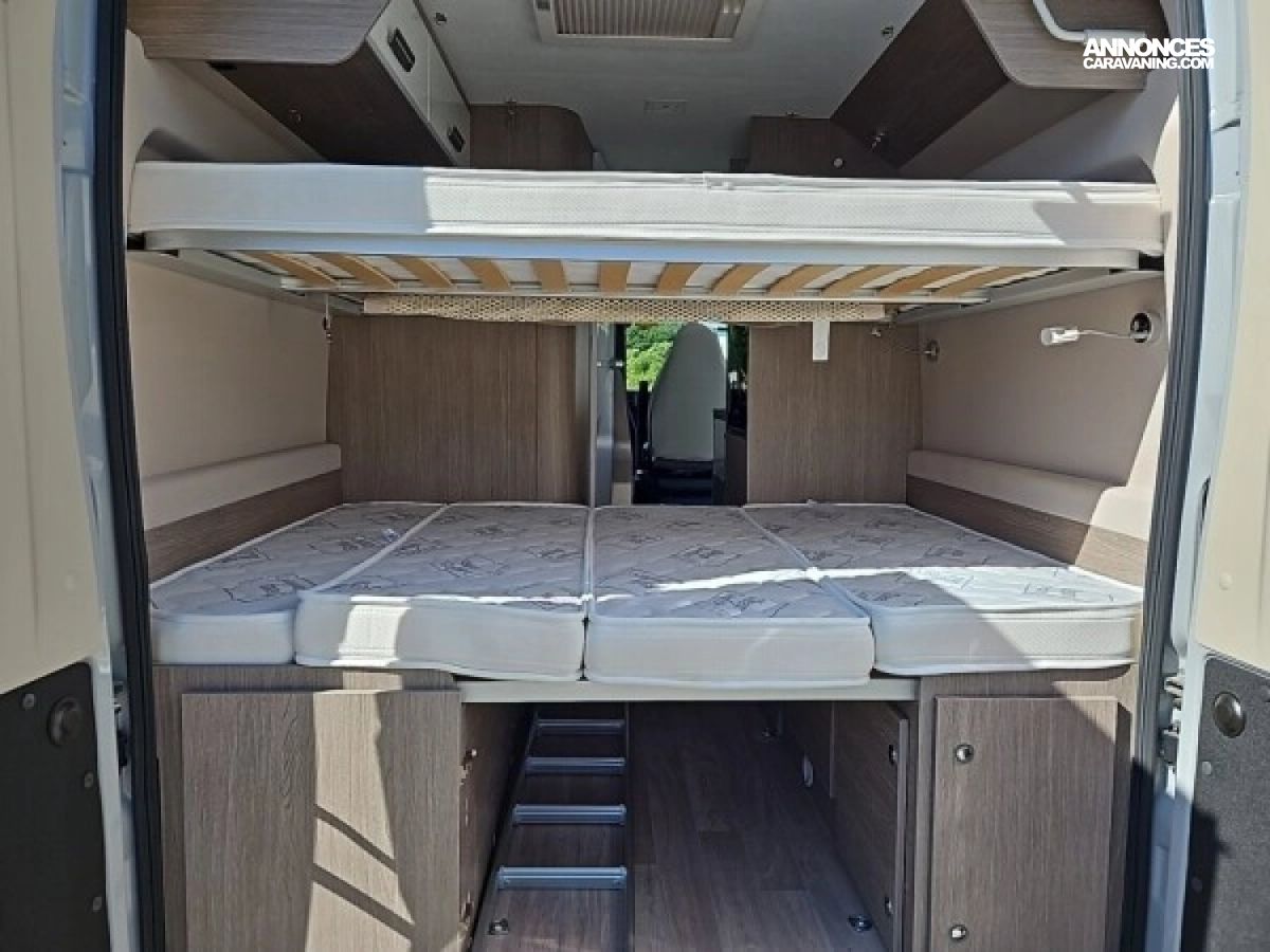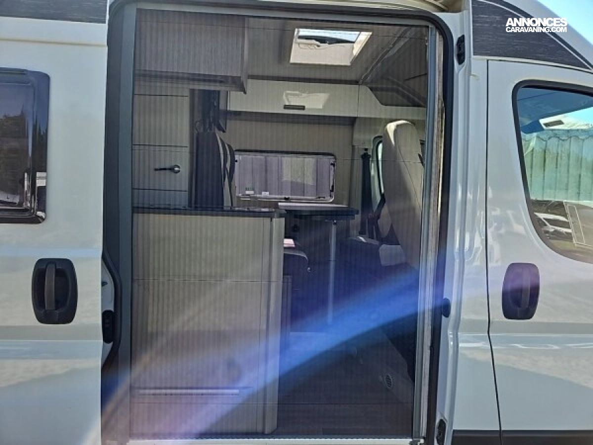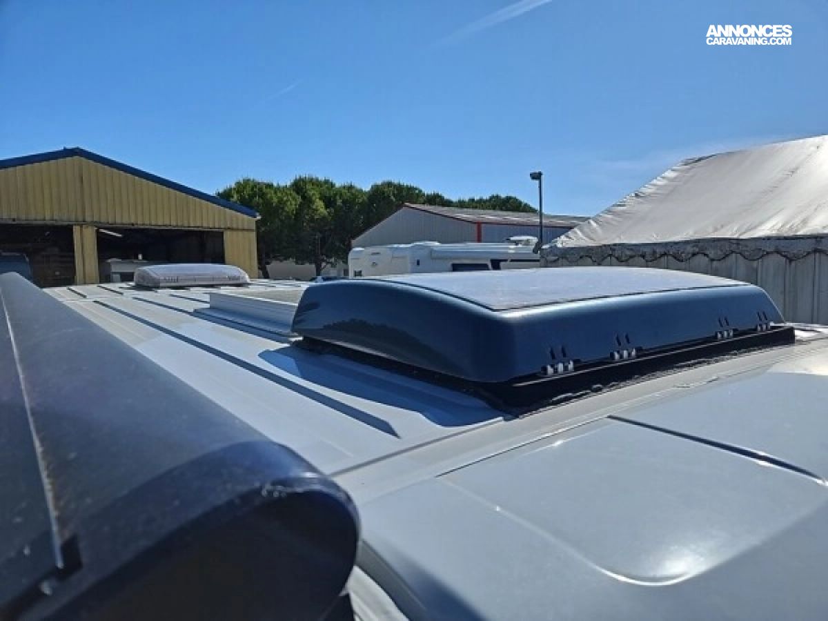 • Climatisation manuelle de cabine • Double airbag • Sièges de cabine pivotants réglables en hauteur avec double accoudoir • Rétroviseurs électriques/dégivrants • Régulateur/limiteur de vitesse • Prédisposition radio avec haut-parleurs cabine • Antenne radio DAB • Traction + • Calandre/contour phares noirs • Prises USB • Jantes alliage 16’’ noires • Salle d'eau avec fenêtre • Baies arrières ouvrantes • Lanterneau panoramique 700x500 mm • Extension table dinette • Support table extérieure • Éclairage intérieur 100 % LED • Panneau solaire • Store extérieur • Marchepied électrique • Eco pack (Stop&Start, alternateur intelligent, pompe à carburant à gestion électronique) • Motorisation 2.2L 140 CH / 103 kW • Housses de siège cabine assorties à l’ambiance cellule • Chauffage sur carburant utilisable en roulant à commande digitale programmable • Moustiquaire de porte • Maxi cab • Grands tiroirs en cuisine • Rangements additionnels arrières • Penderie • Salle d’eau avec paroi repliable • Éclairage extérieur • Décoration extérieure spécifique • Mobilier et tissu spécifique • Isolation renforcée "VPS" • Pack + VIP : Châssis 35L, antibrouillards avec cornering, Système multimédia avec commandes au volant et Caméra de recul • Stores d'occultation cabine