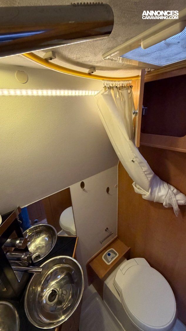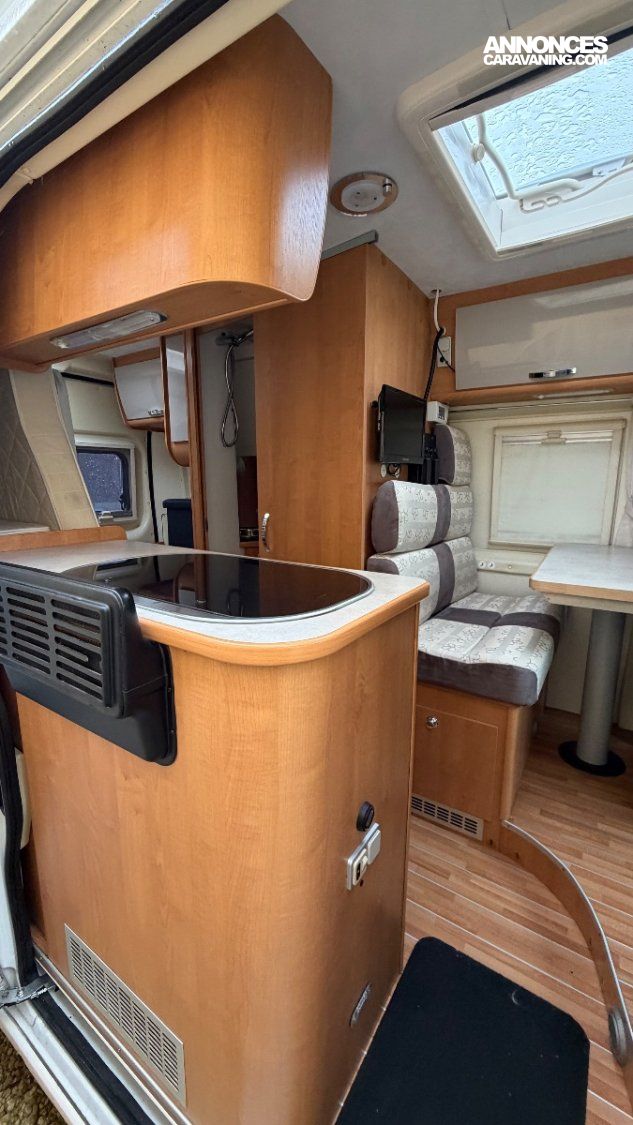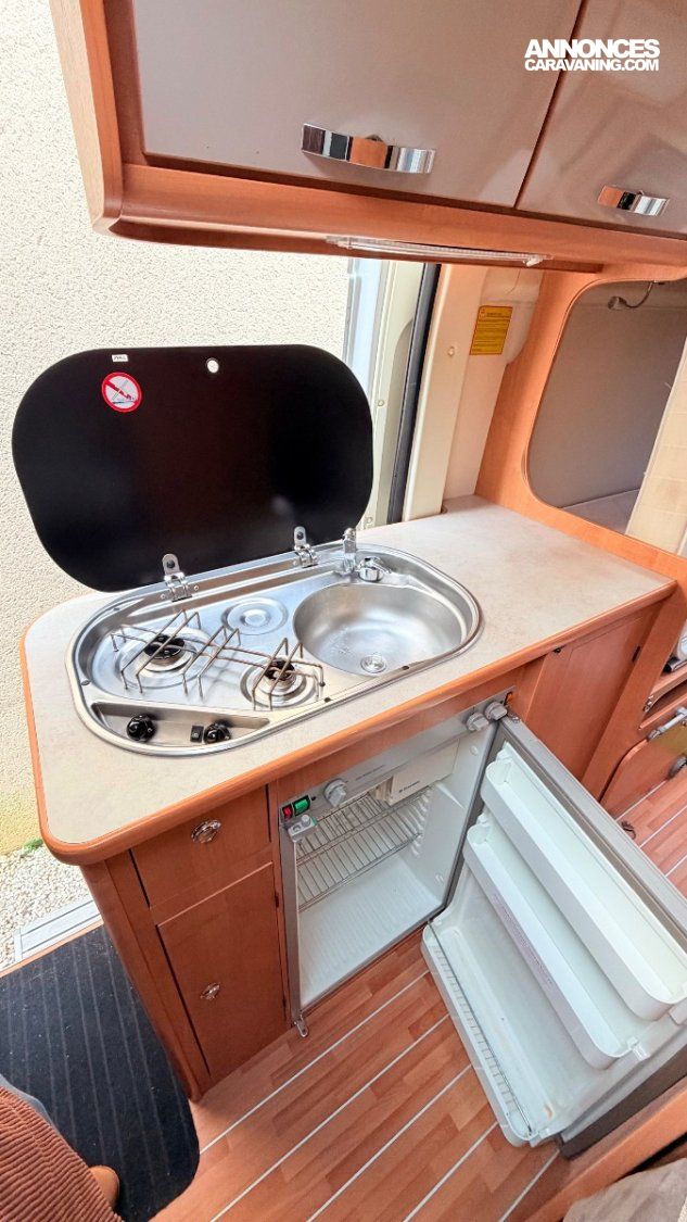Cuisine latérale : 2 feux gaz, réfrigérateur 80 L (gaz / 12 V / 220 V)