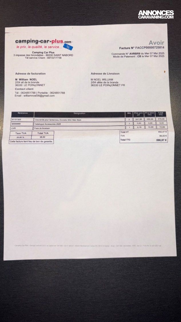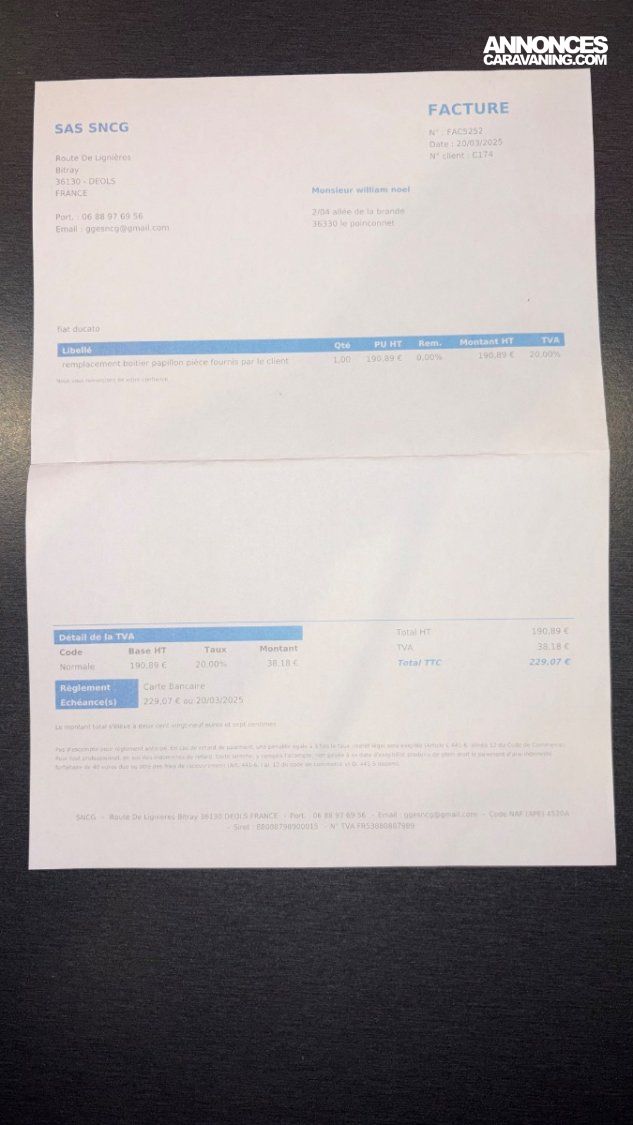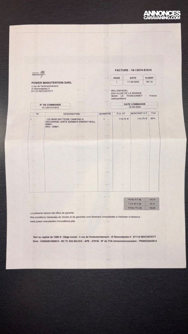 Factures fournies lors de la vente et consultables par mail sur demande.