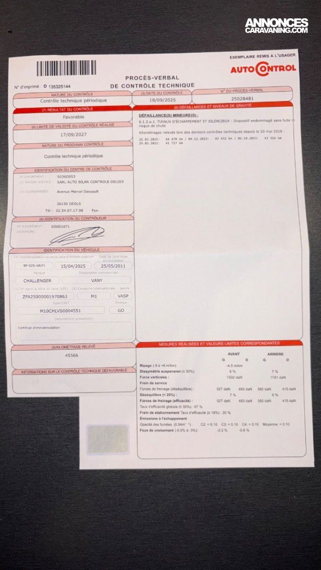 ✅ Contrôle technique favorable du 18/09/2025 – valable jusqu’au 17/09/2027