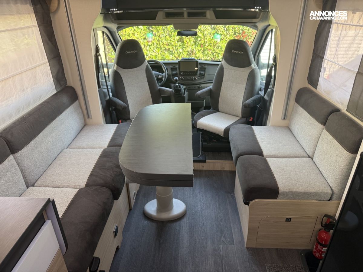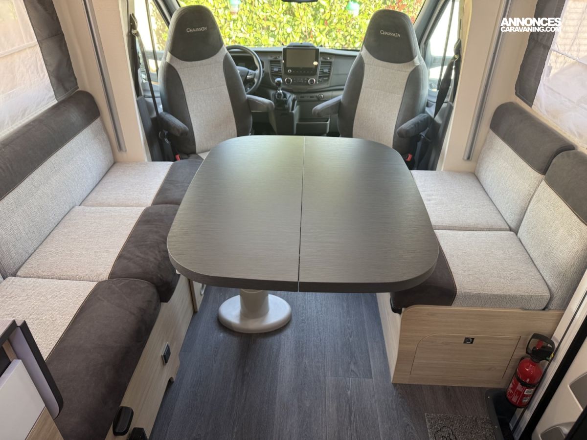 L’aménagement exclusif du Chausson 650 combine un vaste salon face à face lumineux, un grand plan de travail en cuisine avec rangements optimisés, une salle d’eau indépendante avec douche séparée, et une soute généreuse pour le transport de matériel ou de bagages.
