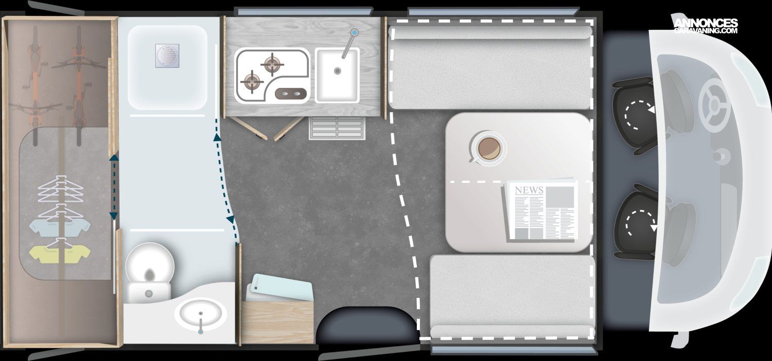 De belles capacités de rangements et de la compacité : Voici le camping-car profilé 650 ! A l'arrière un grand dressing et une soute pour accueillir les vélos, salle d'eau transversale et à l'avant le salon Smart Lounge et un lit de pavillon pour deux. A noter le passage de la porte d'entrée mesure 60 cm de large.