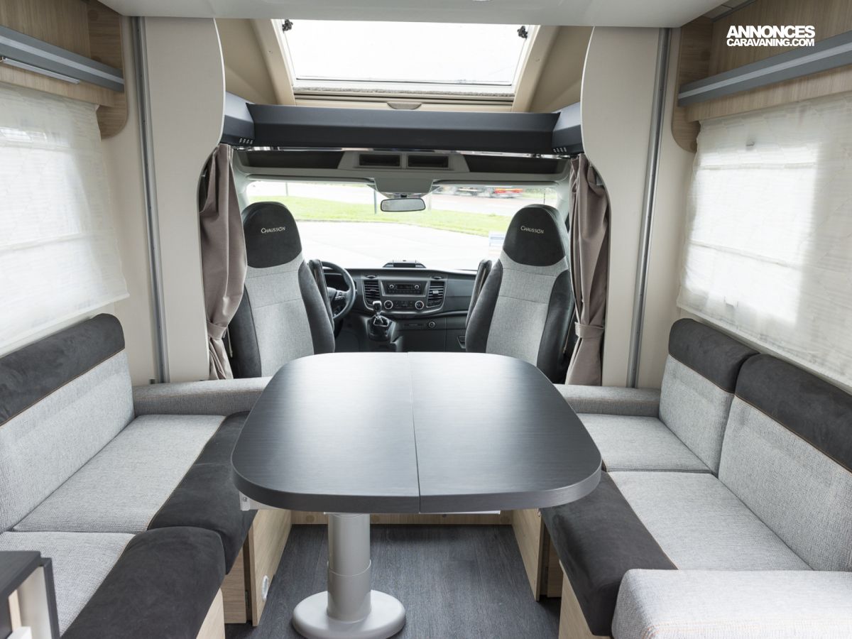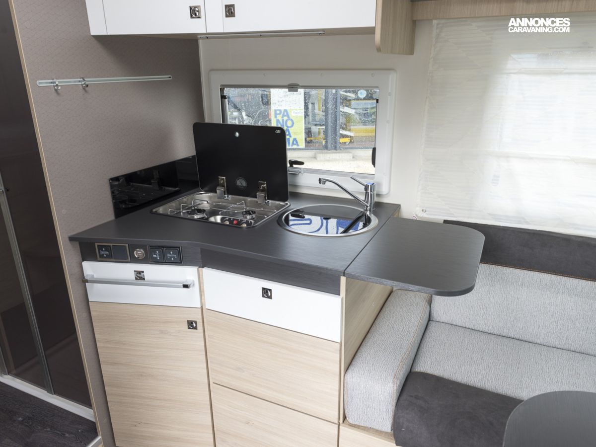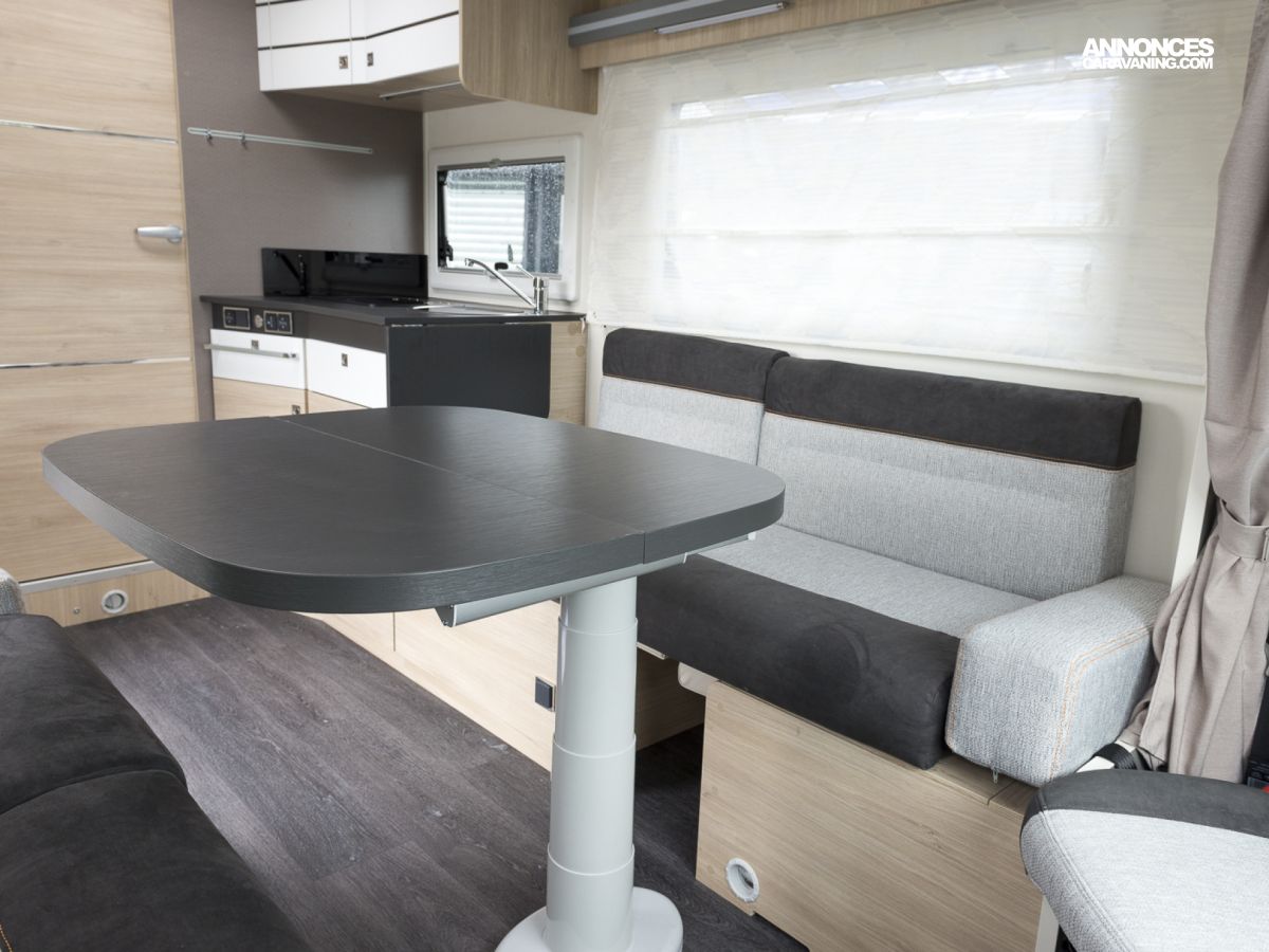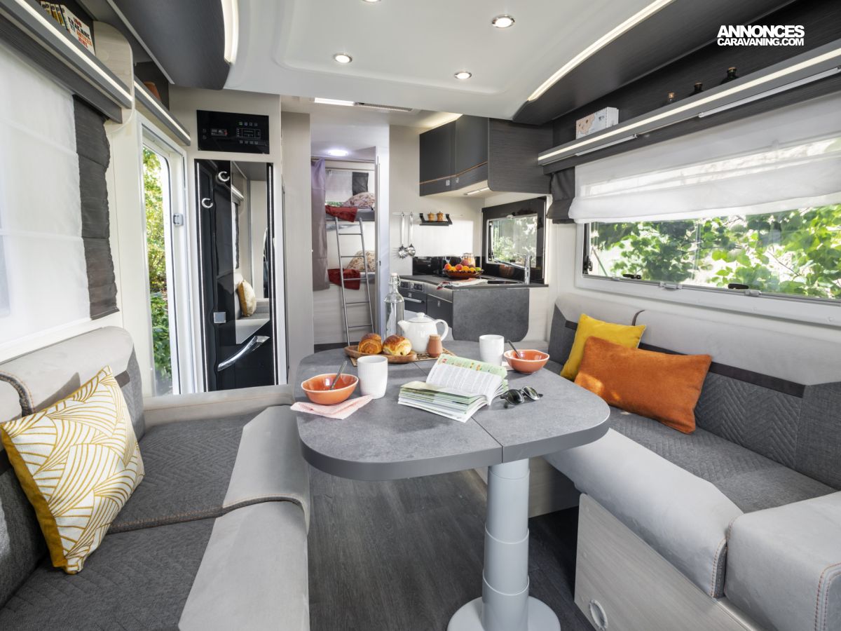 Avec ses dimensions plus qu'acceptables, ce véhicule vous propose un immense salon face-face avec une table modulable électriquement surmonté d'un grand lit pavillon (160 x 200), une belle cuisine fonctionnelle ainsi qu’une salle d'eau avec douche indépendante cloisonnée.