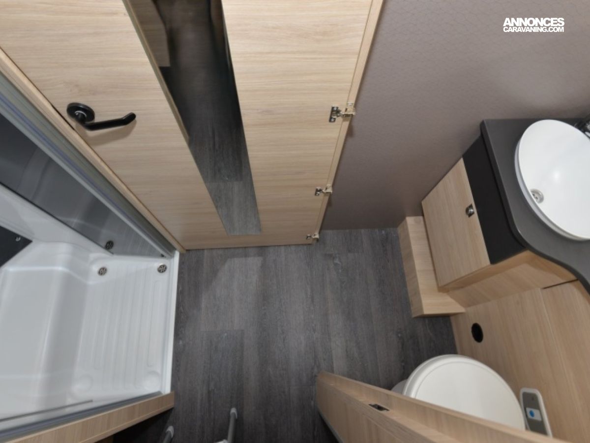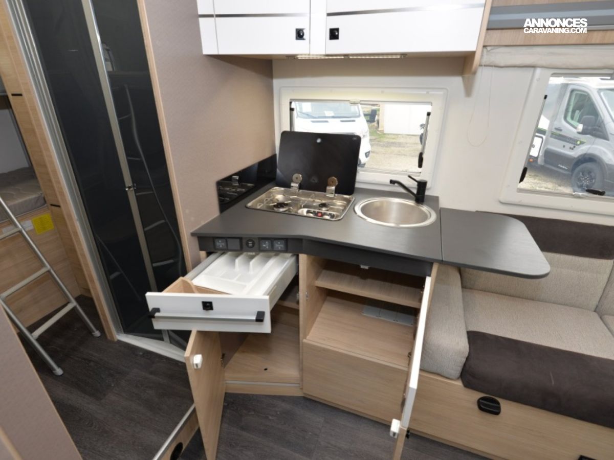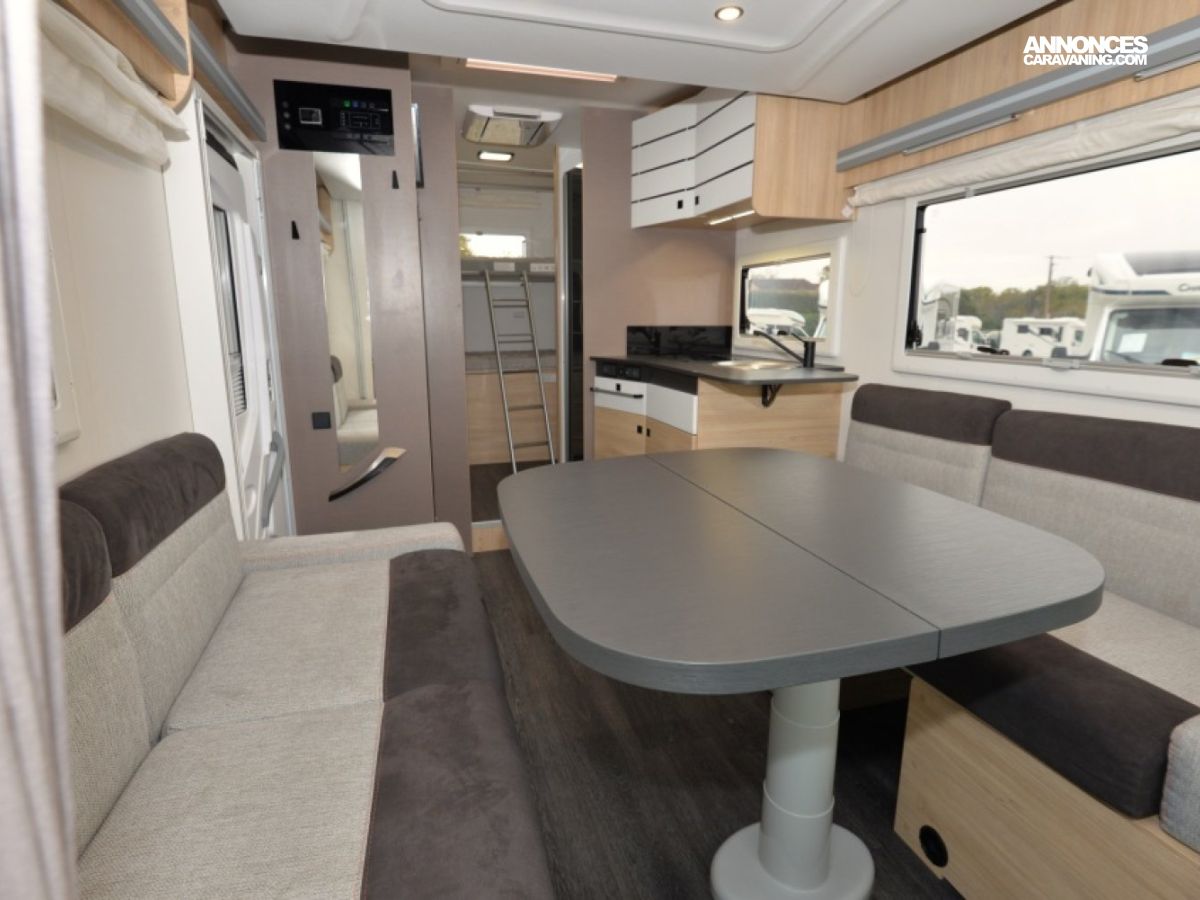 Avec ses dimensions plus qu'acceptables, ce véhicule vous propose un immense salon face-face avec une table modulable électriquement surmonté d'un grand lit pavillon (160 x 200), une belle cuisine fonctionnelle ainsi qu’une salle d'eau avec douche indépendante cloisonnée.