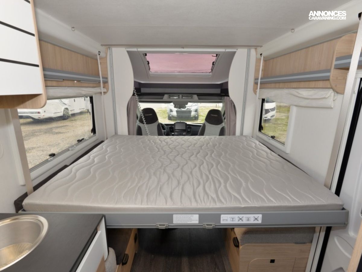 La nouveauté apparaît au niveau du couchage arrière, 2 lits superposés sur soute réglables en hauteur, le lit du dessous est également doté de coffres de rangements, et en variant sa hauteur vous libérerez de l'espace pour votre soute !