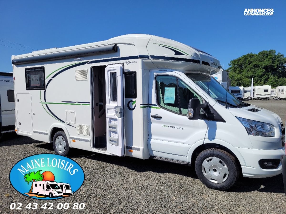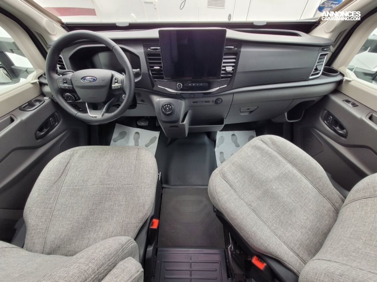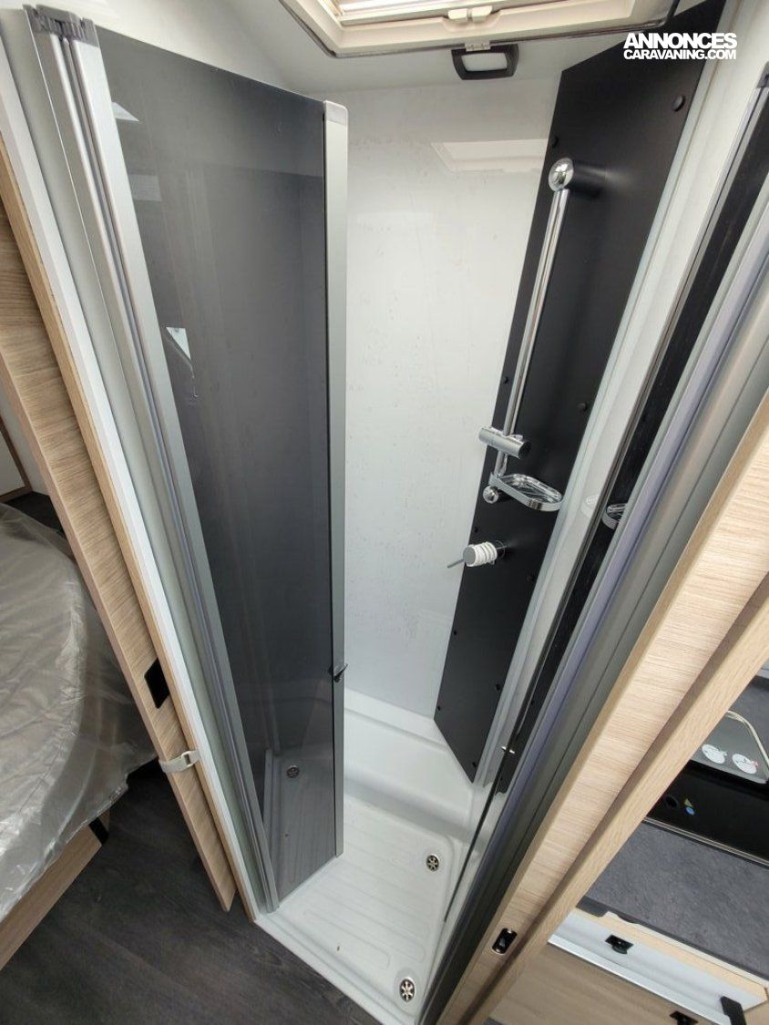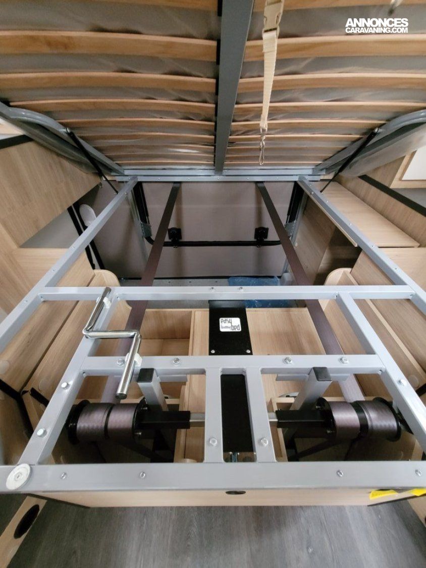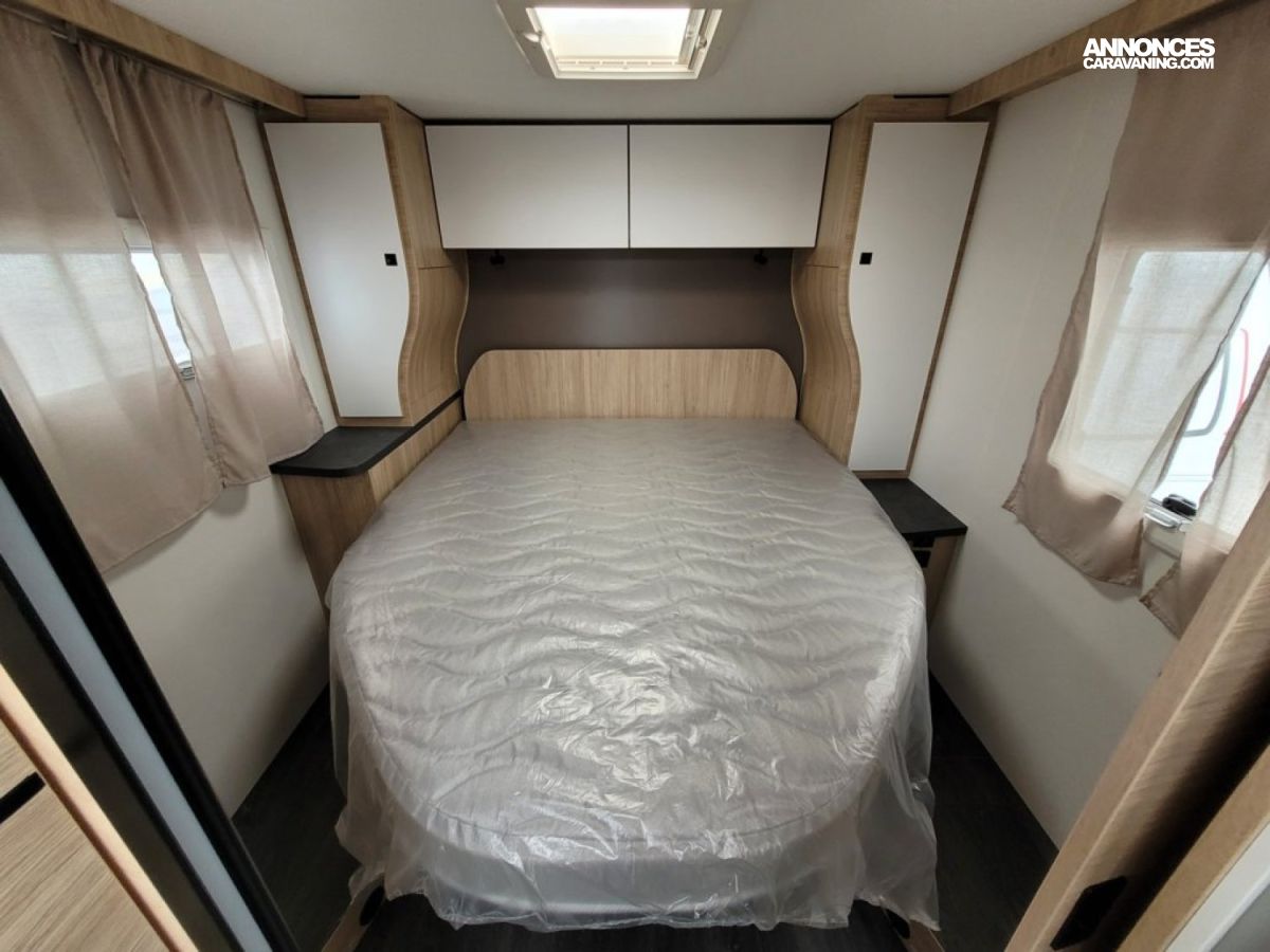 Cuisine en long, Douche indépendante, Grande soute, Lit central, lit pavillon, Salon avant banquettes face à face, Salon avant sièges pivotants, WC Cassette.