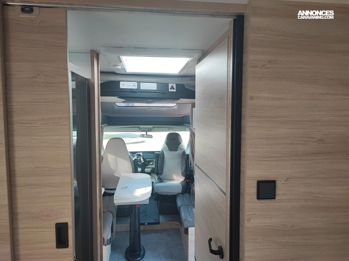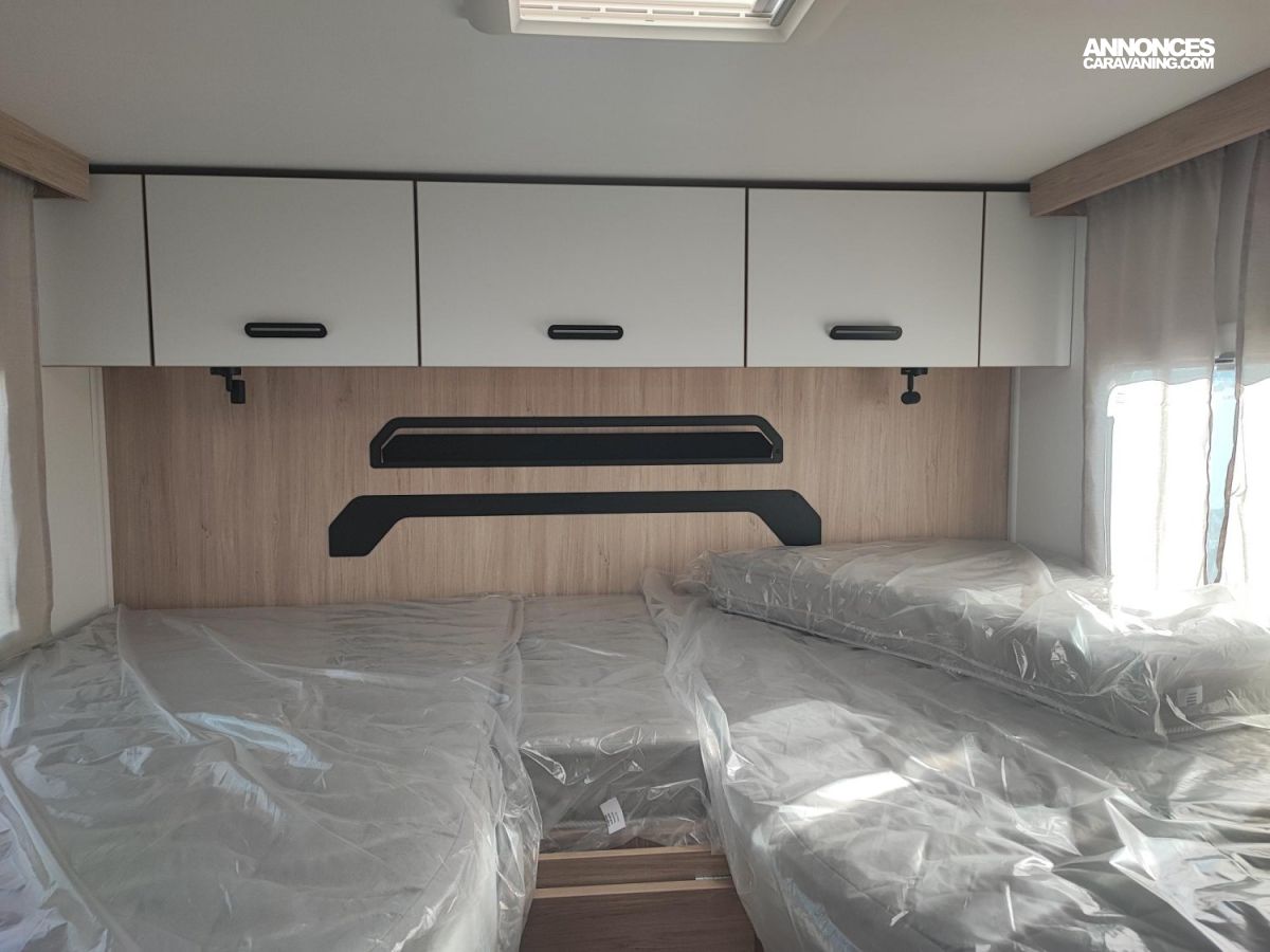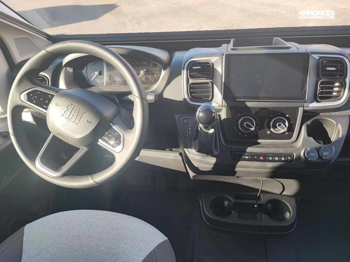Chassis blanc, Chauffage sur carburant utilisable en roulant, Climatisation manuelle, Double airg bag, Feux antibrouillard, Hill descent control, Housses sièges cabine, Isolation marche d entrée, Pack connect, Pneus 4 saisons, Prises USB/USB-C, Rideaux de sépatration chambre, Réfrigérateur 140 L, Régulateur / limiteur de vitesse, Rétroviseurs électriques dégivrants, Sièges pivotants réglables en hauteur, Toit panoramique cabine ouvrant, Traction + / ESP / ECO PACK FIAT, Tête de lit