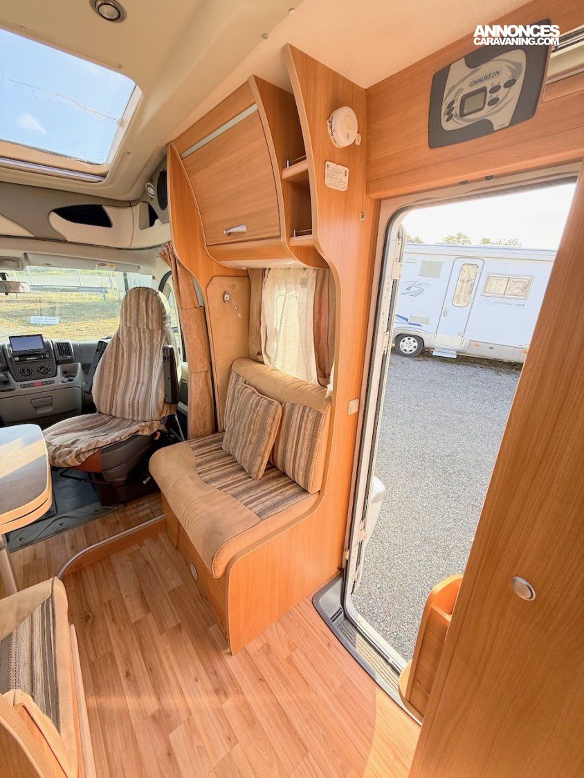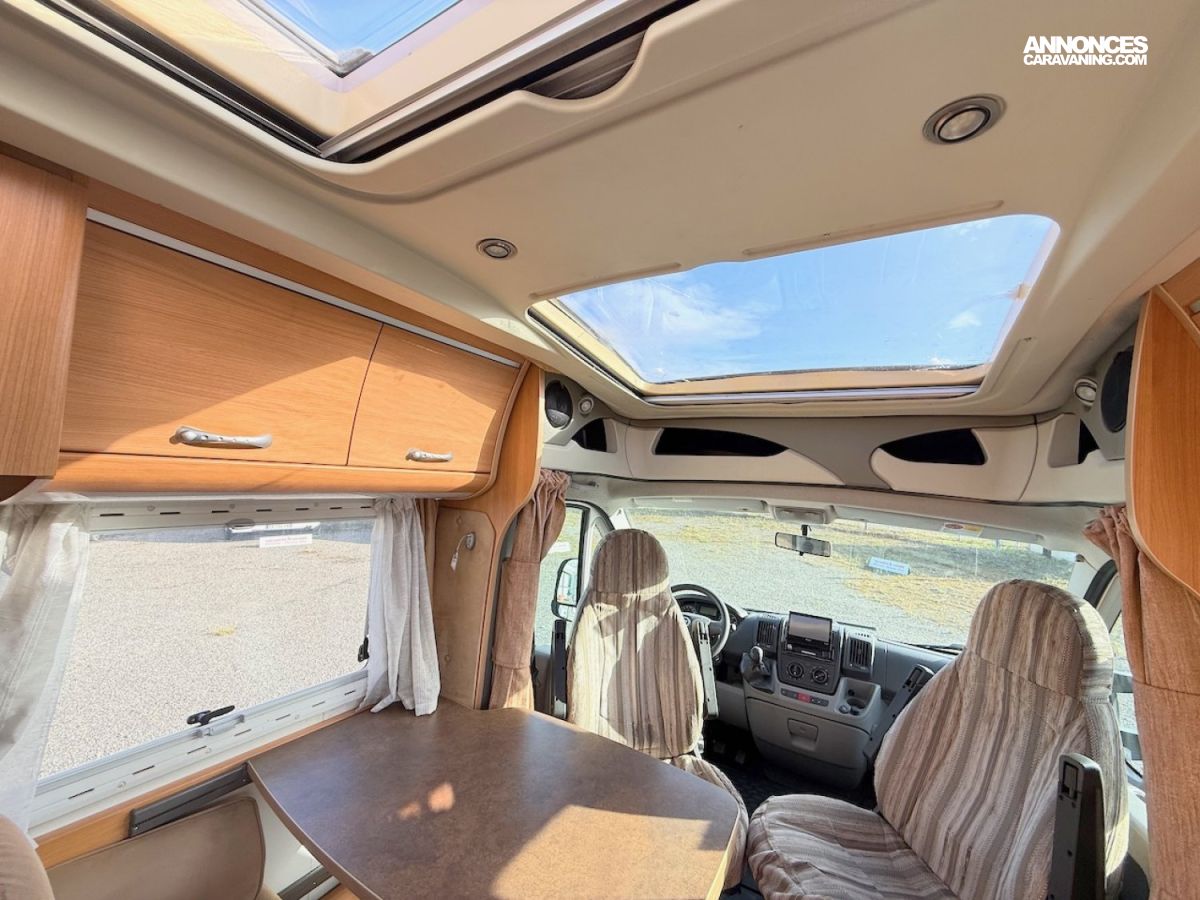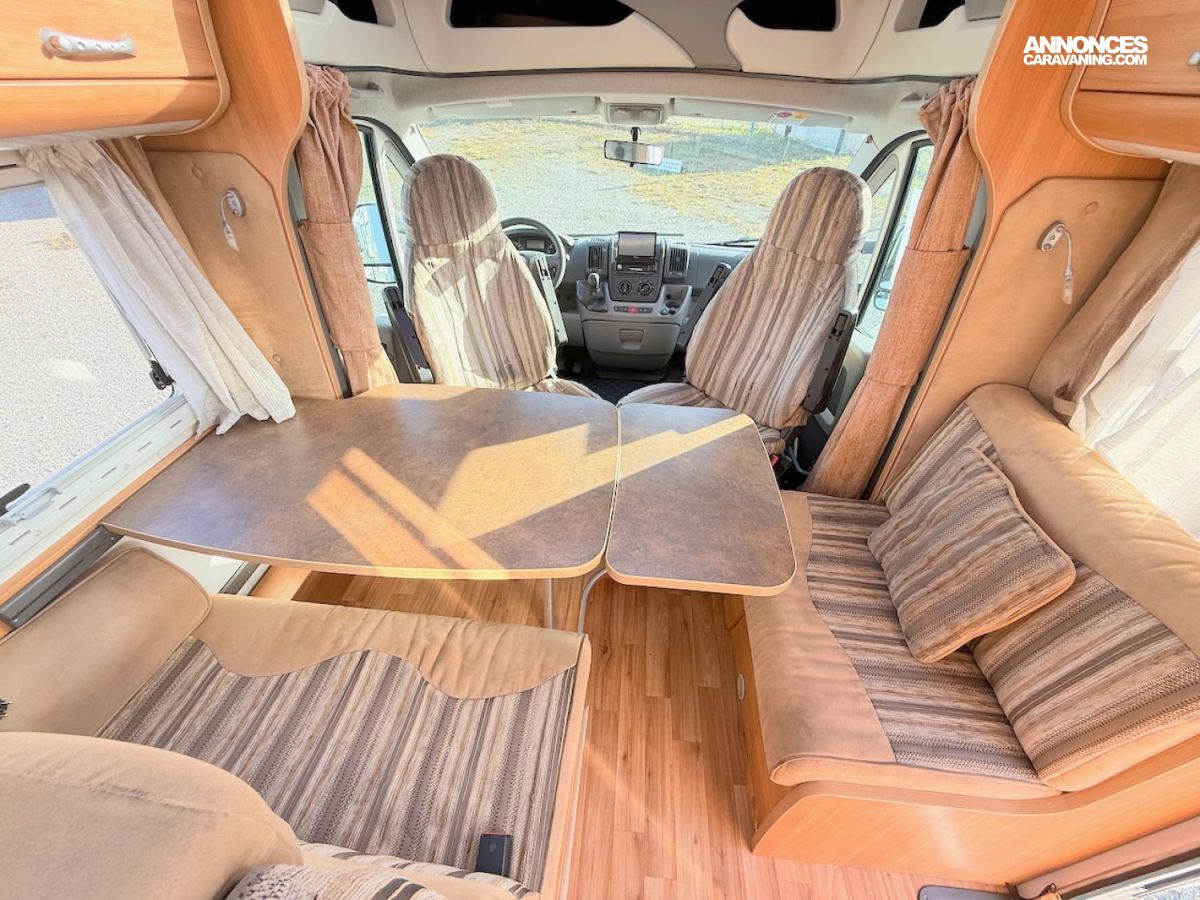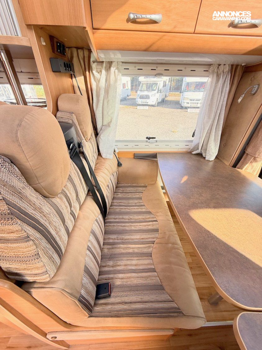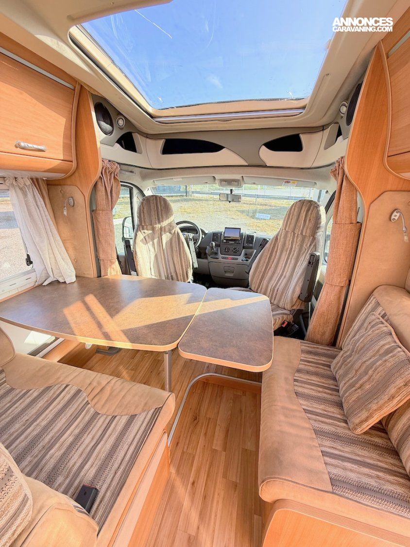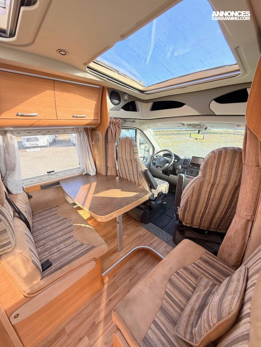 Camping-car profilé d’occasion, offrant 4 places carte grise et 3 couchages grâce à un lit sur soute permanent (électrique)(206 x 132 cm) à l’arrière, et un lit dînette (210 x 120 cm).