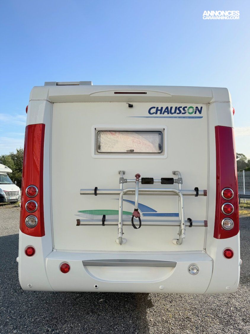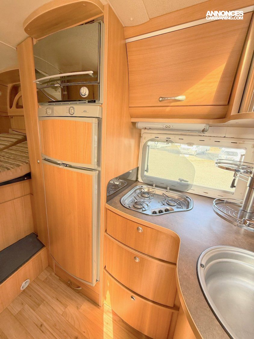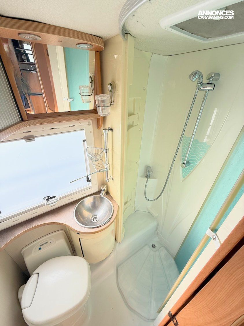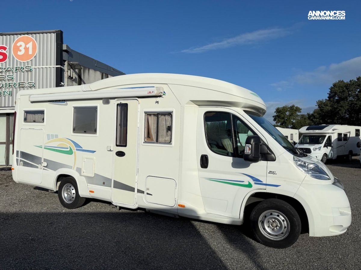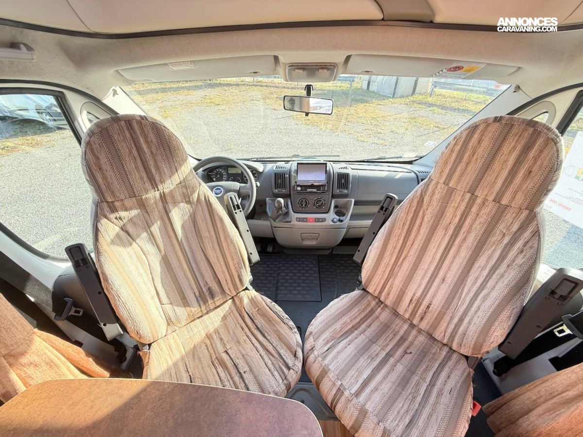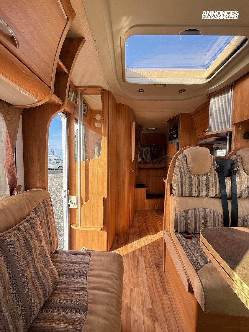 Camping-car profilé d’occasion, offrant 4 places carte grise et 3 couchages grâce à un lit sur soute permanent (électrique)(206 x 132 cm) à l’arrière, et un lit dînette (210 x 120 cm).