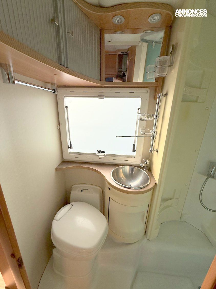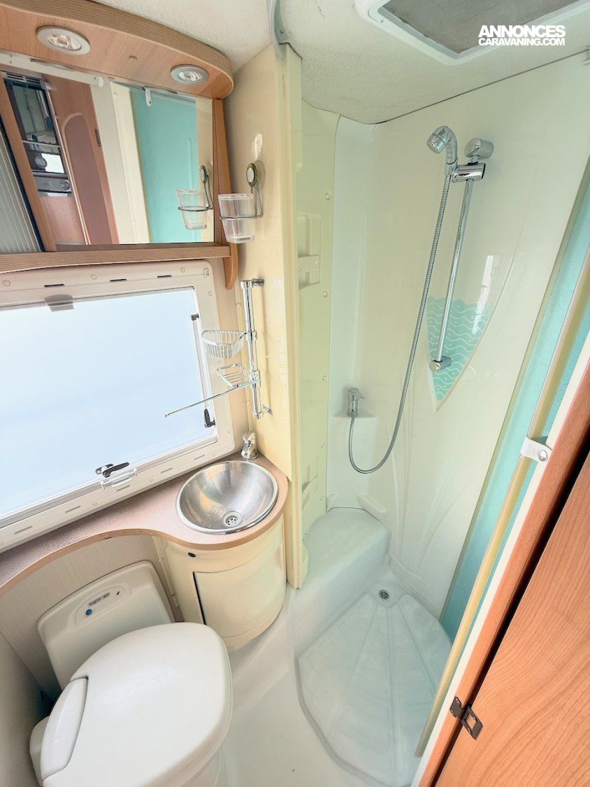 La salle de bain spacieuse, sur le bord droit, se compose d'une douche, d'un lavabo et d'un wc cassette.