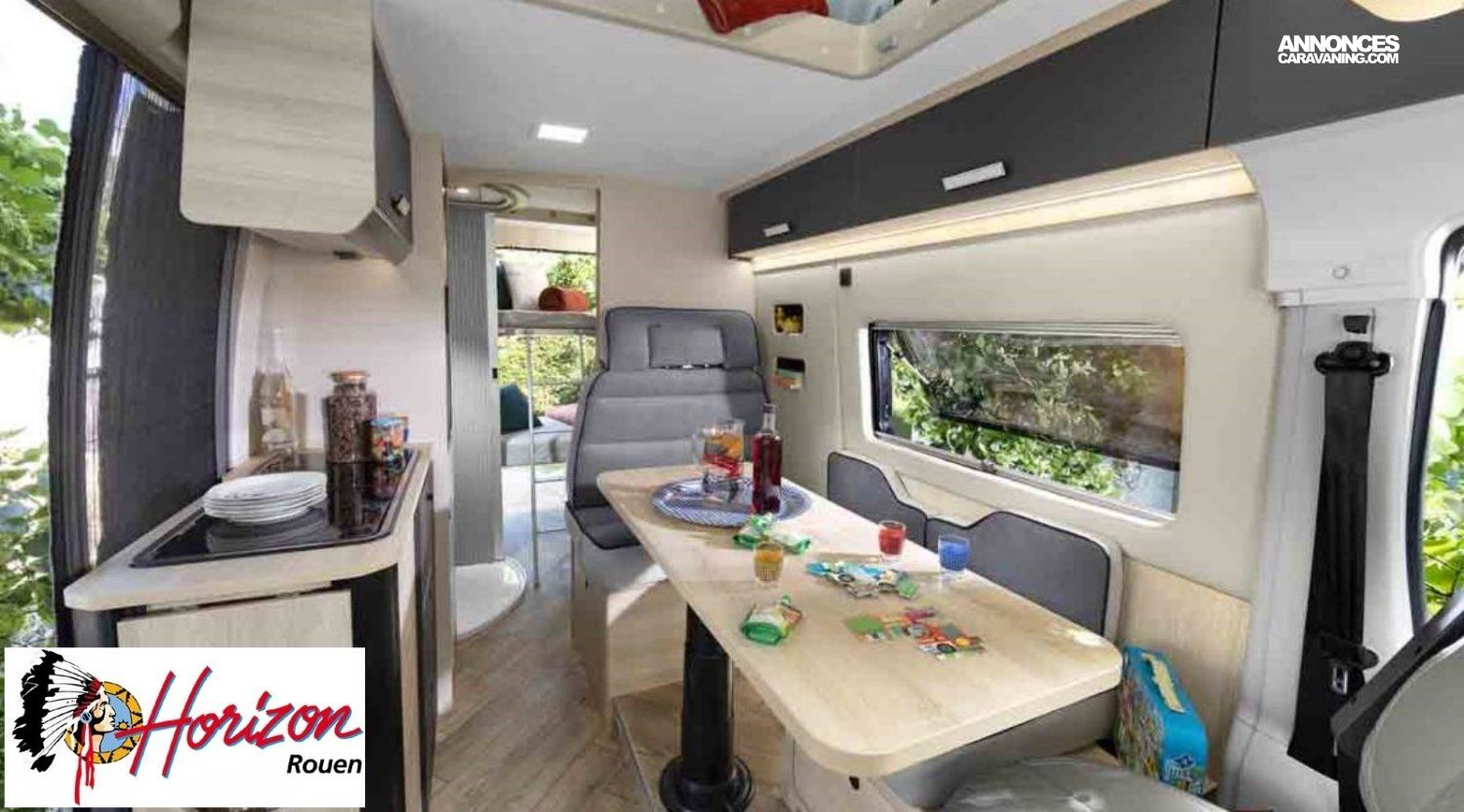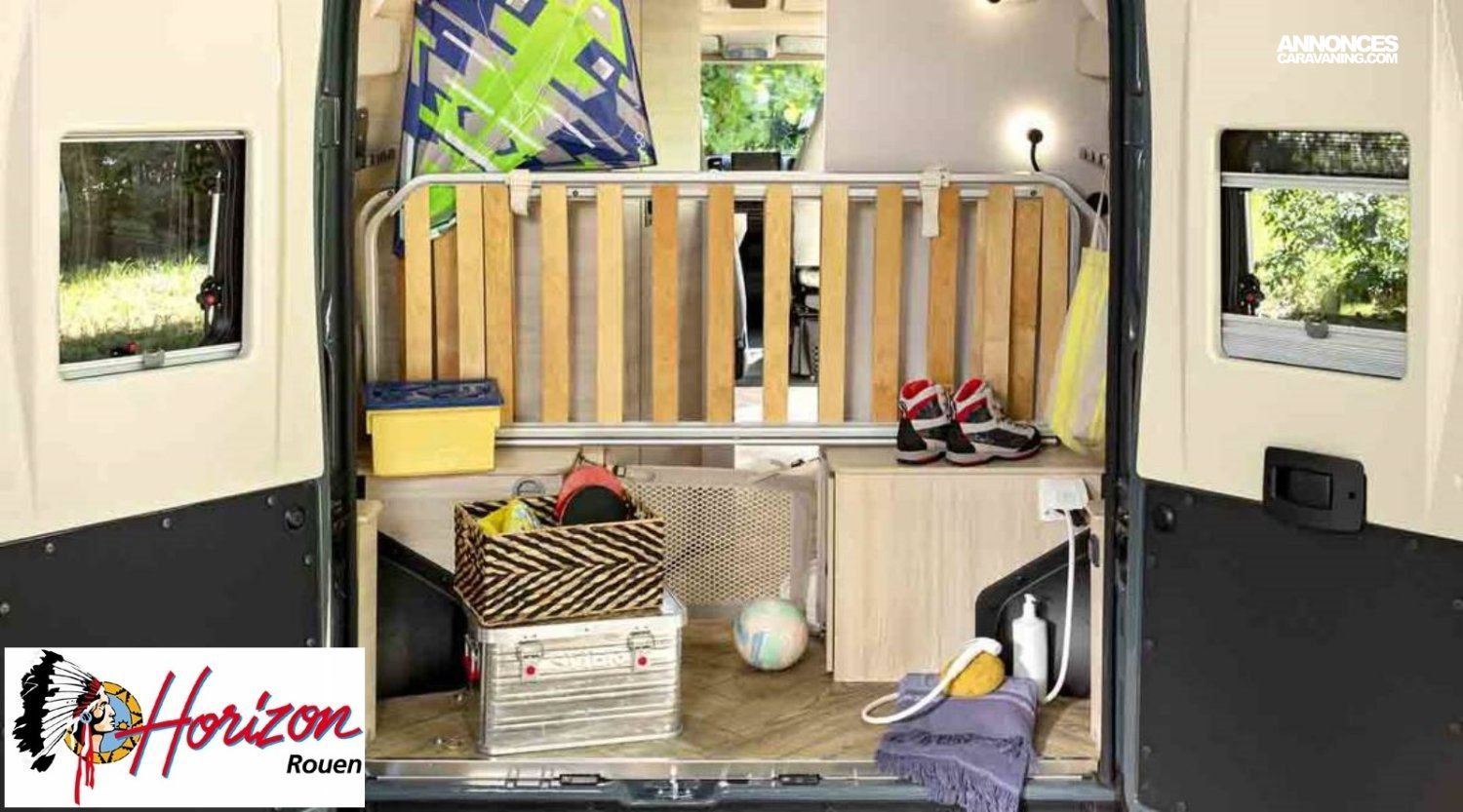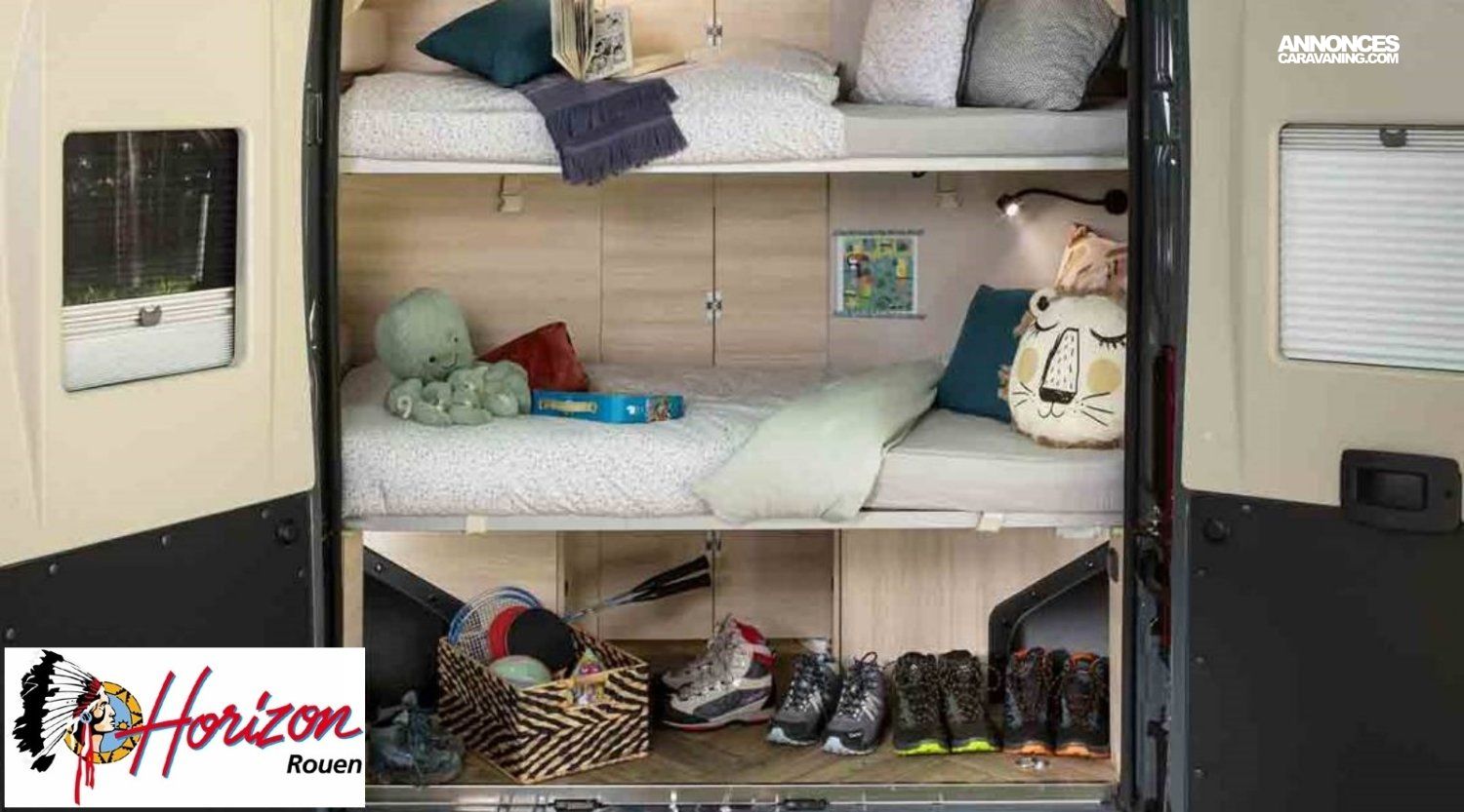 Ce modèle propose une configuration 5 places carte grise et 5 couchages. Il dispose de lits superposés à l’arrière, d’un lit de pavillon à l’avant et d’un toit relevable offrant un espace supplémentaire. L’arrière peut être transformé en garage spacieux pour transporter du matériel volumineux tel que vélos, skis ou planches de surf, en retirant les lits superposés.