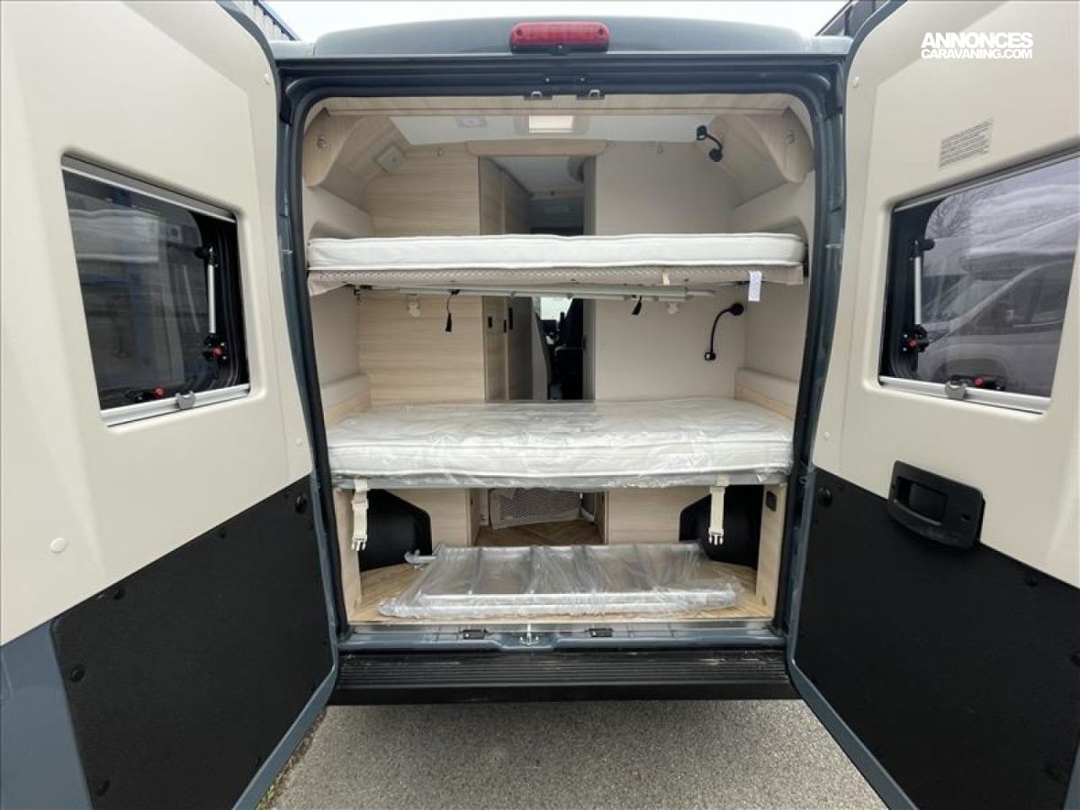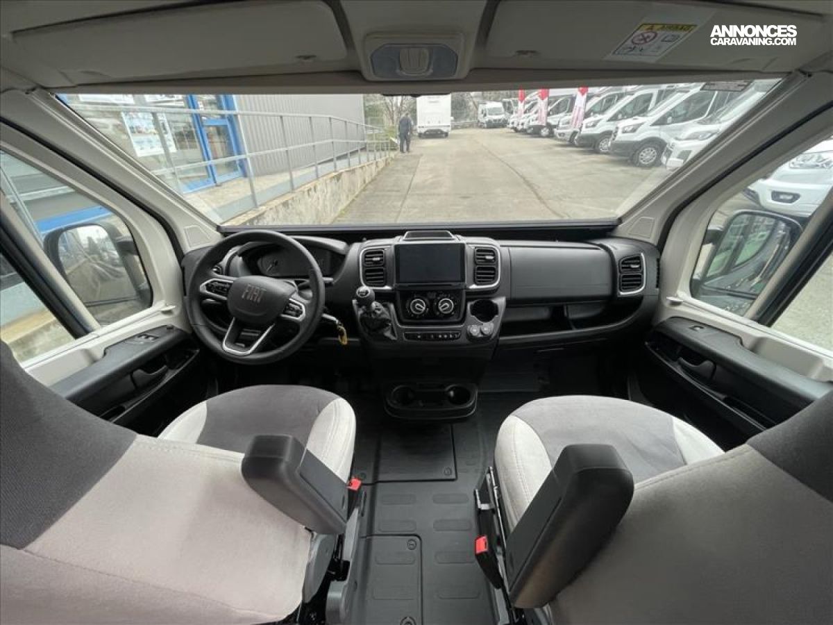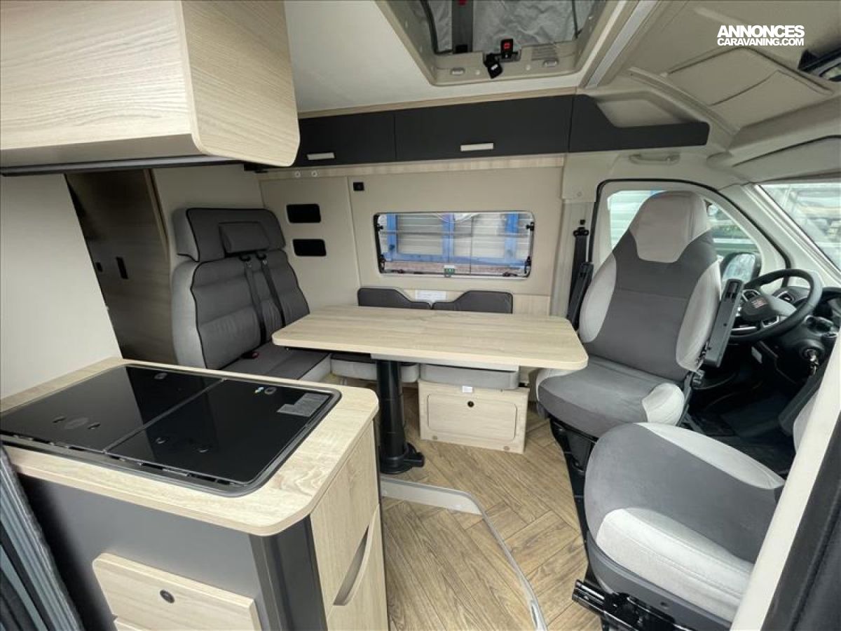 Gris Lanzarote, Climatisation manuelle de cabine, Sièges de cabine pivotants réglables en hauteur avec double, Housses de siège cabine assorties à l’ambiance cellule, TOIT RELEVABLE POP UP, Rétroviseurs électriques dégivrants, Régulateur / limiteur de vitesse, Traction +, Hill Descent control, Eco pack FIAT : Stop&Start, alternateur intelligent, pompe à, Fenêtres double-vitrage avec combiné stores moustiquaire, Prises USB/USB-C, Pare-chocs avant peint, Jantes alliage 16’’ noires, Feux antibrouillard, Pré-équipement TV, Chauffage sur carburant utilisable en roulant, Baies arrières ouvrantes, Extension table dinette, Marchepied électrique, Isolation renforcée "VPS", Pack look :, - Volant en cuir, bouches d'aération chromées+ JA16 pouces, Chauffe eau GAZ