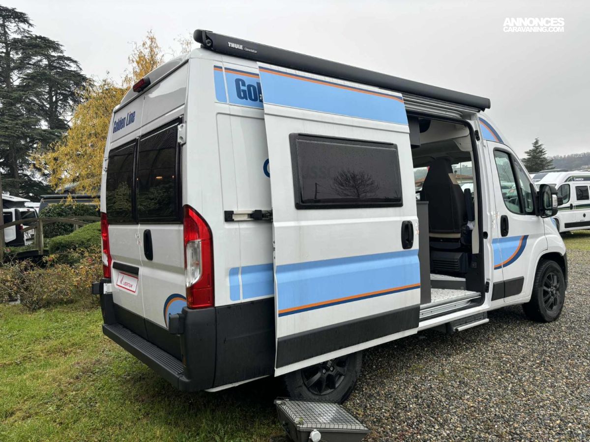le van ultra-compact Golden Line (5,41 m) s’adapte à tous vos besoins. Ne ressemblant à aucun autre, il se démarque par ses 8 combinaisons possibles, sa praticité et ses couleurs intérieures et extérieures.