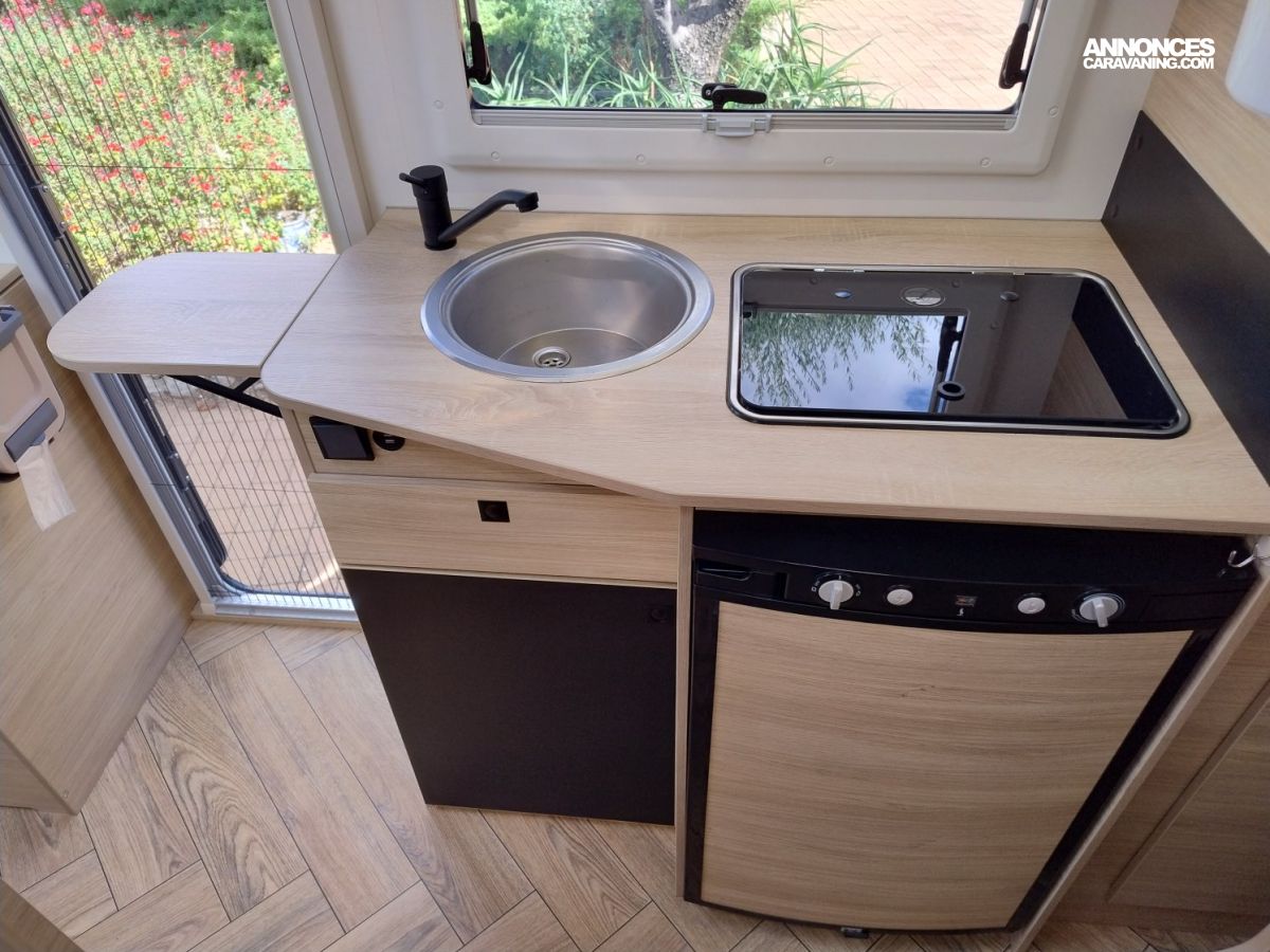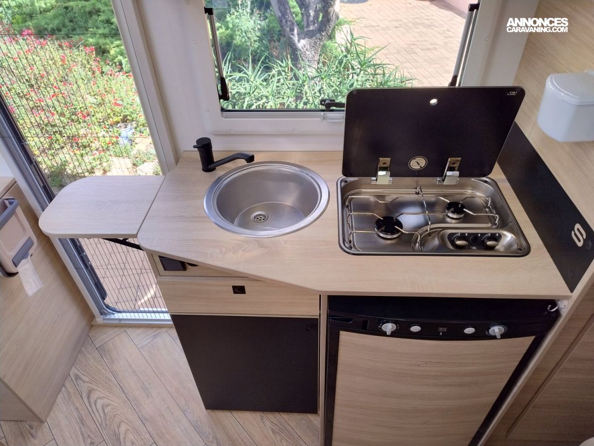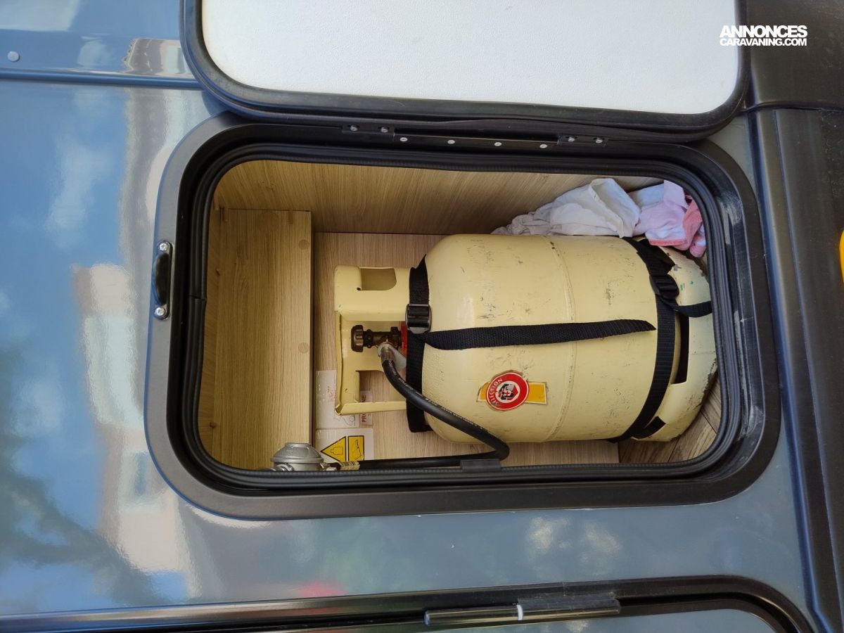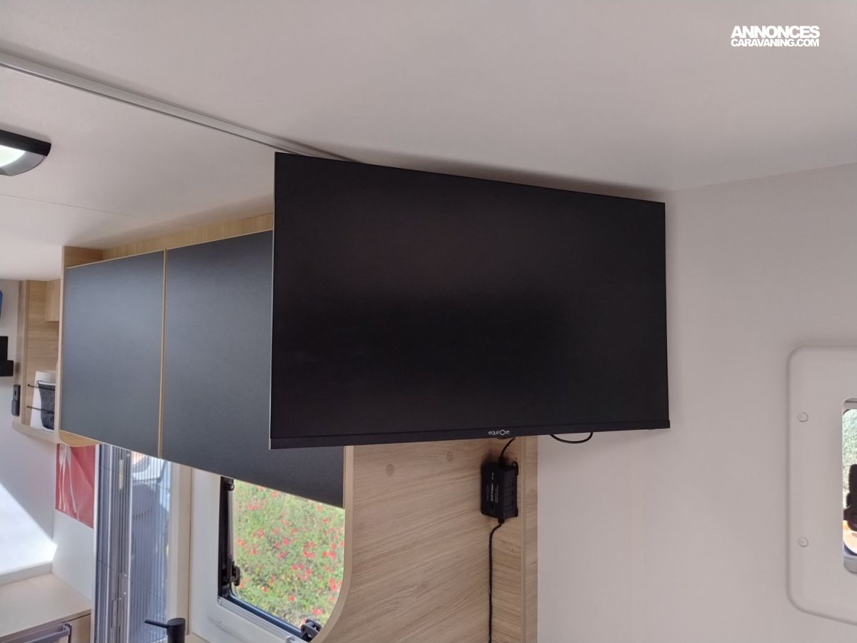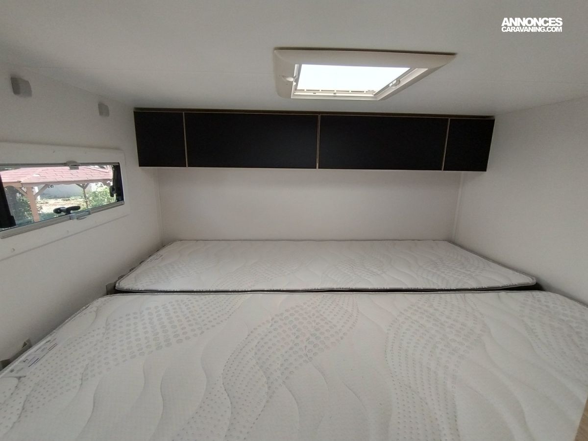 CHAUFFAGE CARBURANT, STORE EXTERIEUR 3M, GAZINIERE 2 FEUX, DOUCHE ET WC SEPARES, ECLAIRAGE LED, MOUSTIQUAIRE DE PORTE CELLULE, PORTE VELO, RALLONGE DE TABLE, REFRIGERATEUR TRI MIX, STORES PLISSES DE CABINE, LANTERNEAU PANORAMIQUE
