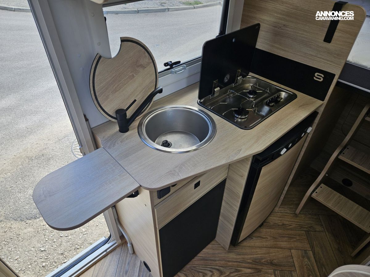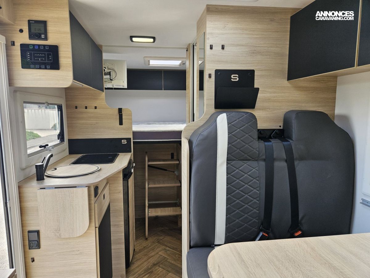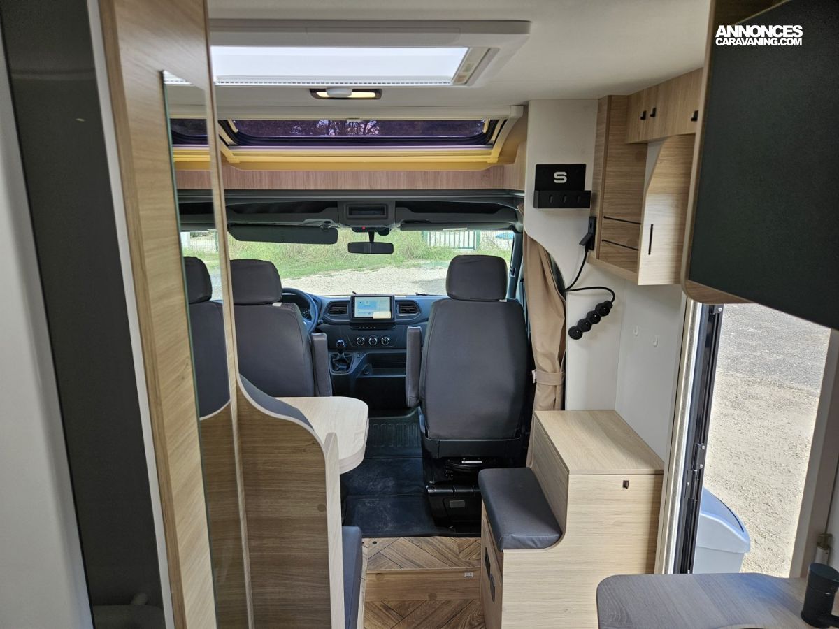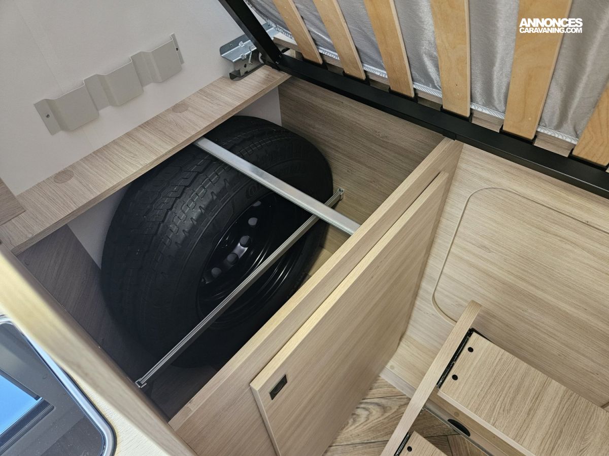 L'intérieur offre un salon Lumineux avec un Sunroof ouvrant, parfait pour partager des repas en famille ou entre amis. 4 Places assises avec ceintures, 4 Places repas et 3 Couchages sont disponibles grâce à un lit transversal sur soute (avec un sommier "Papillon") et un lit sur table astucieux.