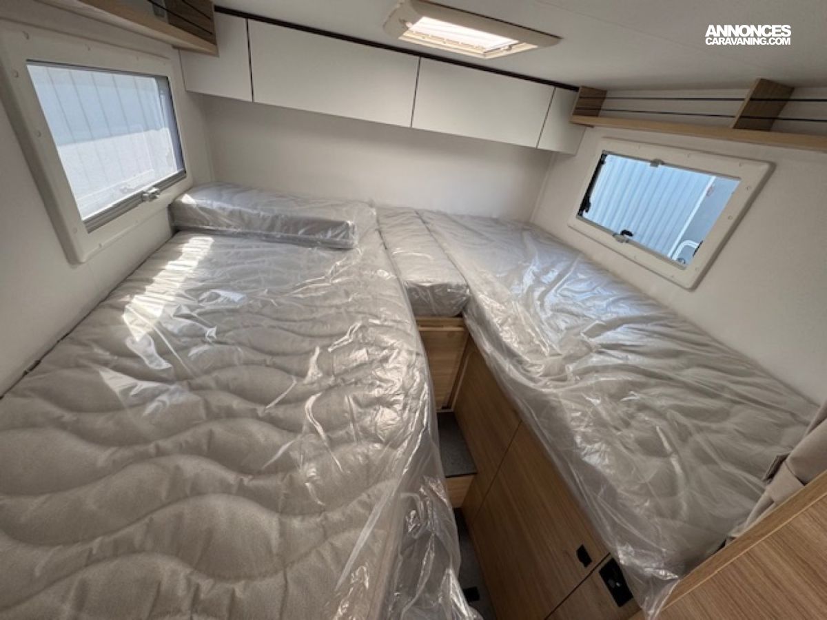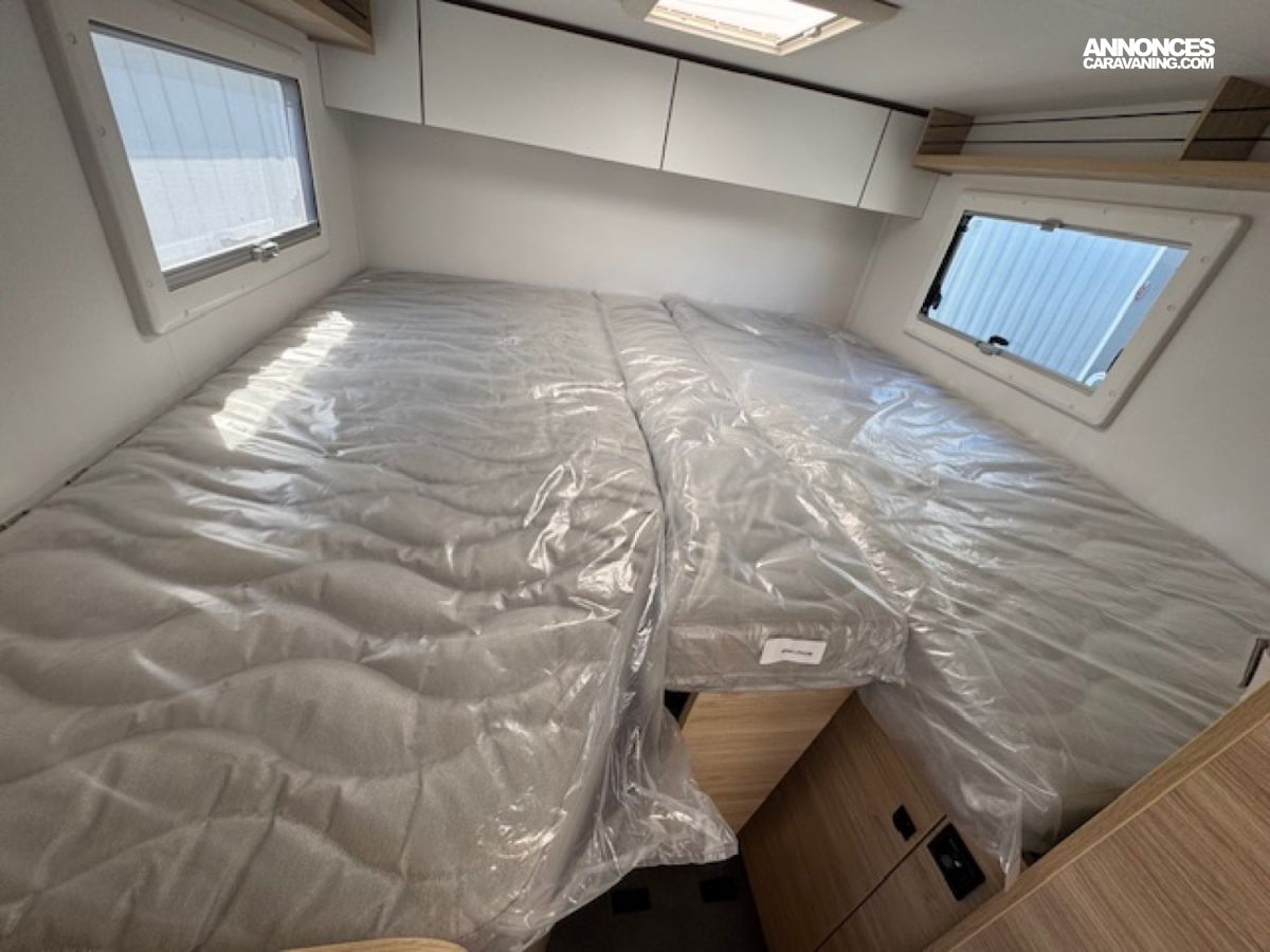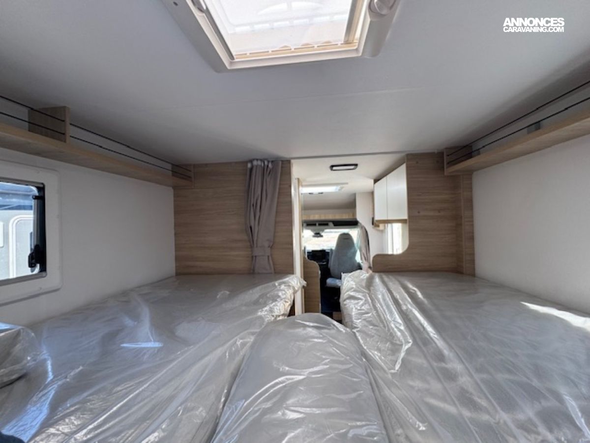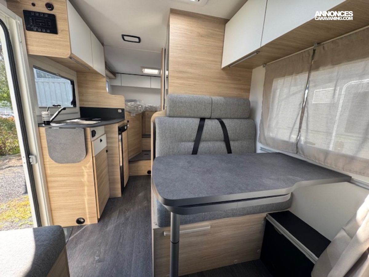 Il présente à l'arrière 2 places couchage (198x82) en lits jumeaux sur soute avec beaucoup de rangements et 1 place couchage dinette (185x90), une salle d'eau à cloison pivotante, un chauffage Diesel Truma 4000W performant et une cuisine toute équipée !! Et tout cela en - de 6,60 mètres de long.