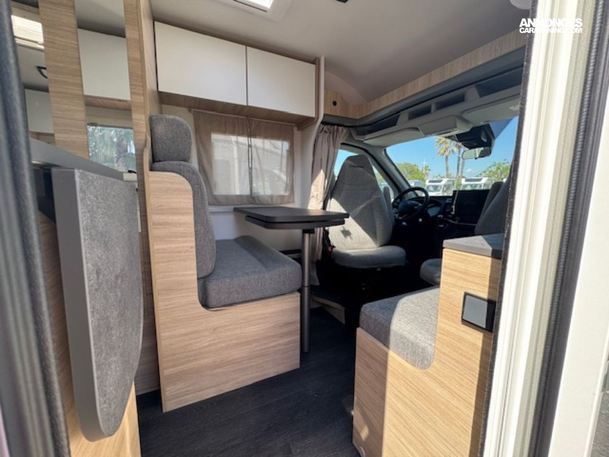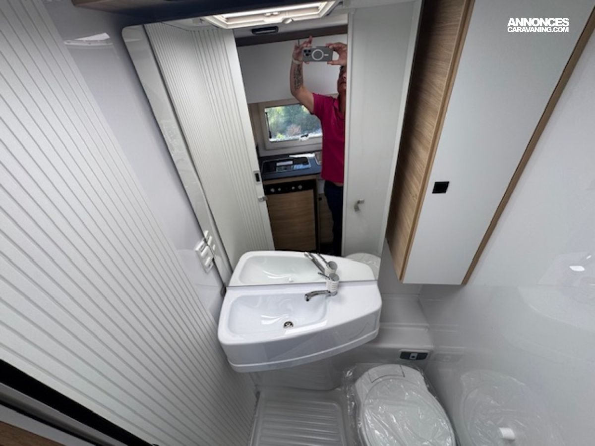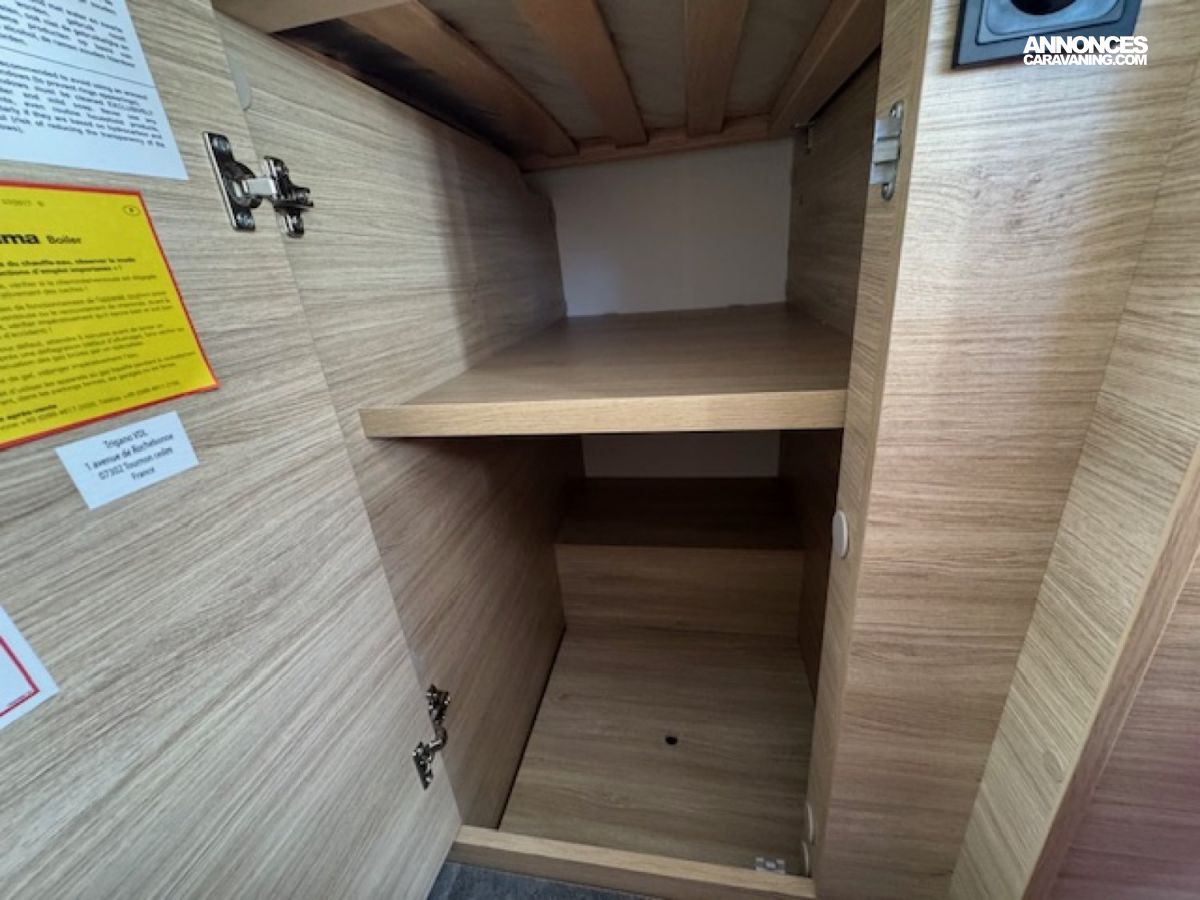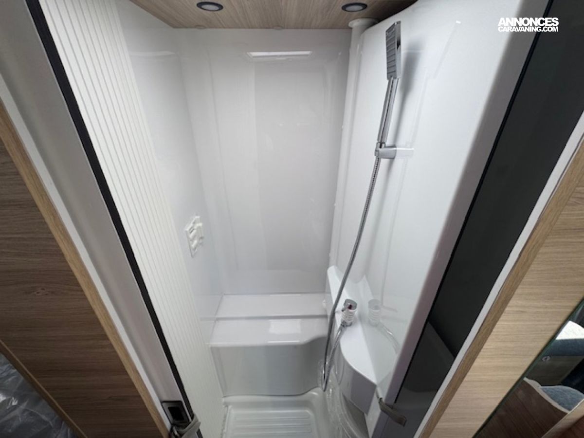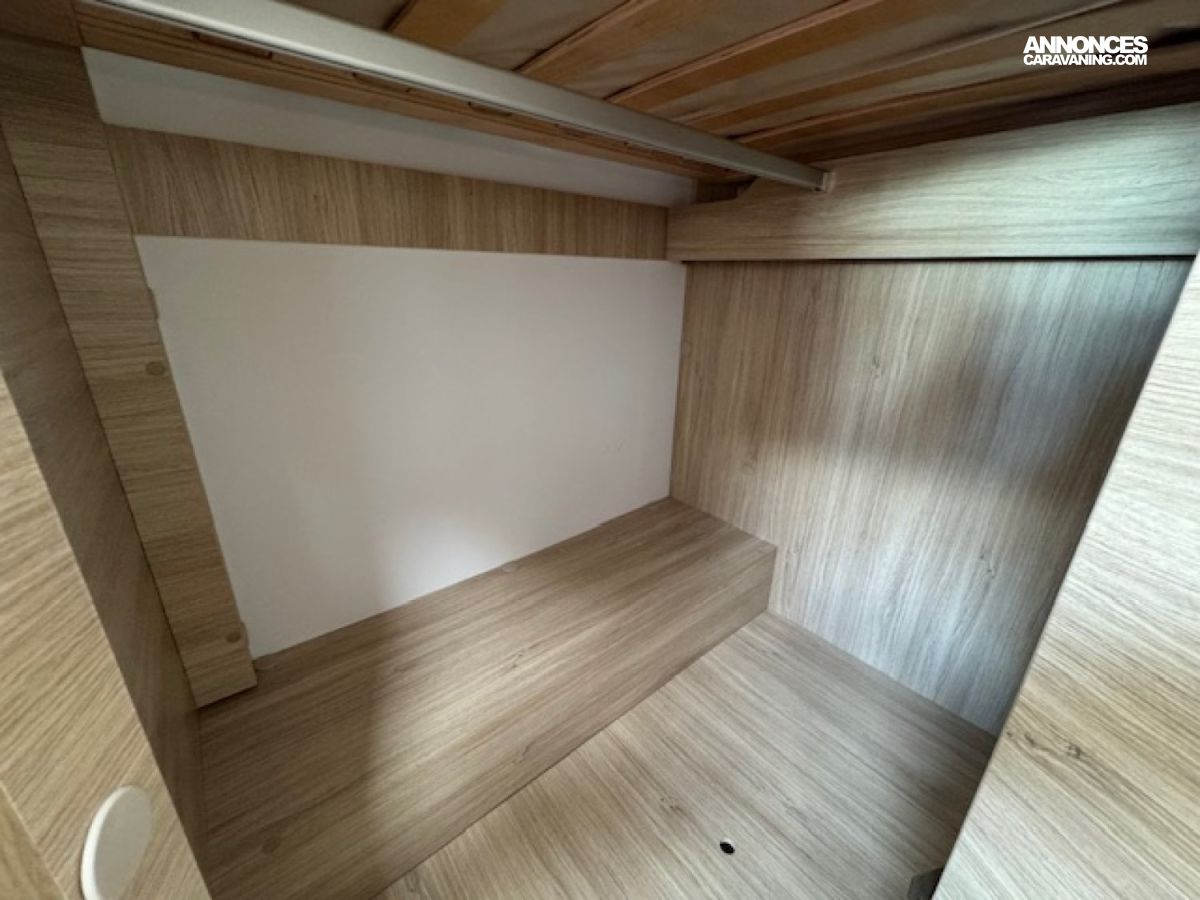 Il présente à l'arrière 2 places couchage (198x82) en lits jumeaux sur soute avec beaucoup de rangements et 1 place couchage dinette (185x90), une salle d'eau à cloison pivotante, un chauffage Diesel Truma 4000W performant et une cuisine toute équipée !! Et tout cela en - de 6,60 mètres de long.
