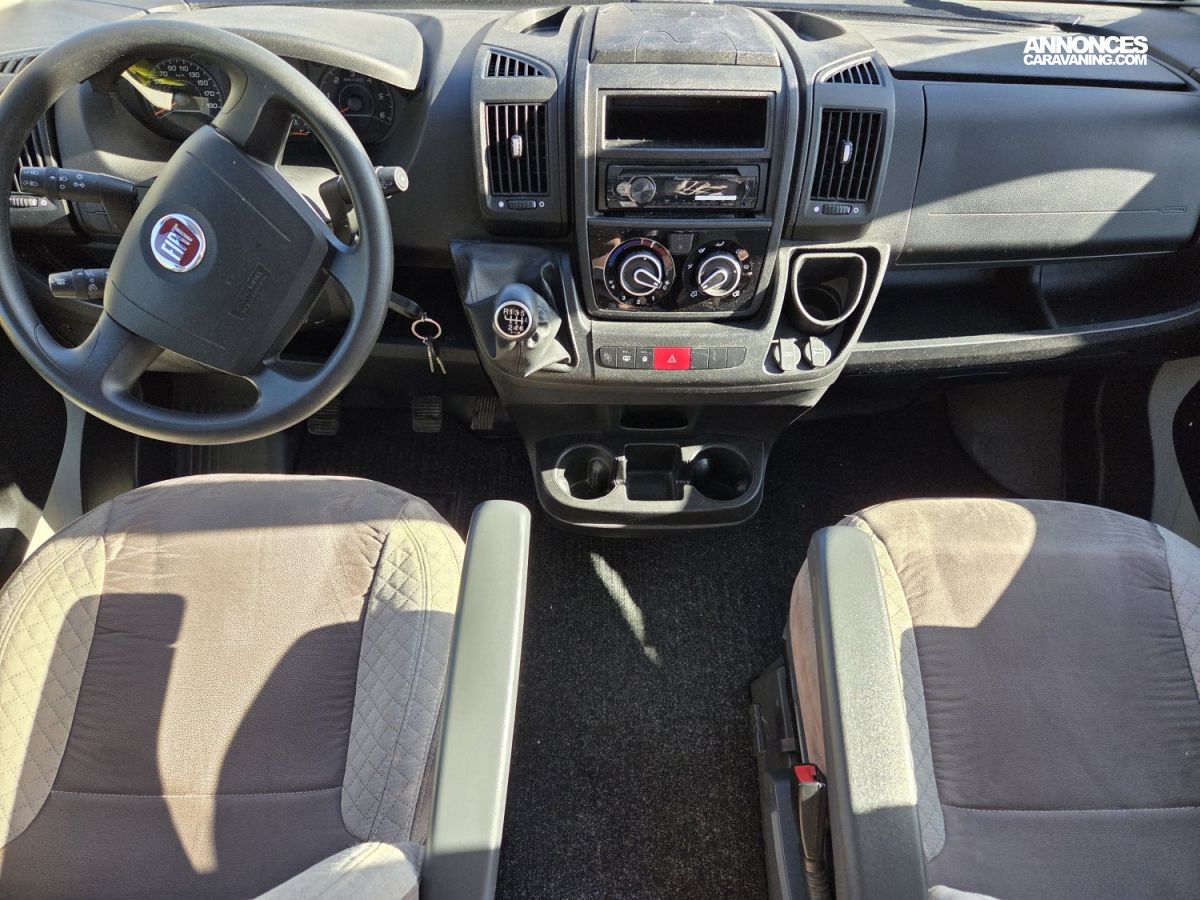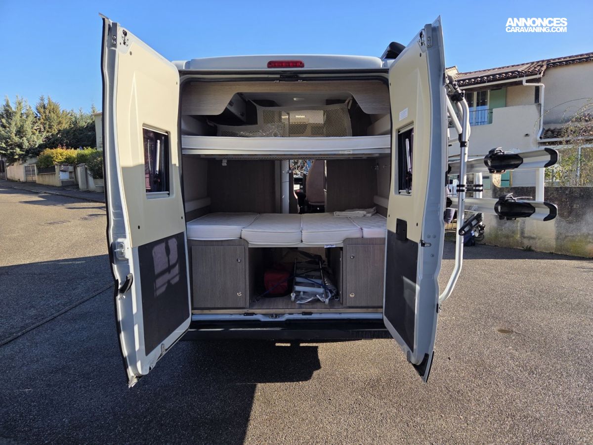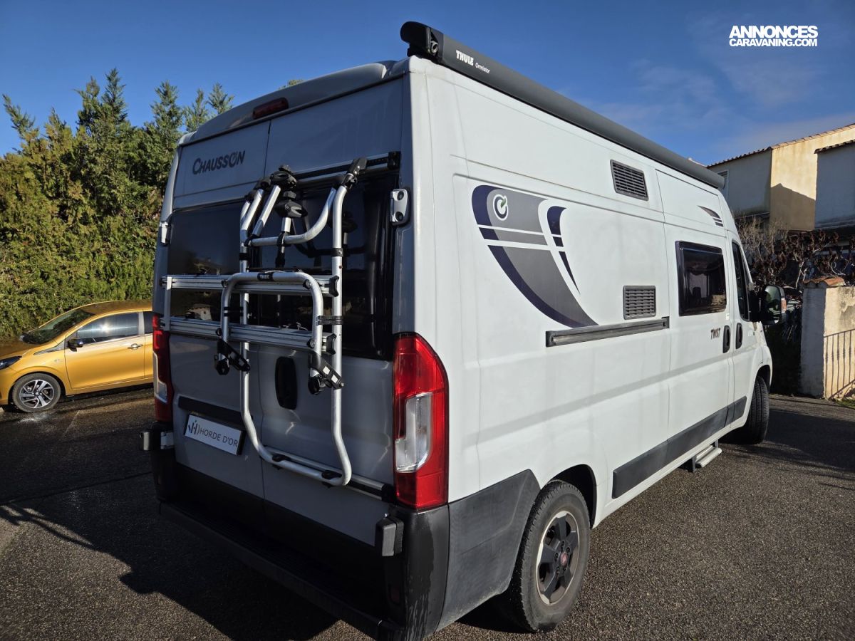Le Chausson Twist V594 Max de 2019, en première main, est un fourgon aménagé compact et polyvalent, idéal pour les escapades comme pour les voyages au long cours. Il est équipé d’un Fiat Ducato 2,3 L de 130 ch, reconnu pour sa fiabilité et son agrément de conduite. Son aménagement intelligent comprend un chauffage carburant, assurant un confort optimal en toute saison, ainsi que des lits superposés doubles, offrant un couchage confortable pour quatre personnes. Pratique, lumineux et facile à manœuvrer, ce modèle propose un excellent équilibre entre confort, autonomie et plaisir de voyager.